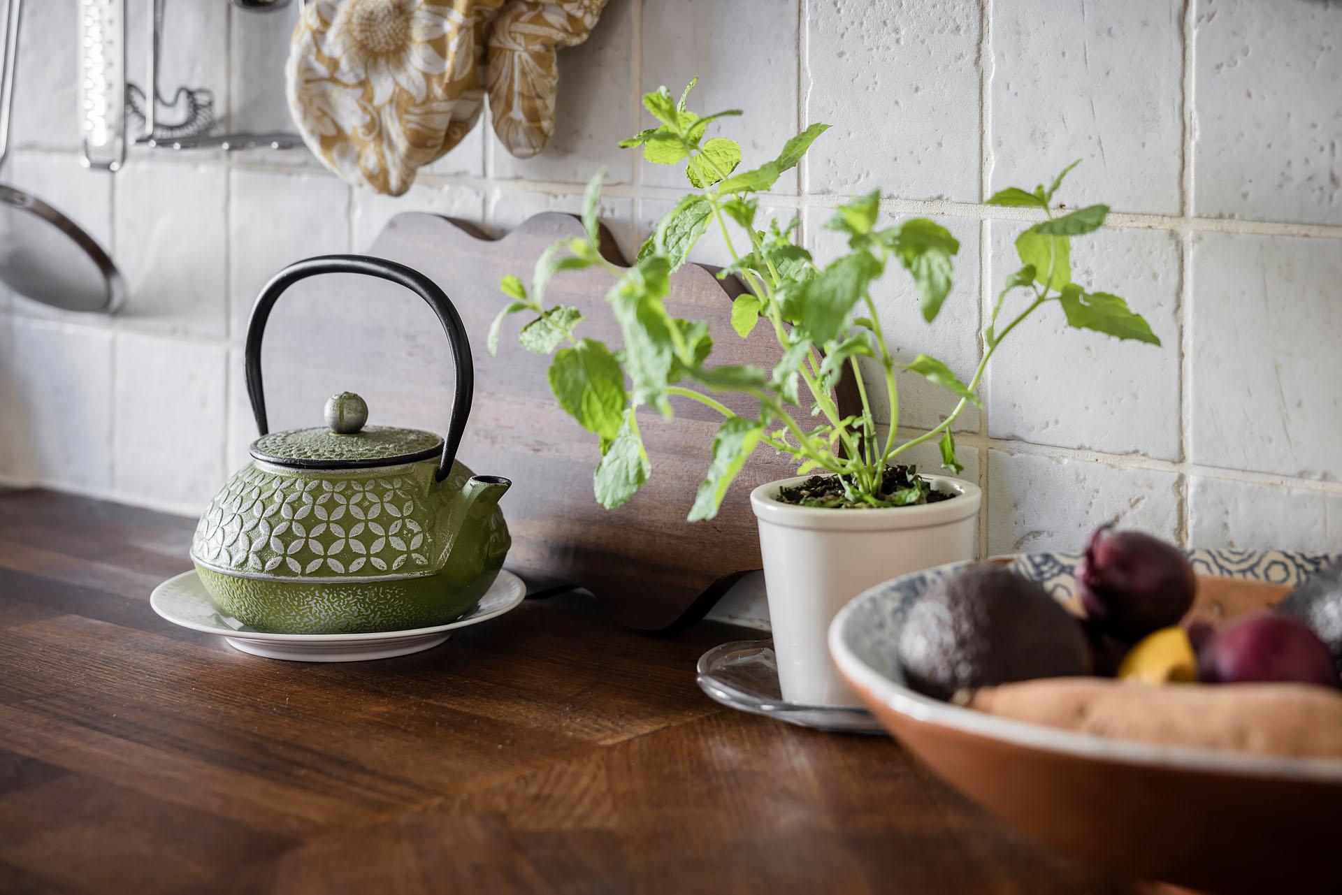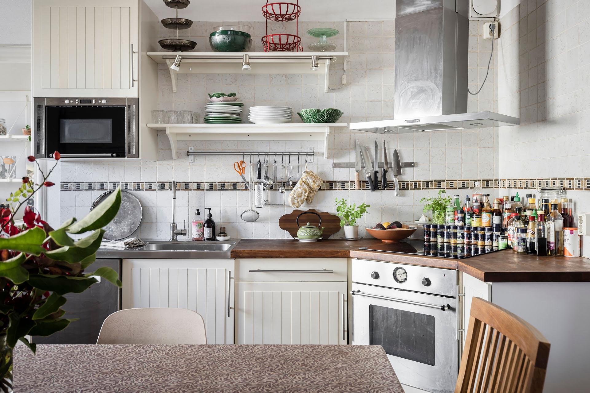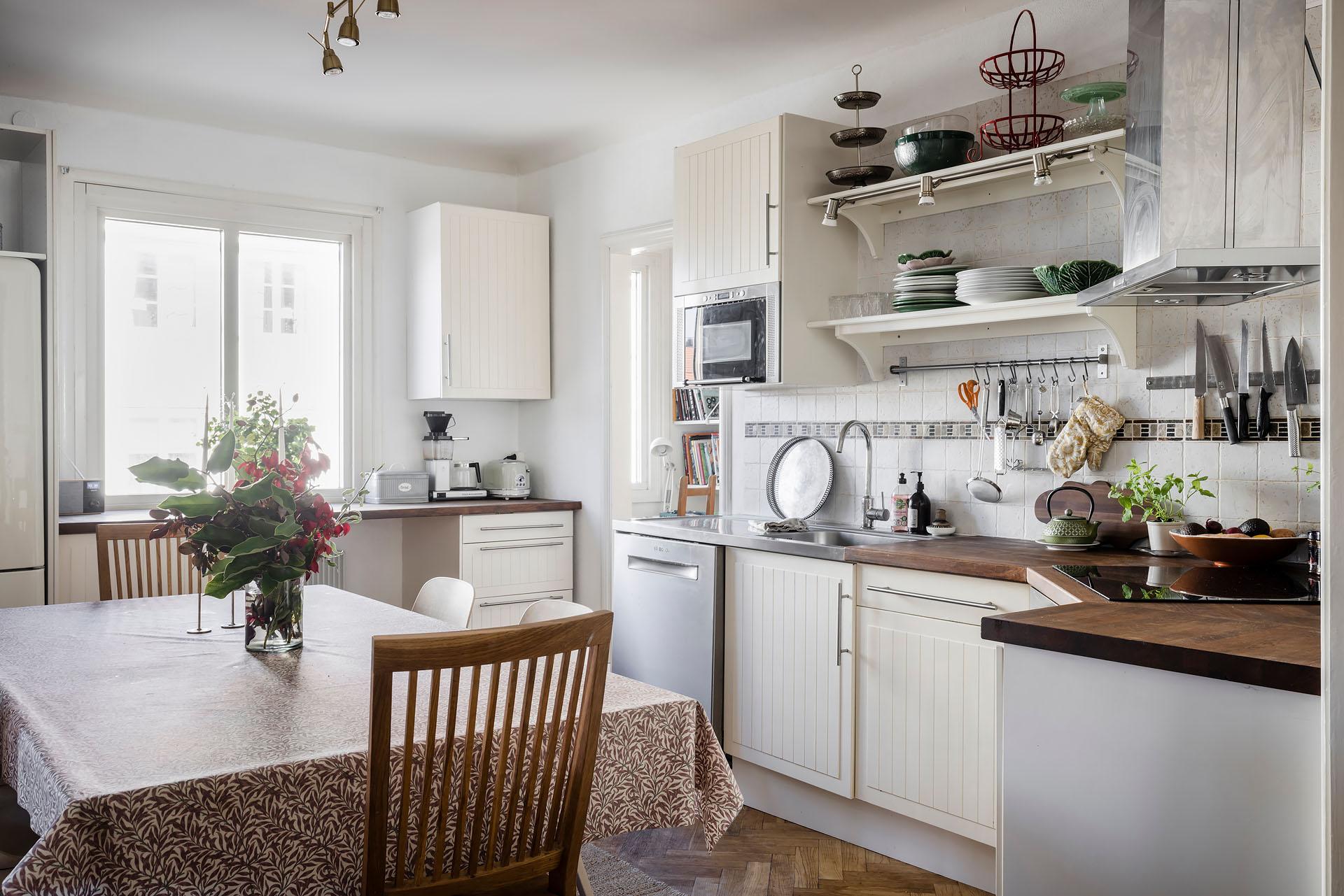 Köket bjuder in till både matlagning och umgänge, och det finns plats för att samla släkt och vänner för trevliga middagar. Det är väl tilltaget med både arbetsyta och förvaring, och skåpen kompletteras av öppna hyllplan som ger köket ett levande intryck. Skåpen har vita luckor och lådor, och bänkskivorna är i massiv ek. Ovanför diskbänken, arbetsbänkarna och den infällda induktionshällen letar sig ljust kakel nästan hela vägen upp till taket. Hällen har satts in i år, och kökets rymliga kylskåp är från 2023. Ny ugn kommer att installeras innan tillträdet. Övriga vitvaror – fläkt och diskmaskin – är av lite äldre men väl fungerande modeller. Väggarna är tapetserade med vit tapet, och fiskbensparkett löper tröskelfritt genom de breda öppningarna mot vardagsrummet och lägenhetens inre hall.