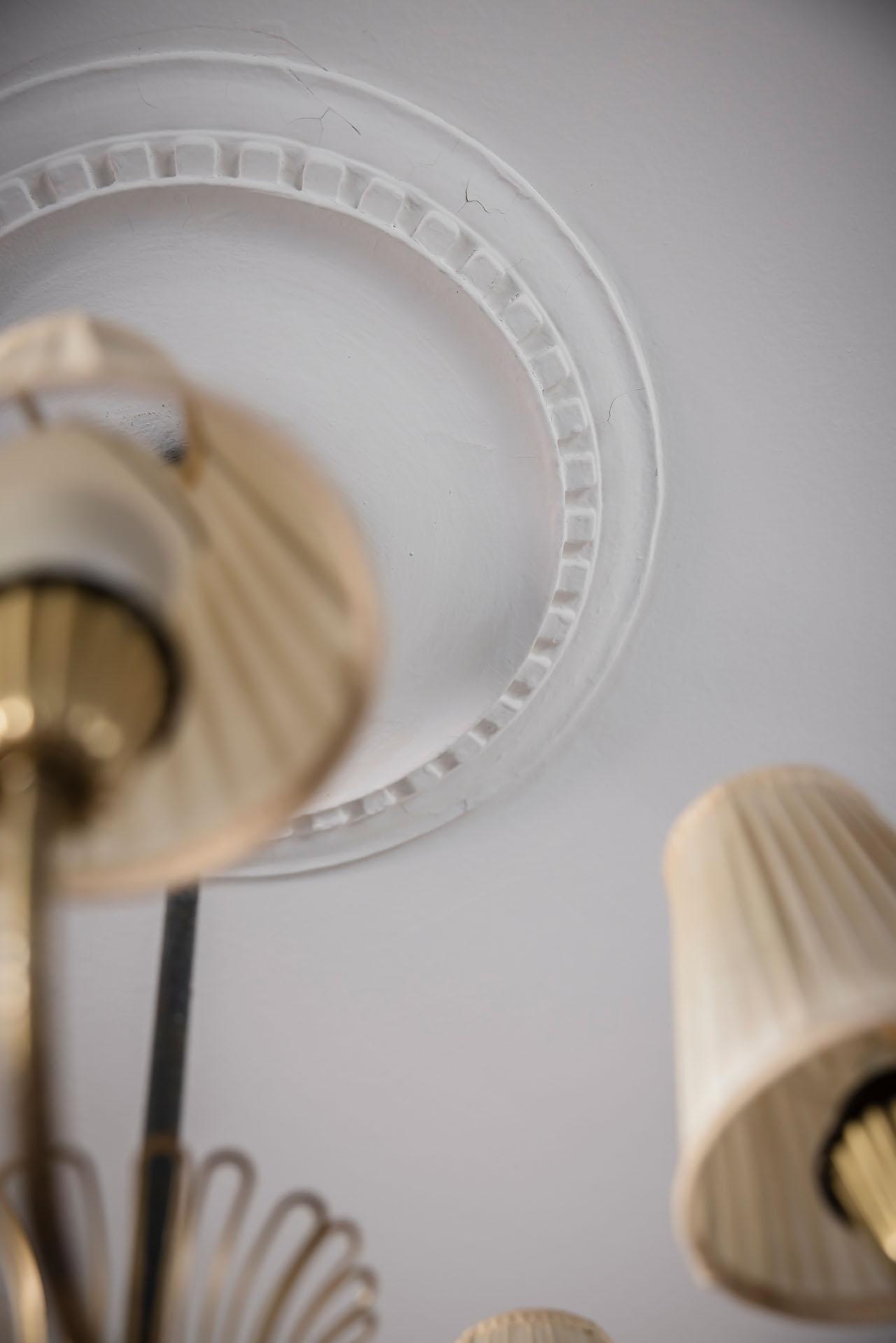 Den inre hallen kan som nämnts inredas som hemmabibliotek, och så härligt det är att sjunka ner i en mjuk läsfåtölj intill den öppna spisen. Golvet är belagt fiskbensparkett, och väggarna tapetserade med en ljus beige- och vitrandig tapet. Taket är besmyckat med takrosett.