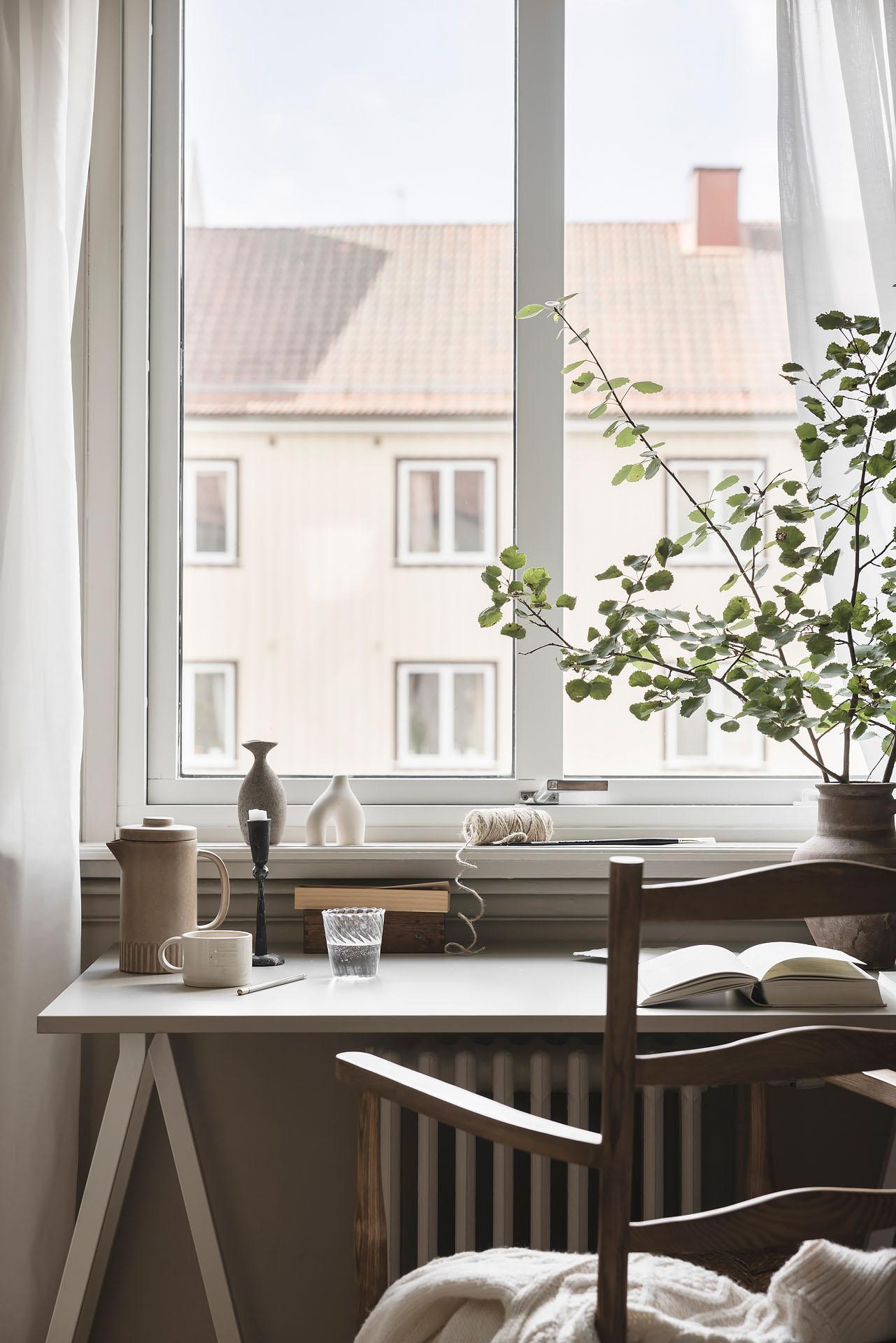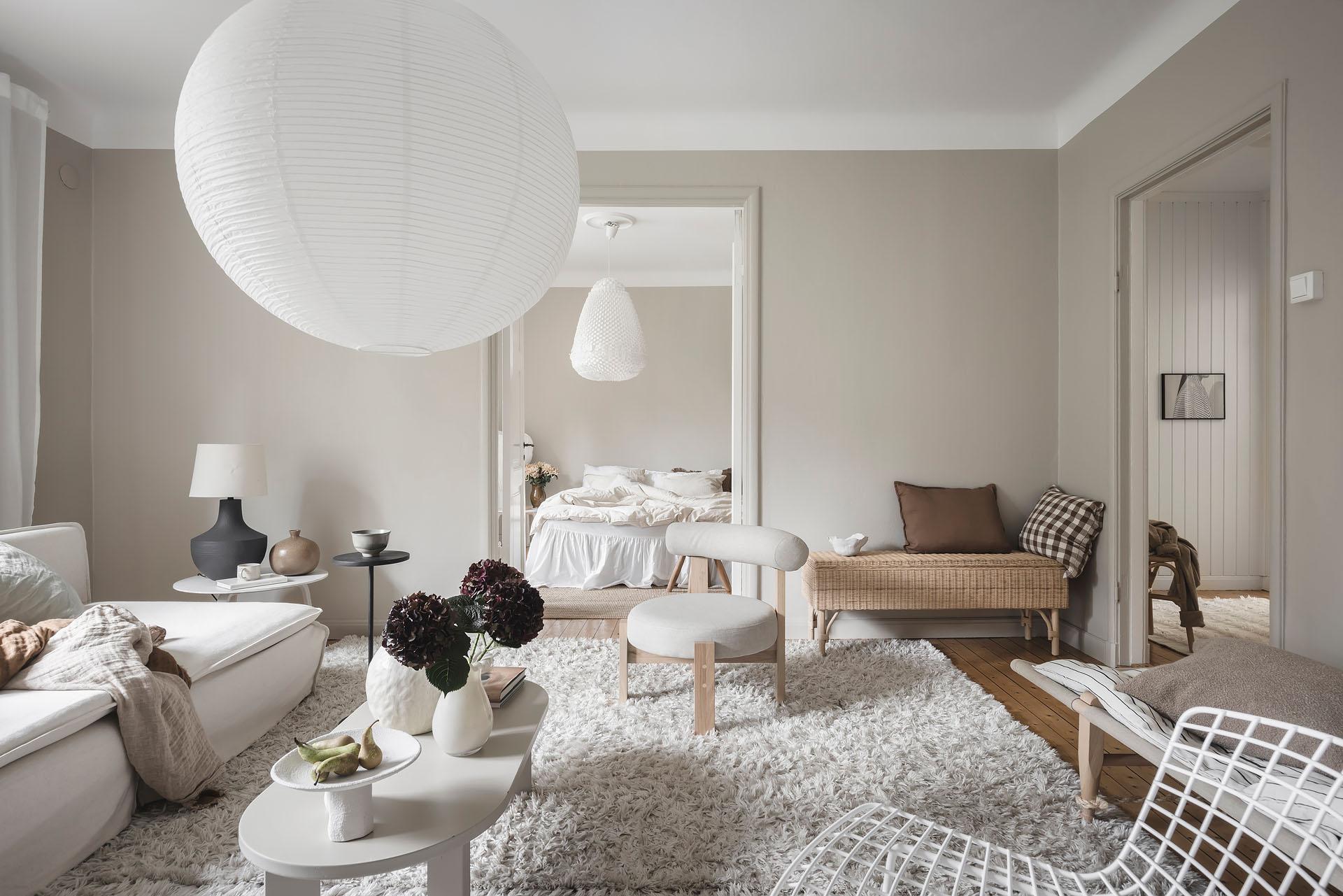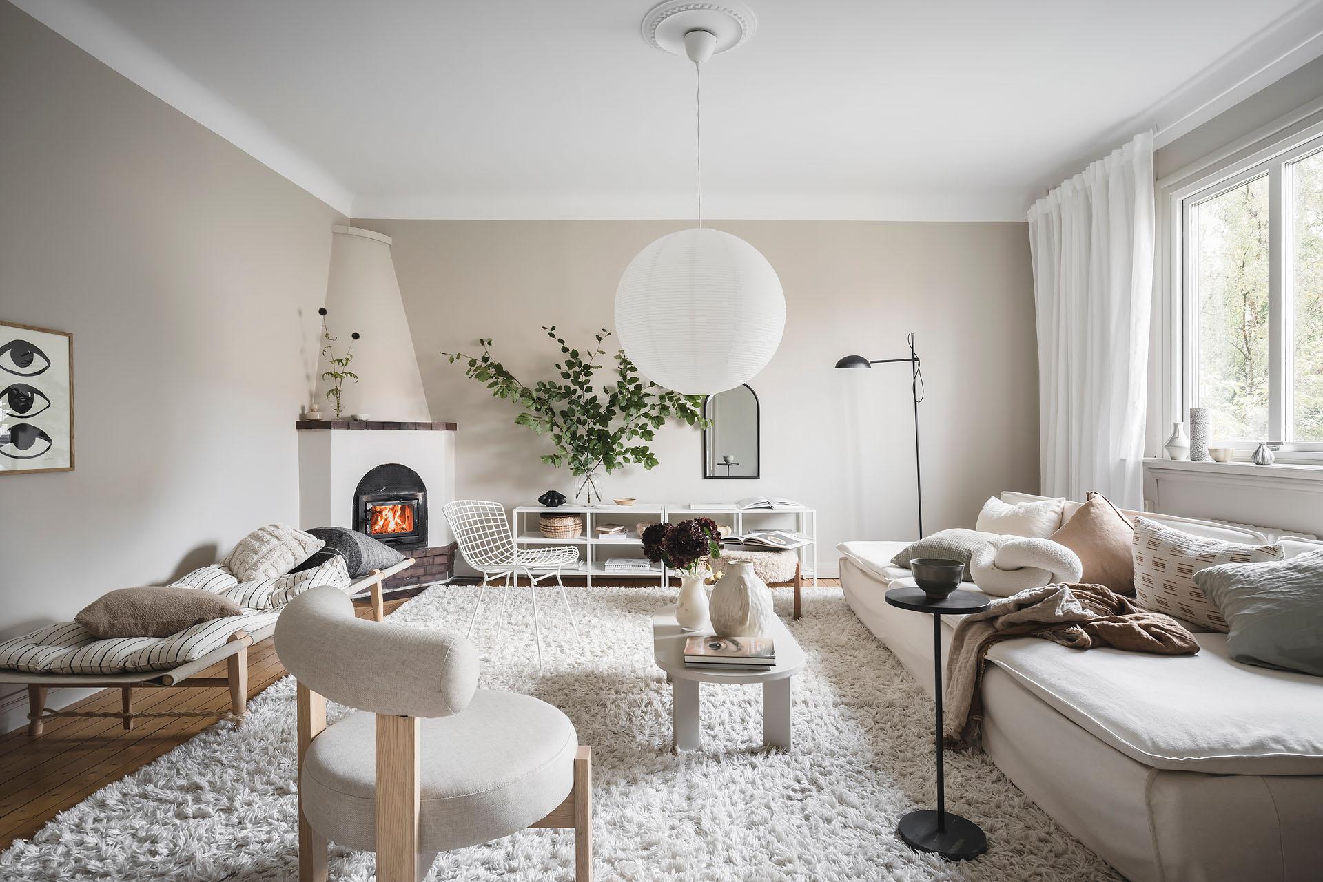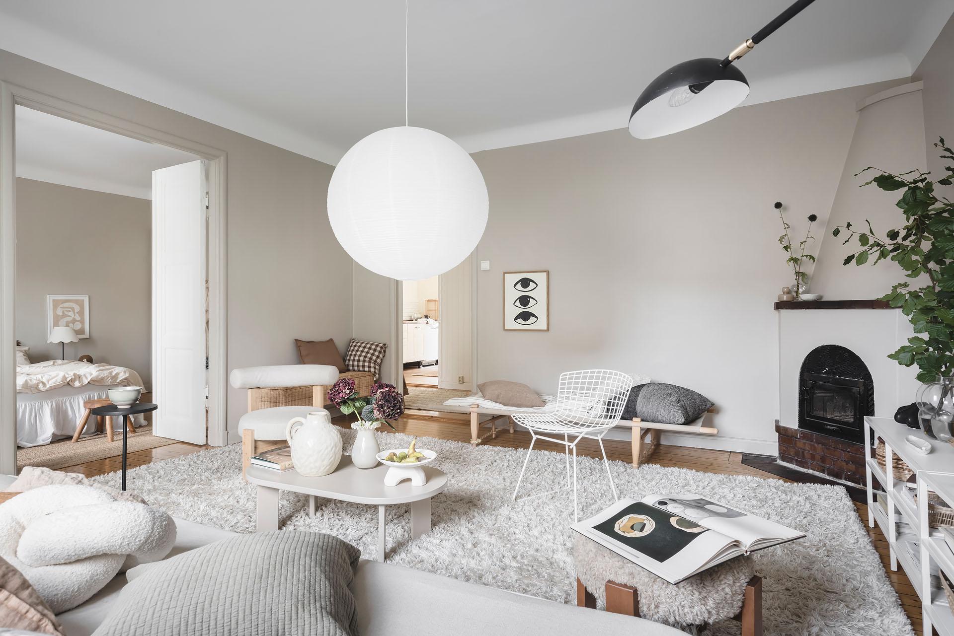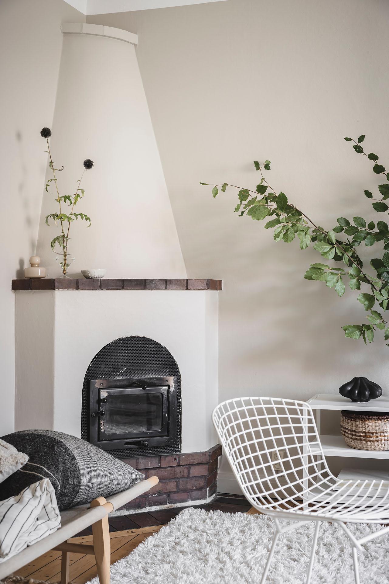 Ljust dagtid då fönstret inte skyms av höga byggnader och när mörkret väl lagt sig är det mysigt att elda i den öppna spisen som ståtar i ett av hörnen. Det är ett kvadratiskt och lättmöblerat rum med gott om plats för både soffgrupp, tv-bänk och en stor bokhylla. Brädgolvet är framtaget och väggarna målade i Jotuns varma gråbeige kulör ”Sand”.