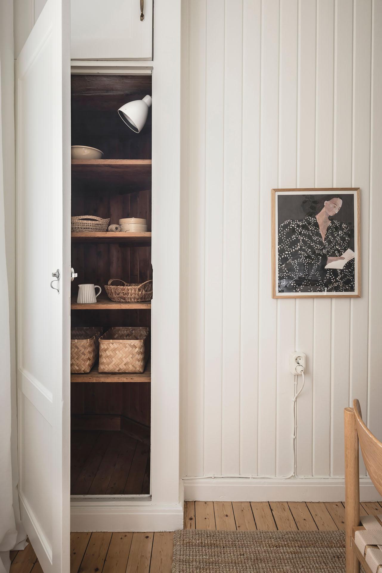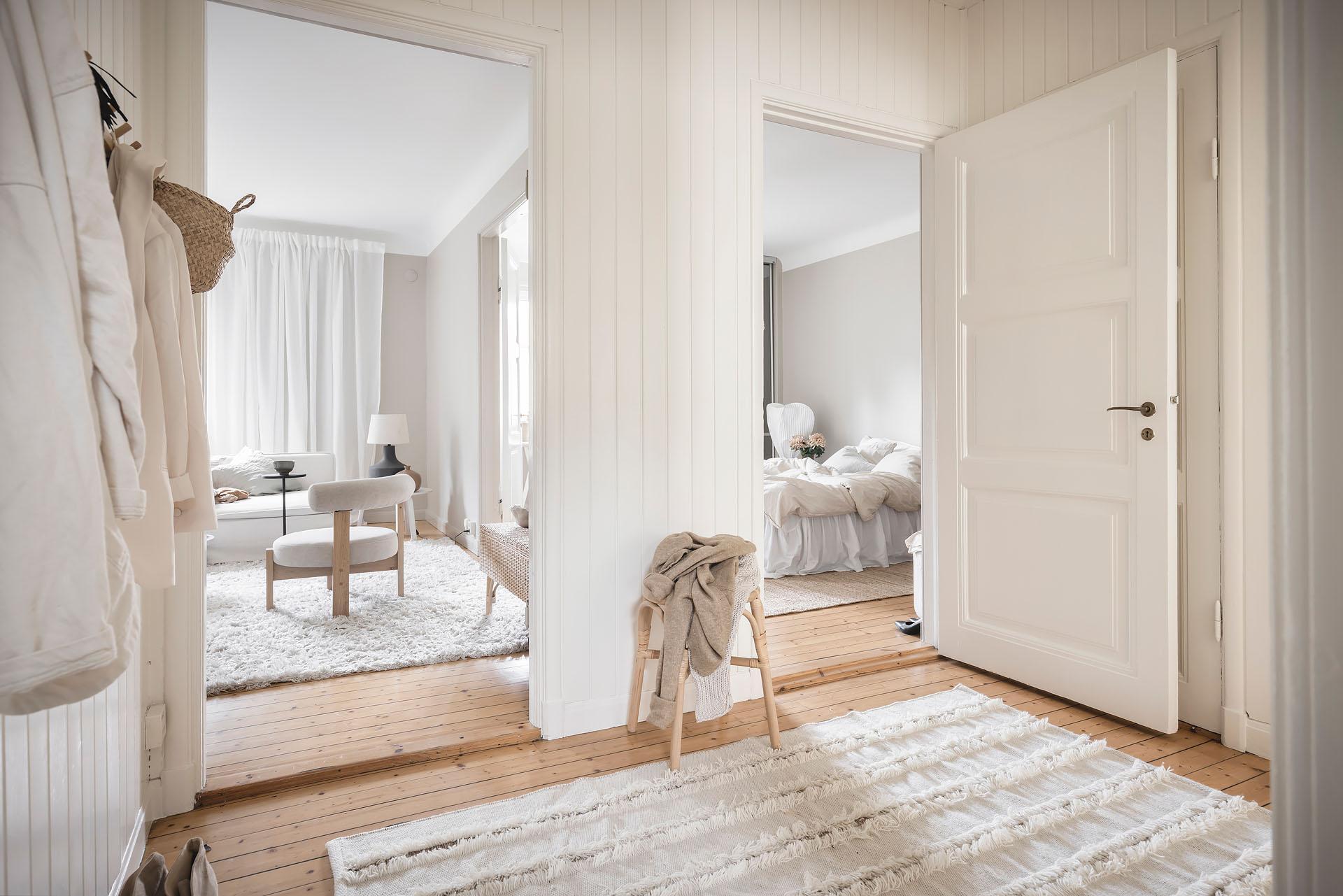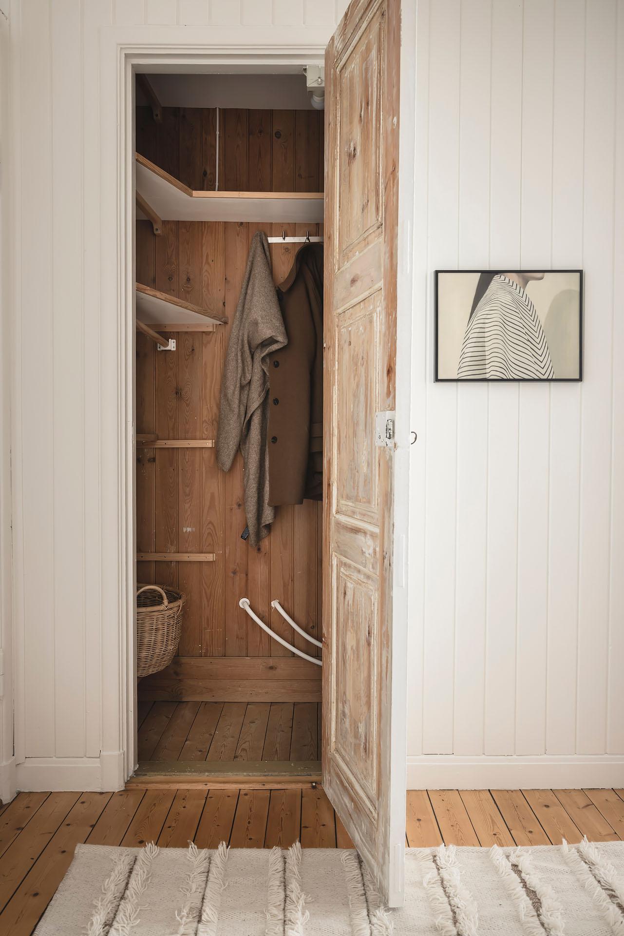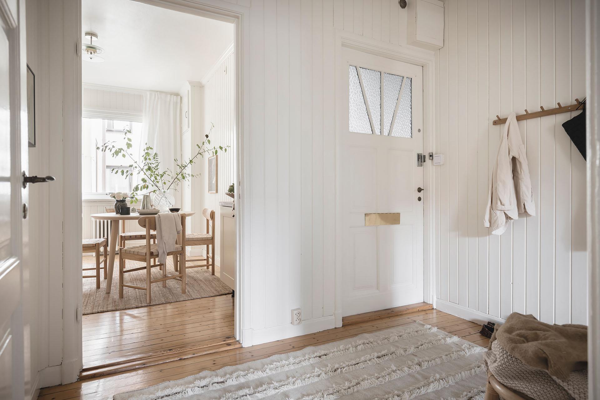 Hallen är lägenhetens nav, och dagsljuset flödar genom dörröppningarna till vardagsrummet, sovrummet och köket. Det finns gott om plats för jackavhängning, och bra förvaringsmöjligheter erbjuds i form av en klädkammare. Brädgolvet är framtaget, och liksom i köket är väggarna klädda med vitmålad originalspont.