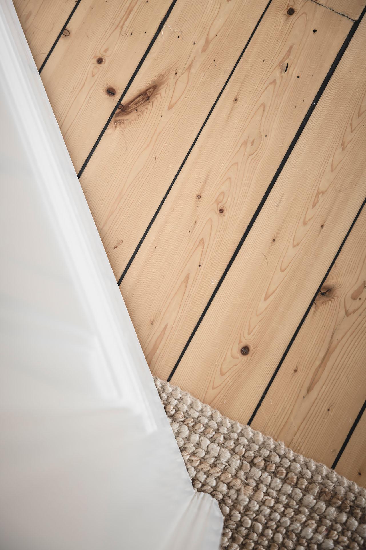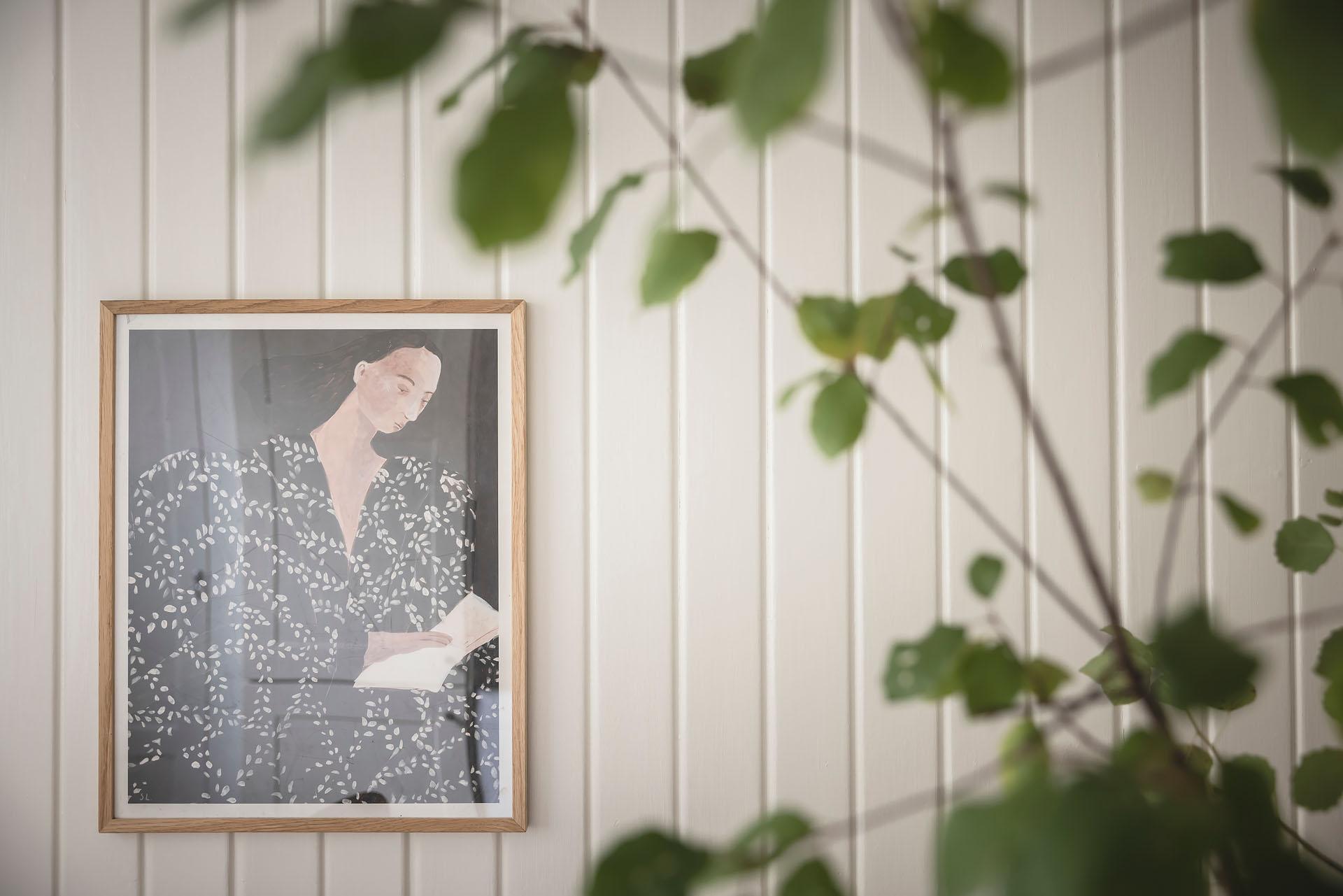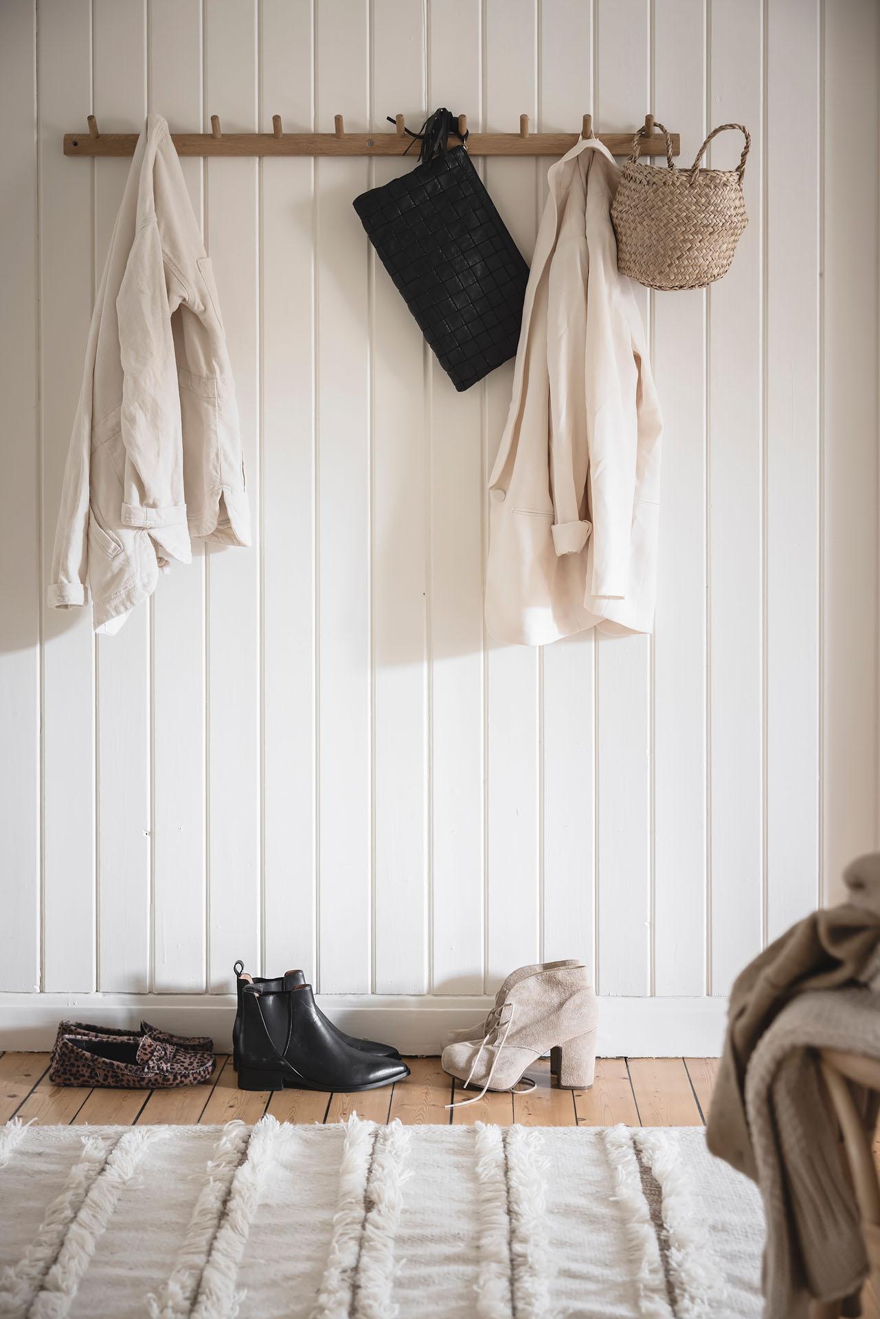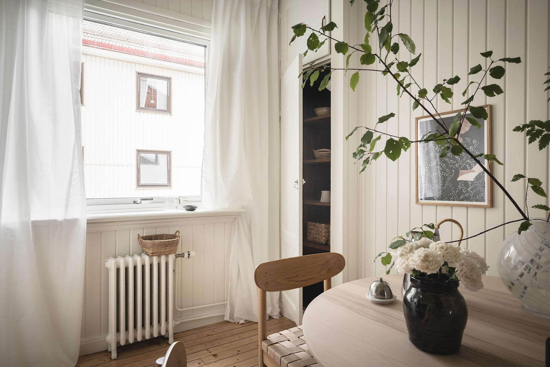 Hallen är lägenhetens nav, och dagsljuset flödar genom dörröppningarna till vardagsrummet, sovrummet och köket. Det finns gott om plats för jackavhängning, och bra förvaringsmöjligheter erbjuds i form av en klädkammare. Brädgolvet är framtaget, och liksom i köket är väggarna klädda med vitmålad originalspont.