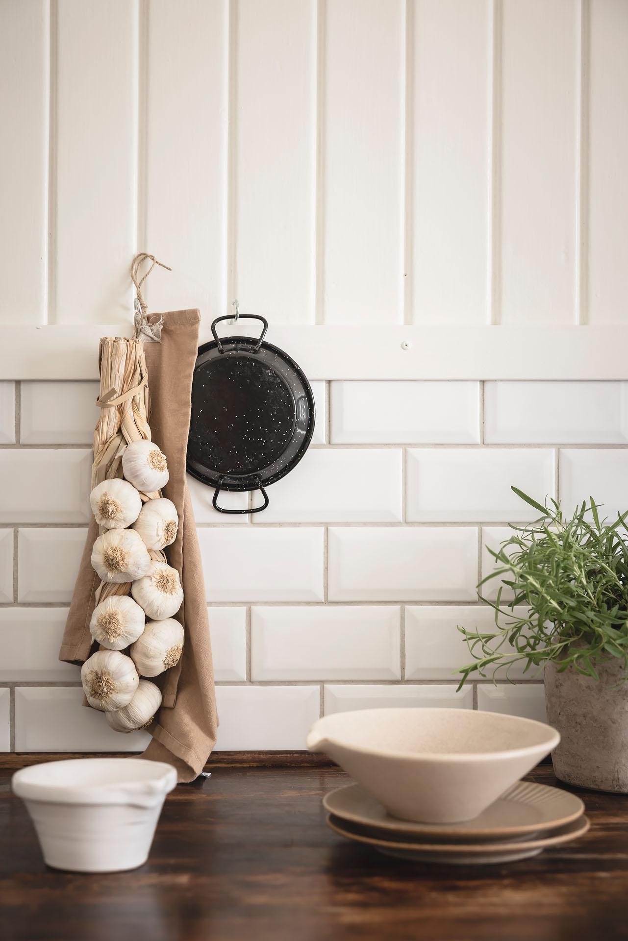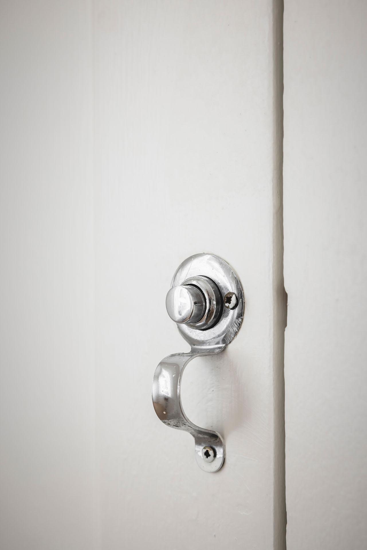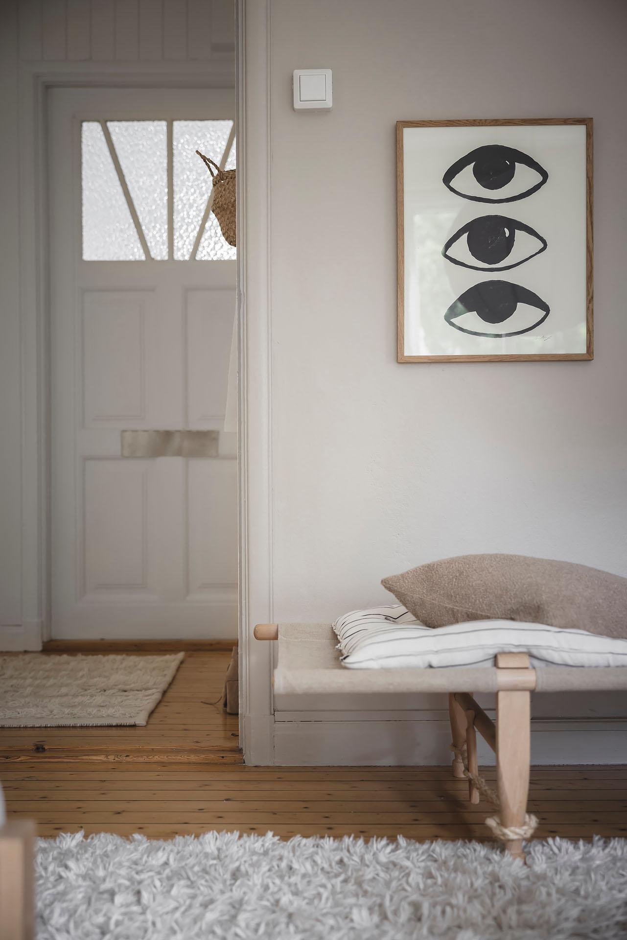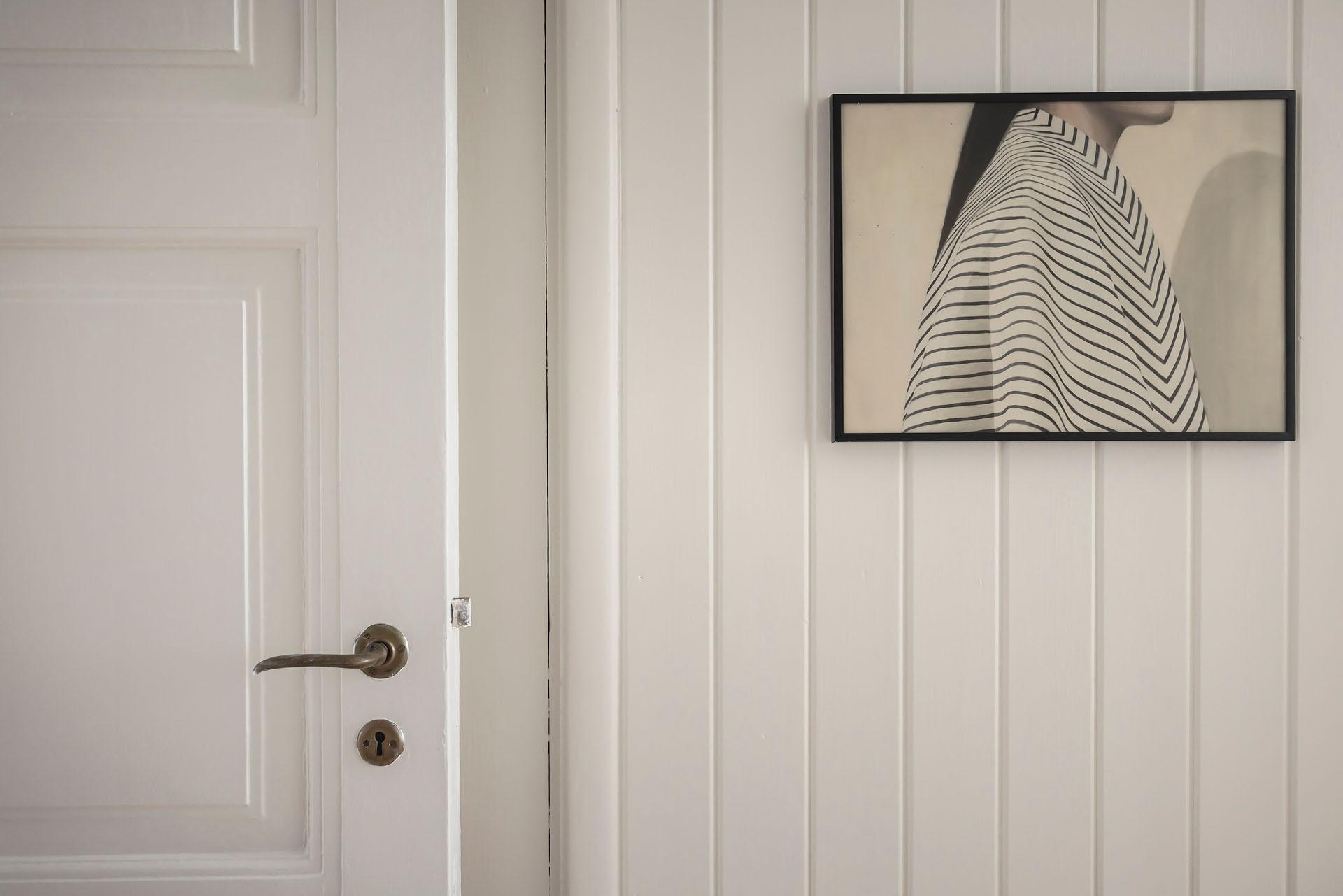 Hallen är lägenhetens nav, och dagsljuset flödar genom dörröppningarna till vardagsrummet, sovrummet och köket. Det finns gott om plats för jackavhängning, och bra förvaringsmöjligheter erbjuds i form av en klädkammare. Brädgolvet är framtaget, och liksom i köket är väggarna klädda med vitmålad originalspont.