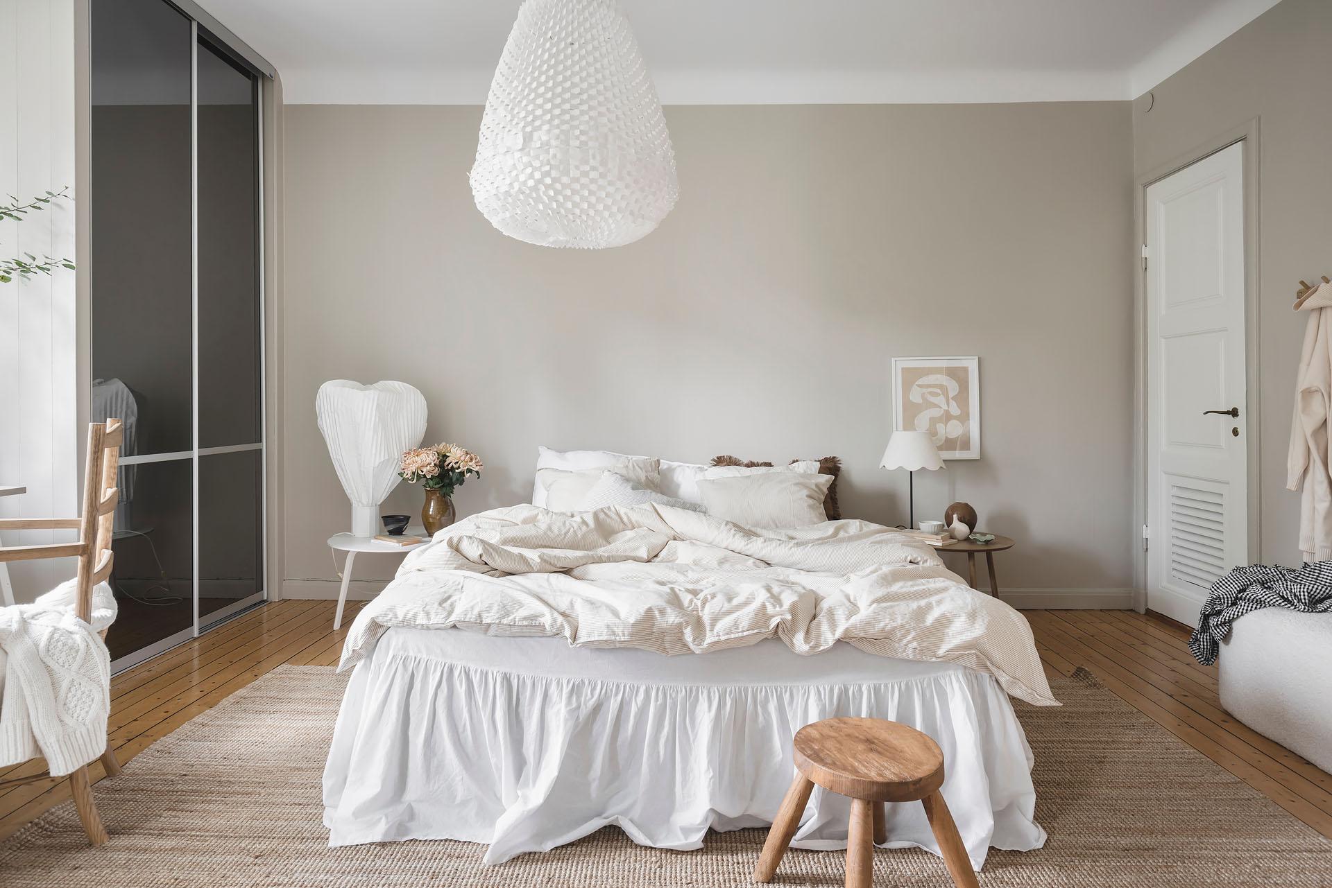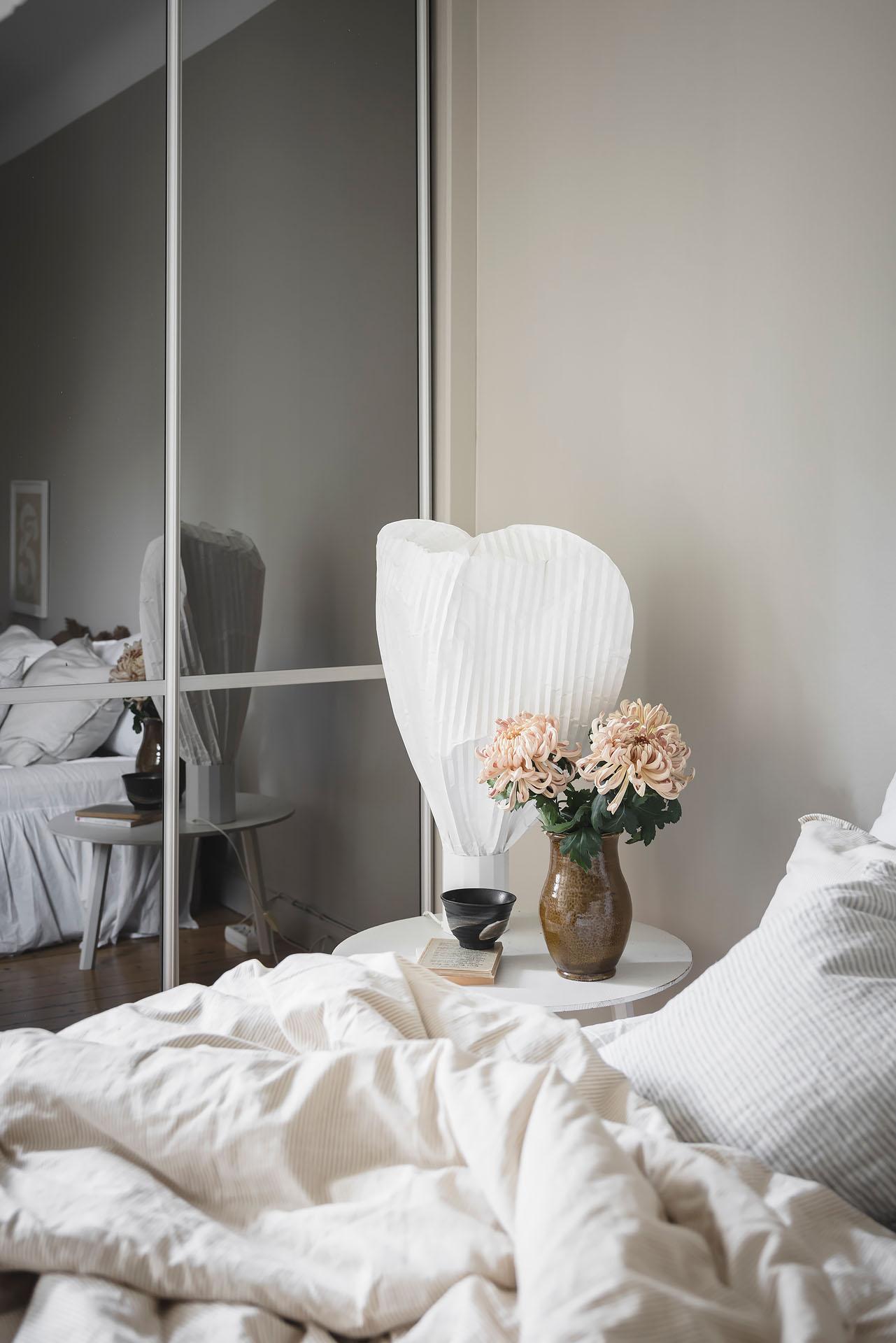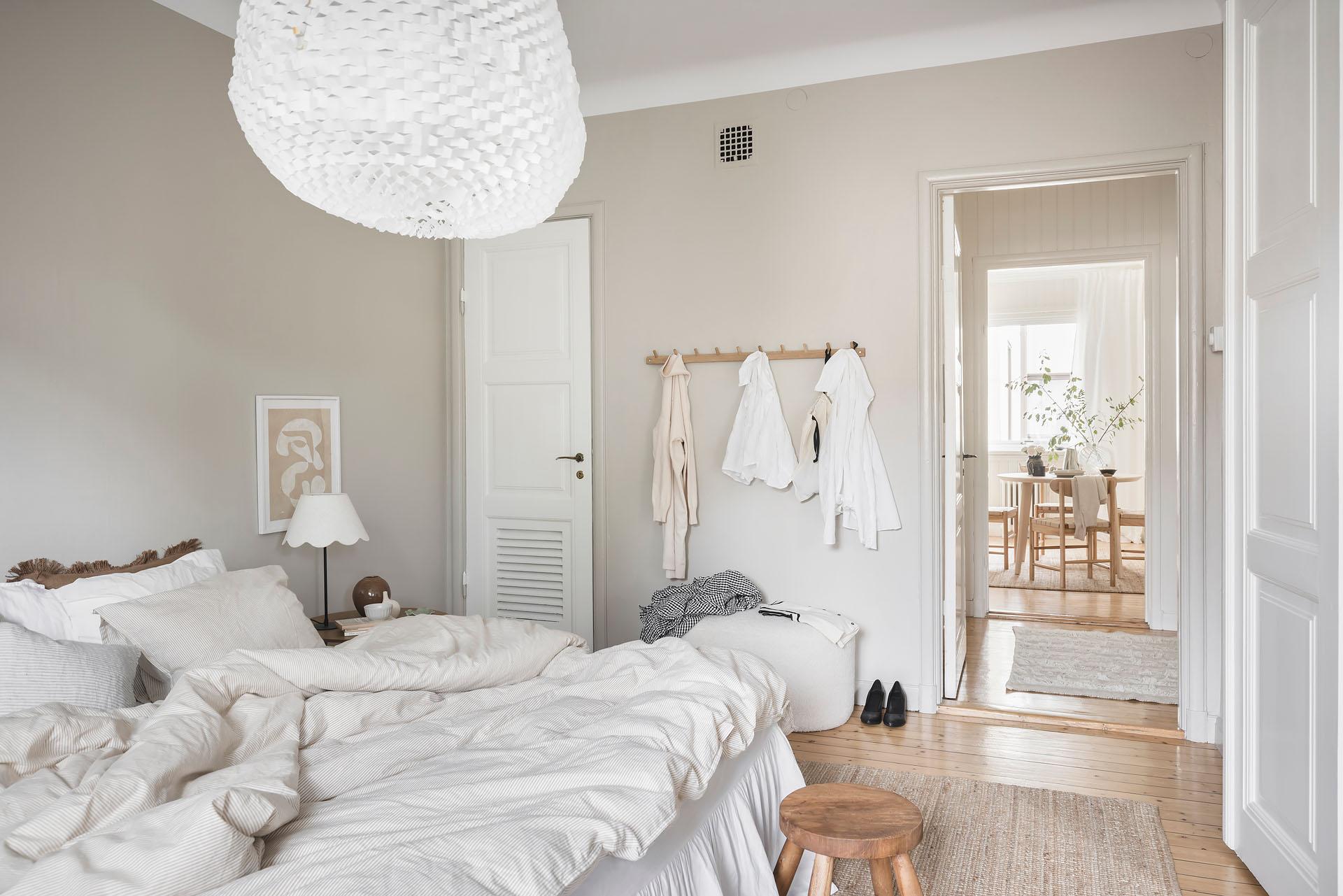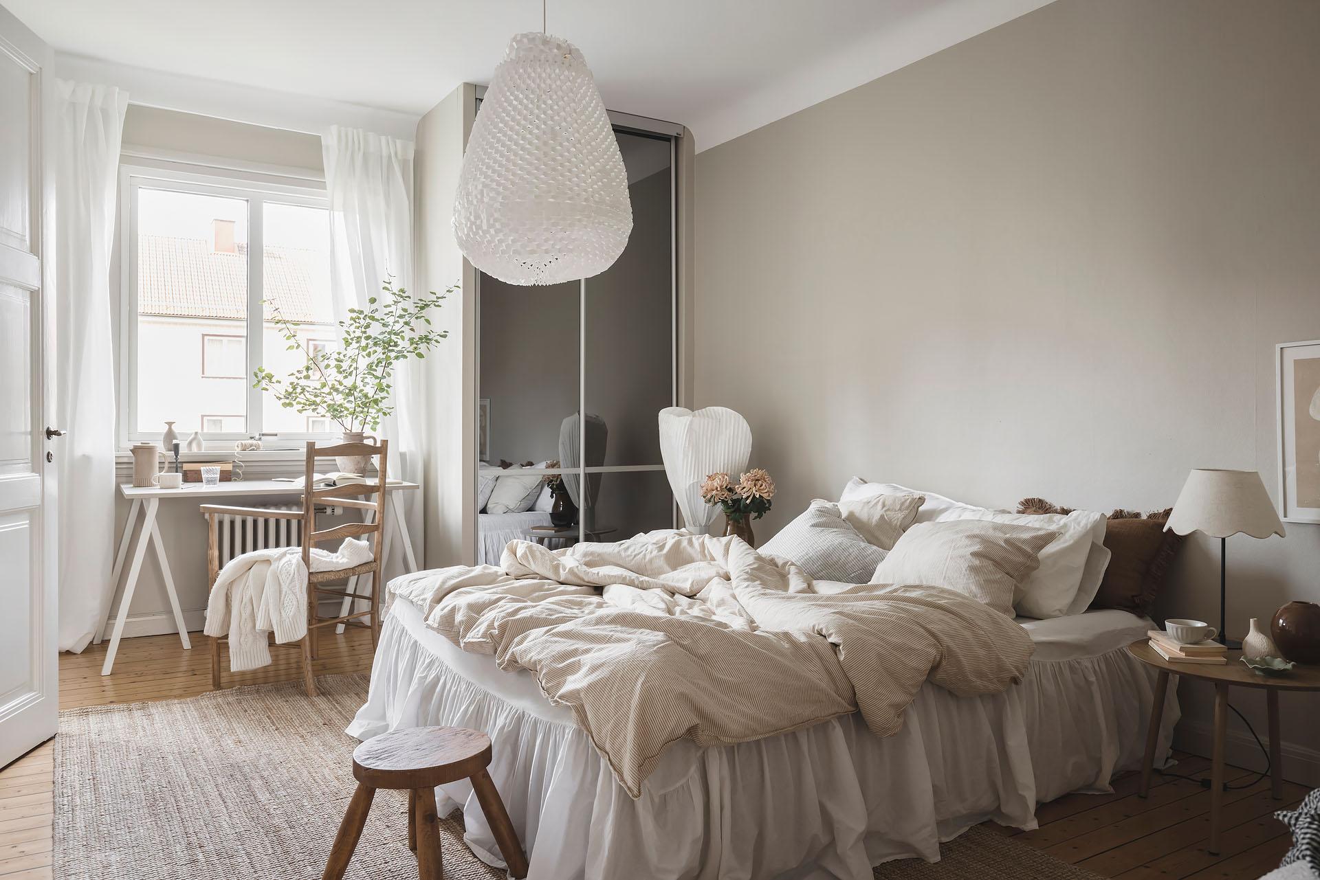 Parspegeldörrar öppnar och skiljer av mot lägenhetens sovrum, som även nås direkt från hallen. Här ryms en dubbelsäng med nattduksbord lätt och ledigt, och utmärkta förvaringsmöjligheter för kläder och sänglinne erbjuds i form av en platsbyggd skjutdörrsgarderob. Brädgolvet är framtaget och väggarna målade i samma varma gråbeige färg som i vardagsrummet.