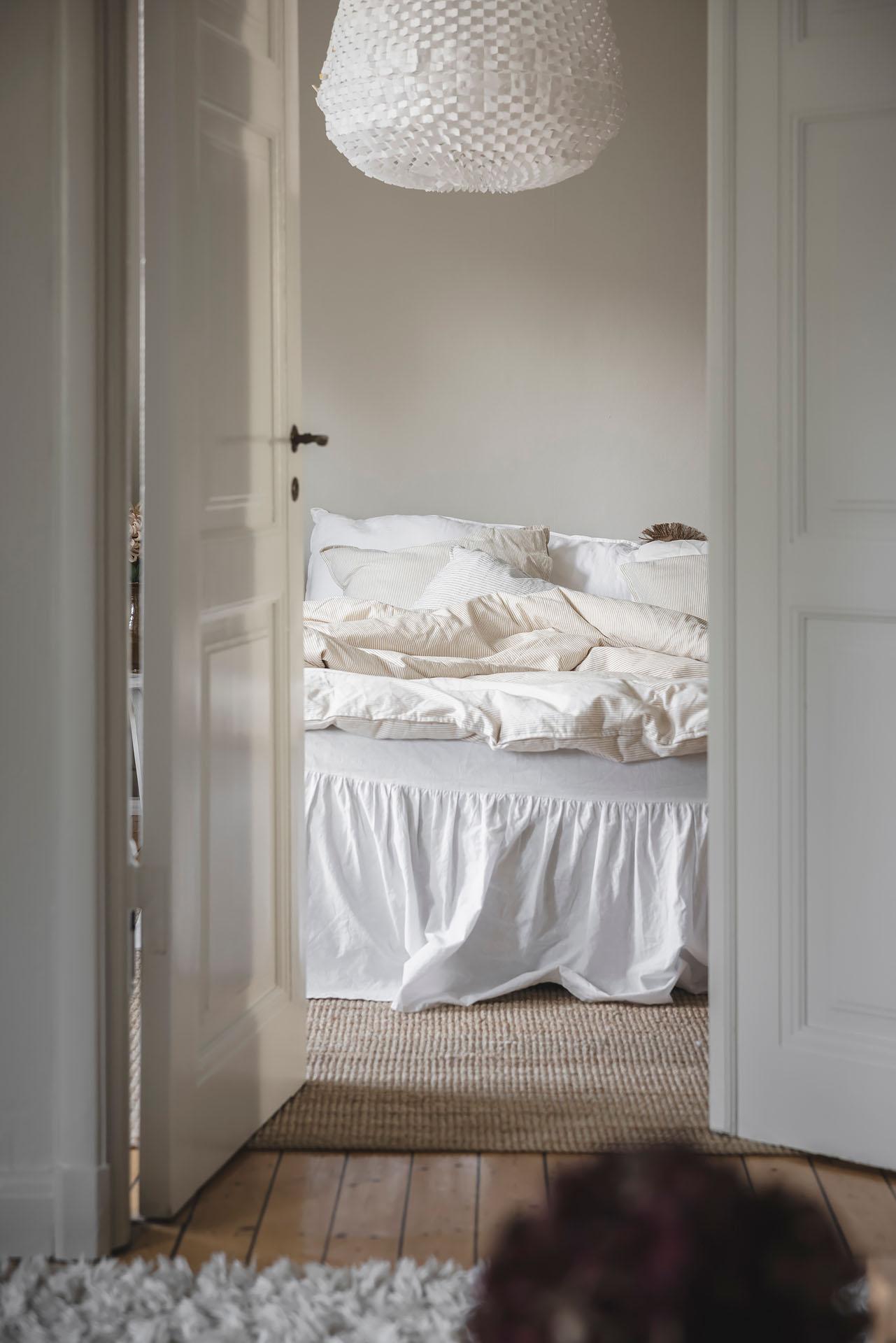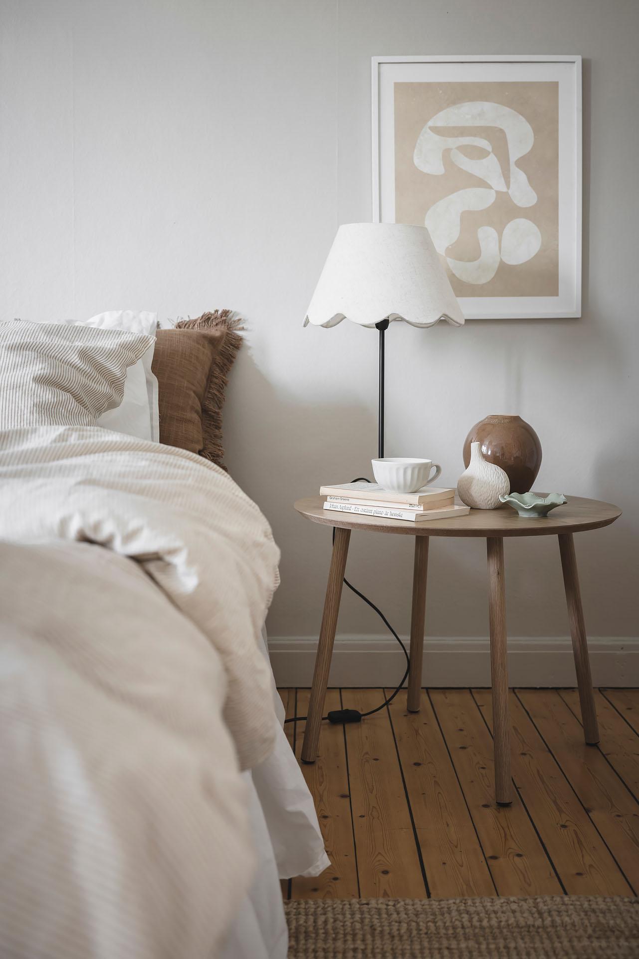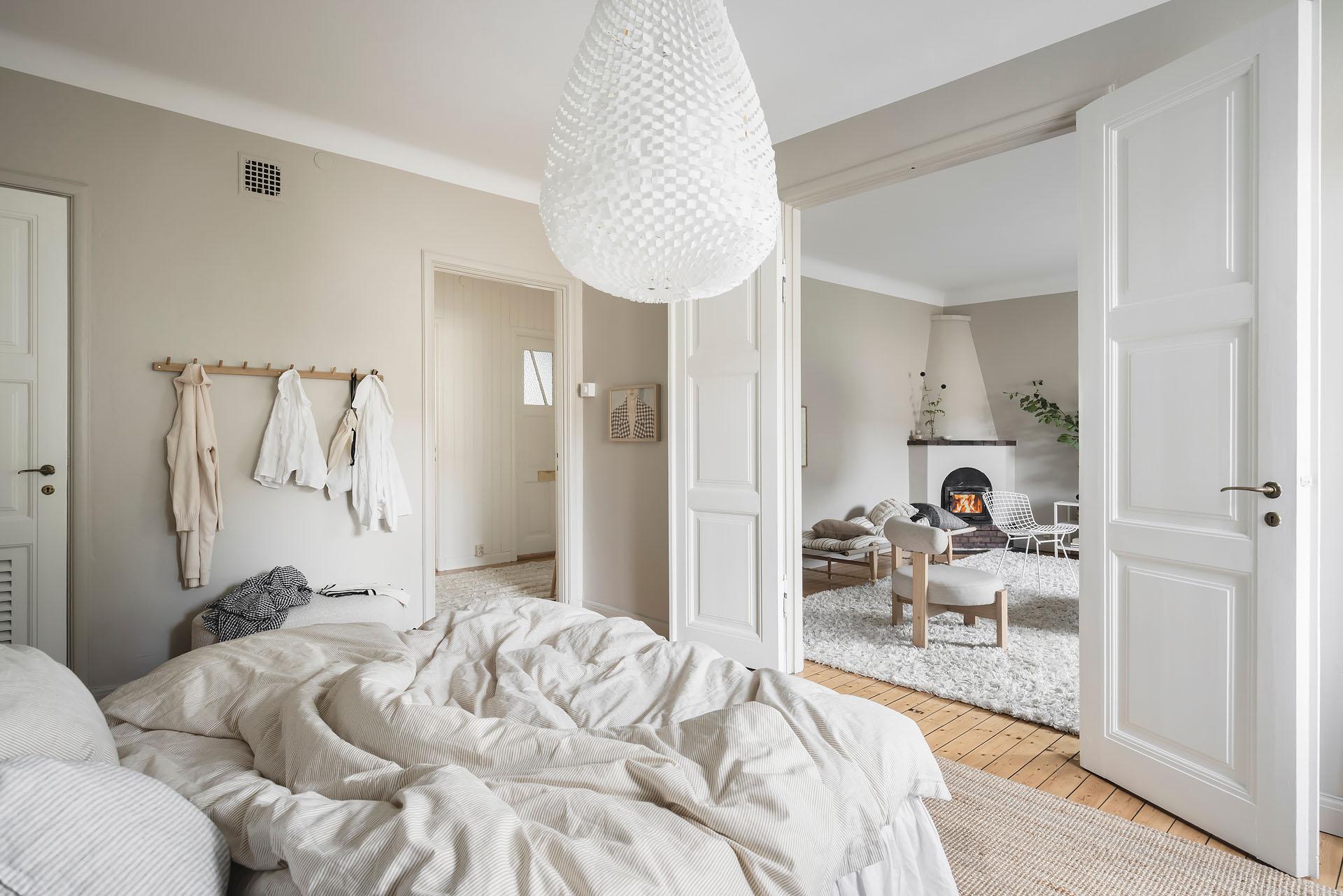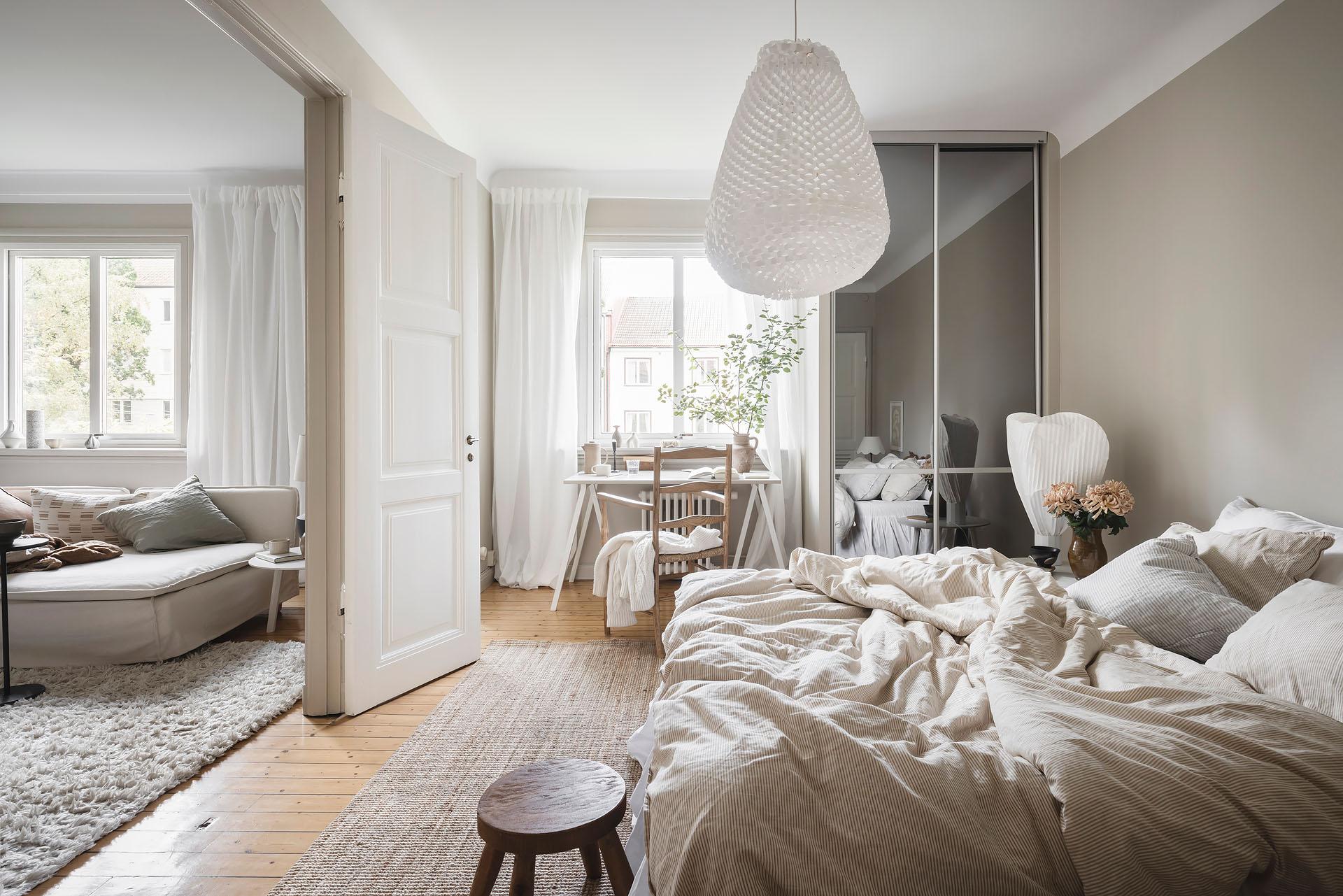 Parspegeldörrar öppnar och skiljer av mot lägenhetens sovrum, som även nås direkt från hallen. Här ryms en dubbelsäng med nattduksbord lätt och ledigt, och utmärkta förvaringsmöjligheter för kläder och sänglinne erbjuds i form av en platsbyggd skjutdörrsgarderob. Brädgolvet är framtaget och väggarna målade i samma varma gråbeige färg som i vardagsrummet.