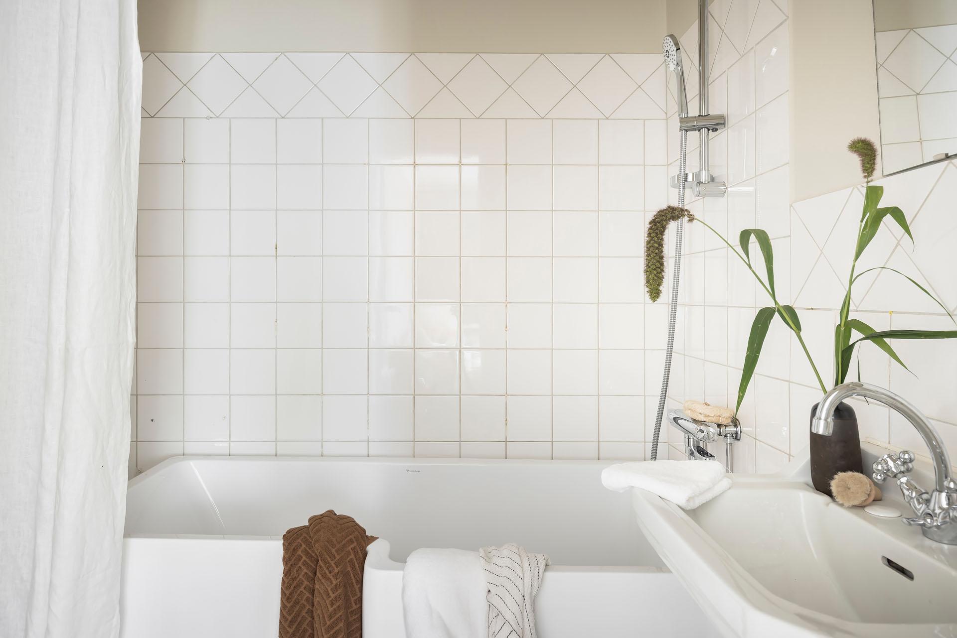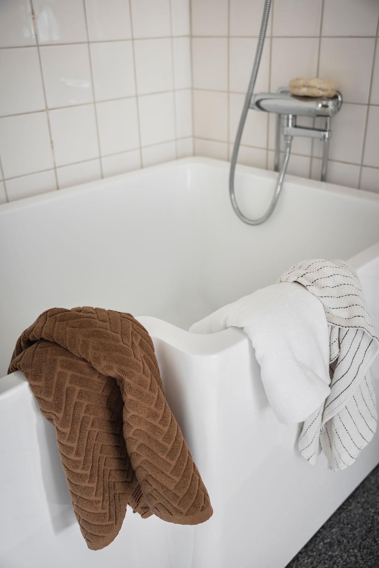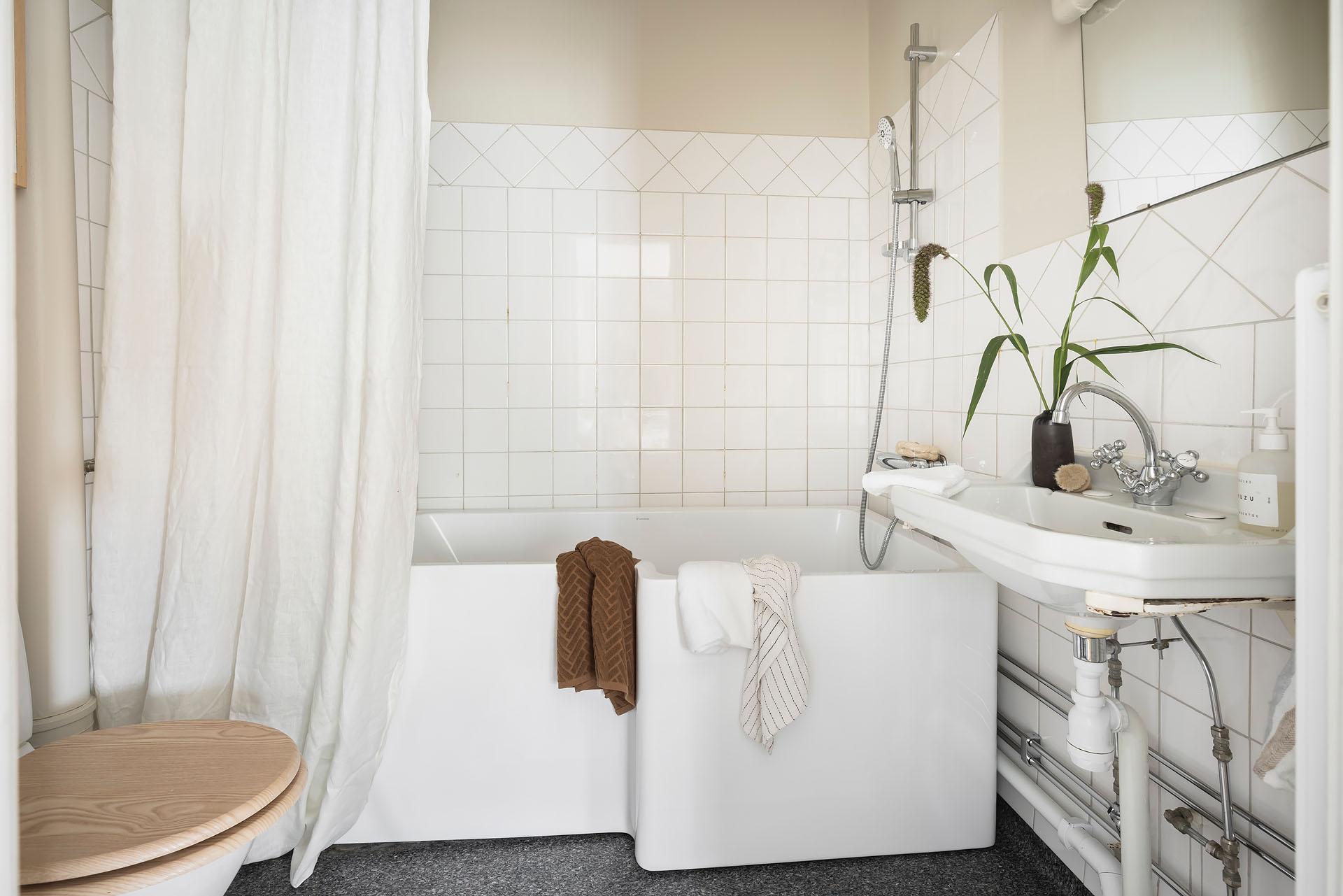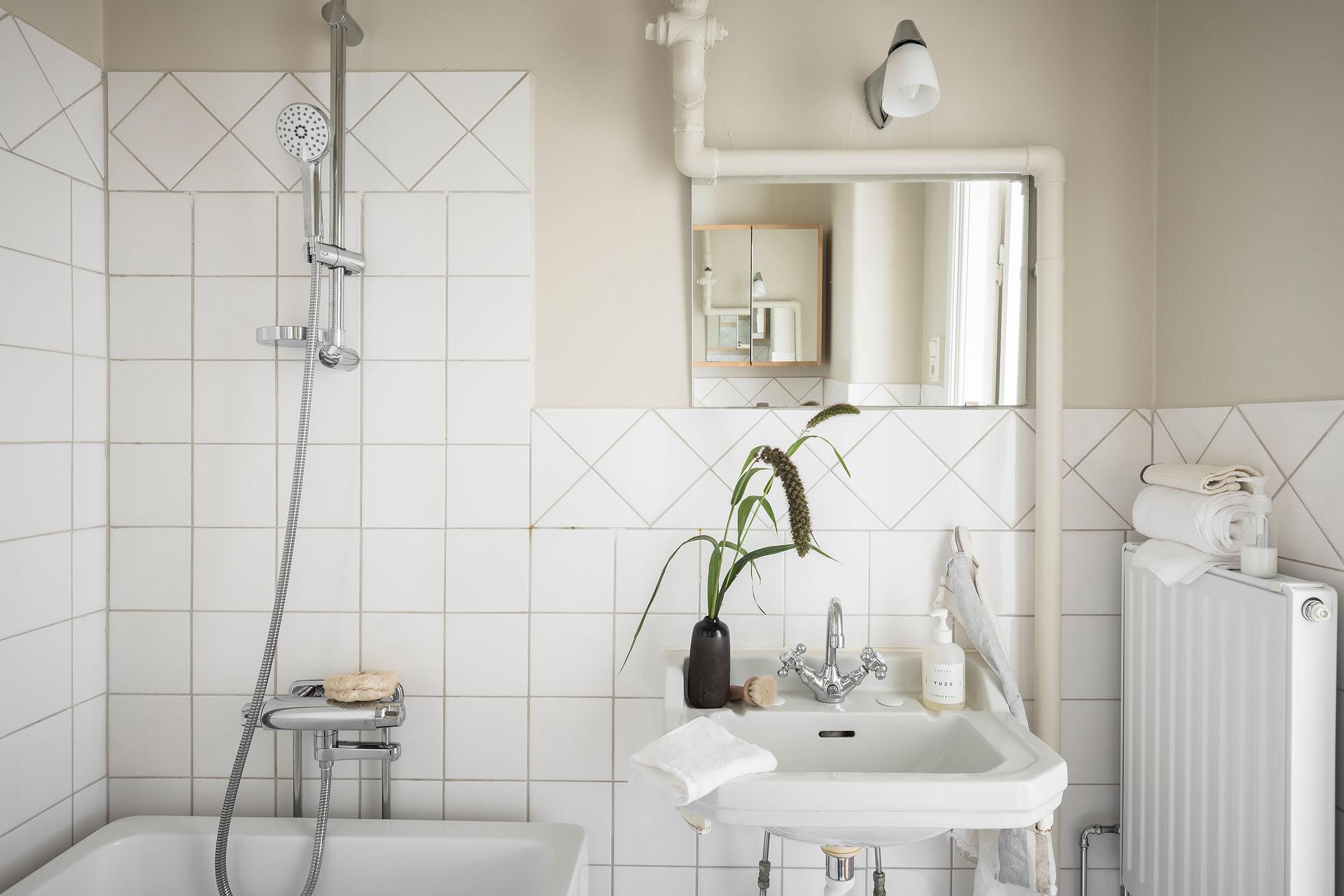 Lägenheten har på lyxigt hotellmanér badrum och sovrum en suite. Badrummet inrymmer badkar, handfat och toalett, och det är även förberett för att sätta in en tvättmaskin. Väggarna är klädda med vitt kakel och målade i Jotuns varma gyllenbeige kulör ”Sans”.