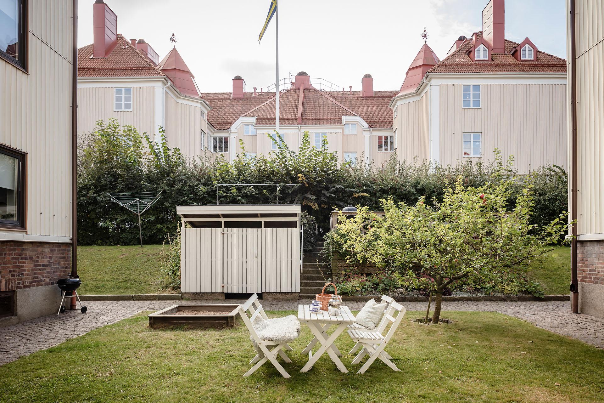 Ett mycket trivsamt boende erbjuds och terrassen ute på den mysiga innergården bjuder in till middagar eller ett glas vin i kvällssolens sken. Intill terrassen växer ett äppelträd som tas kärleksfullt om hand, och den med gröna fingrar har möjlighet att skaffa sig en egen odlingslott i föreningens gemensamma trädgårdsland. I föreningen råder en familjär stämning grannar emellan.