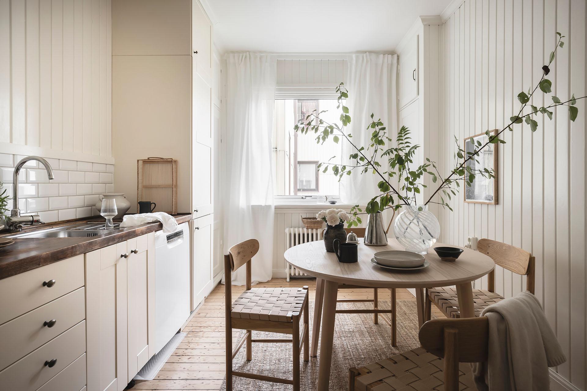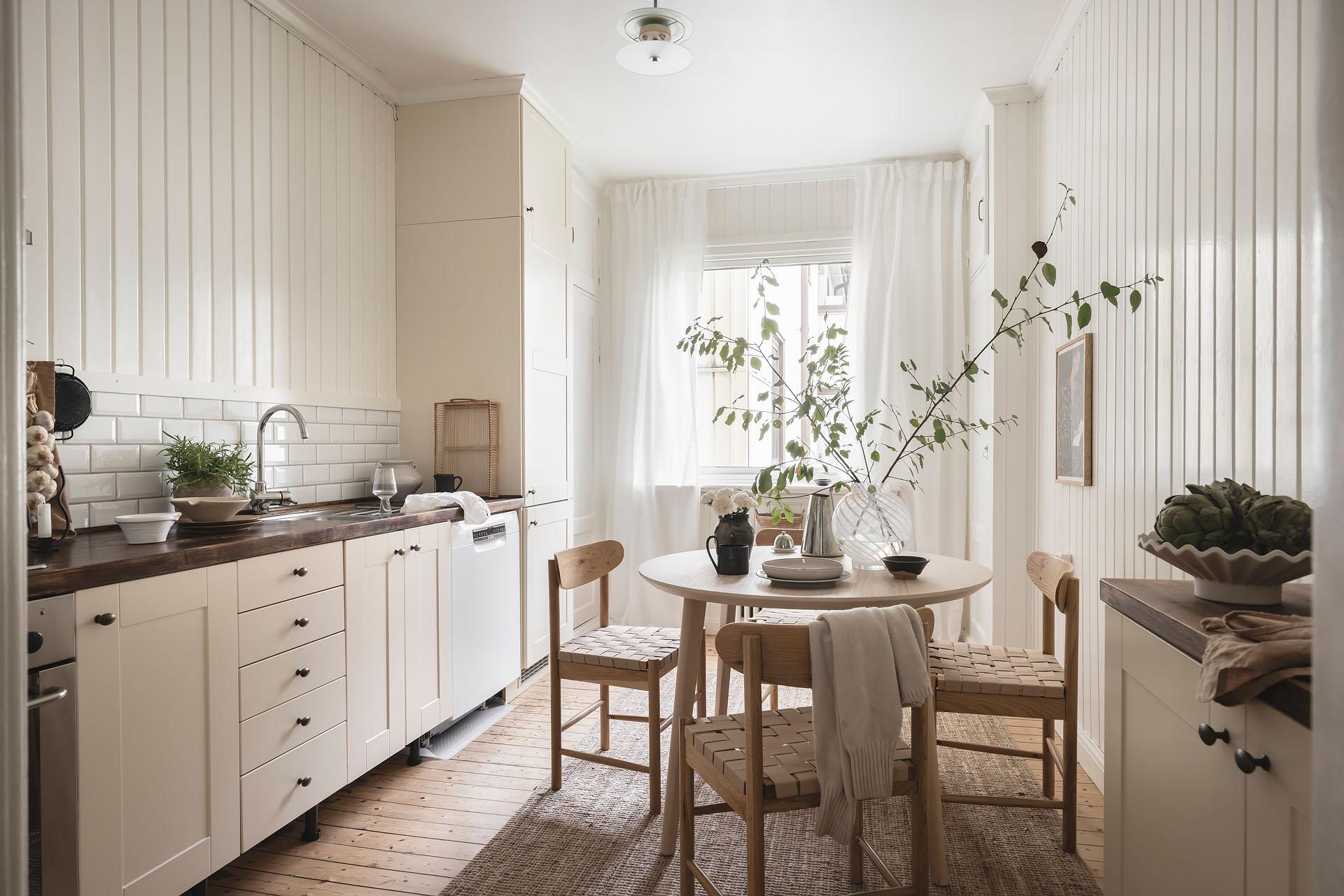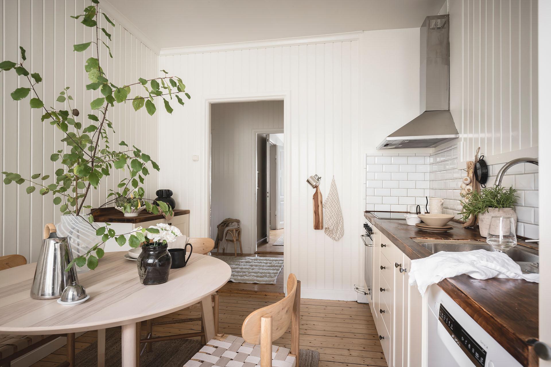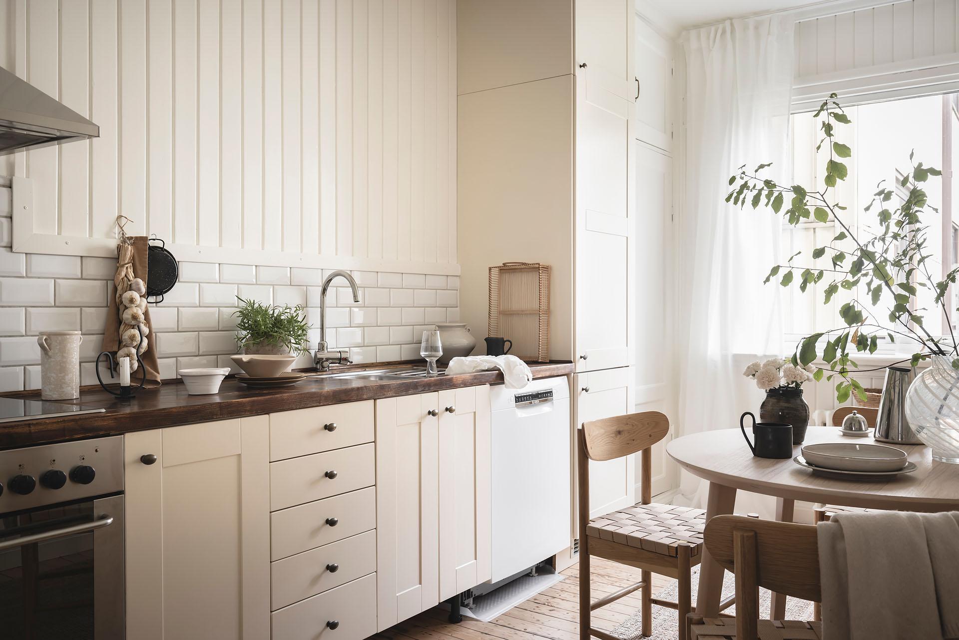 Köket, med trevlig utsikt mot föreningens innergård, är rymligt och det finns plats för att ha trevliga middagar i goda vänners lag. Det är även väl tilltaget med arbetsyta och förvaring, och de moderna köksskåpen kompletteras med två inbyggda originalskafferier. Skåpen har vita luckor och lådor, och bänkskivan är i mörkt trä med infälld spishäll och diskho. Partiet ovanför bänken är klätt med vitt fasat kakel i halvförband. Fläkten är i rostfri design medan kylen/frysen är integrerad i inredningen. Köket är även utrustat med diskmaskin och ugn. Brädgolvet är framtaget och väggarna klädda med vitmålad originalspont.