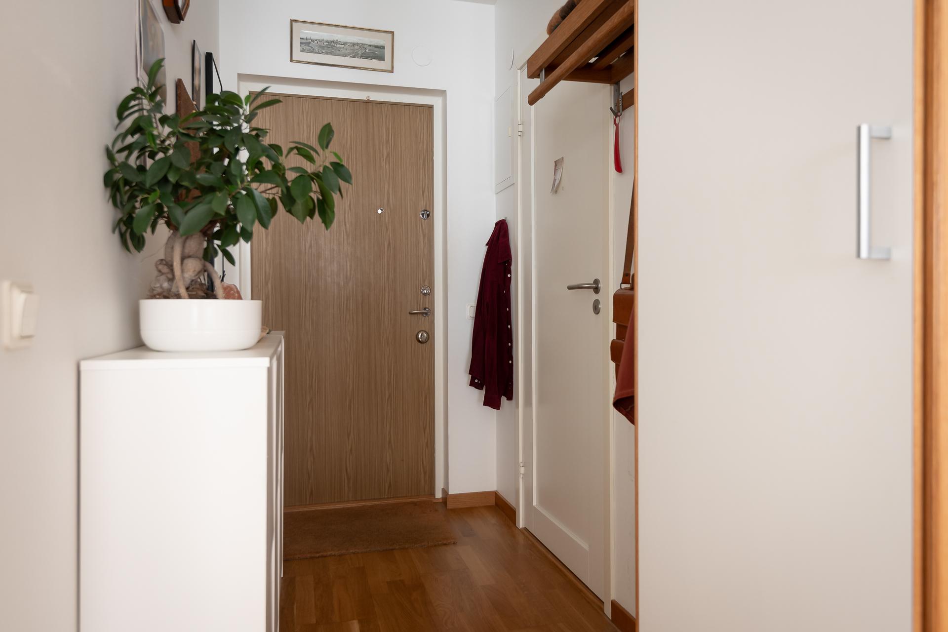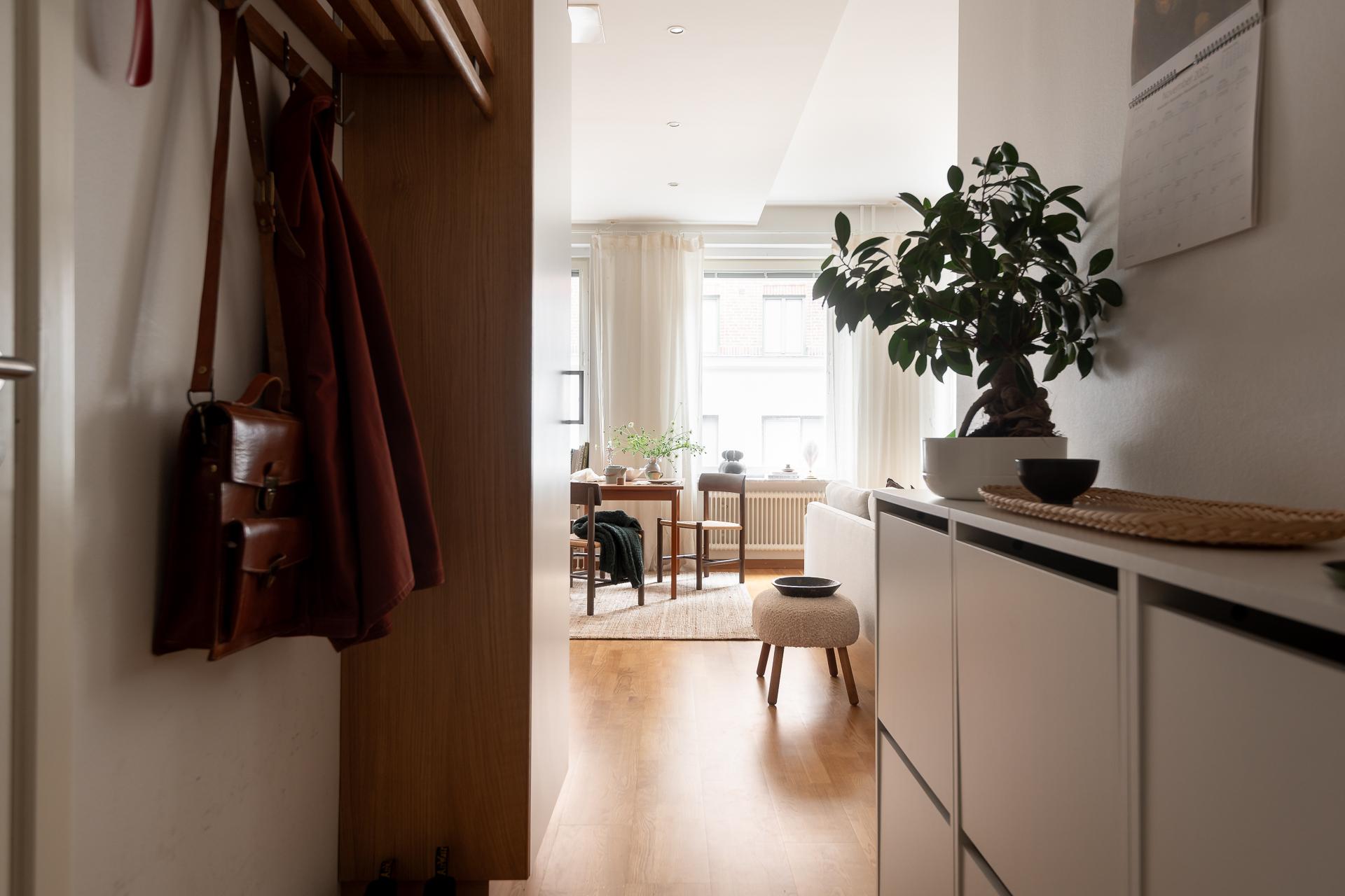 Via den nyrenoverade entrén hittar ni enkelt vidare till lägenheten. Väl inne i hallen slås man av hur öppen och luftig denna lägenhet är. Sikt är fri ända ner till gatan genom stora köksfönstren. Hallen är väldisponerad med plats för avhängning direkt till höger. Vita väggar och prydlig parkett på golvet. Dessutom en praktisk garderob.
