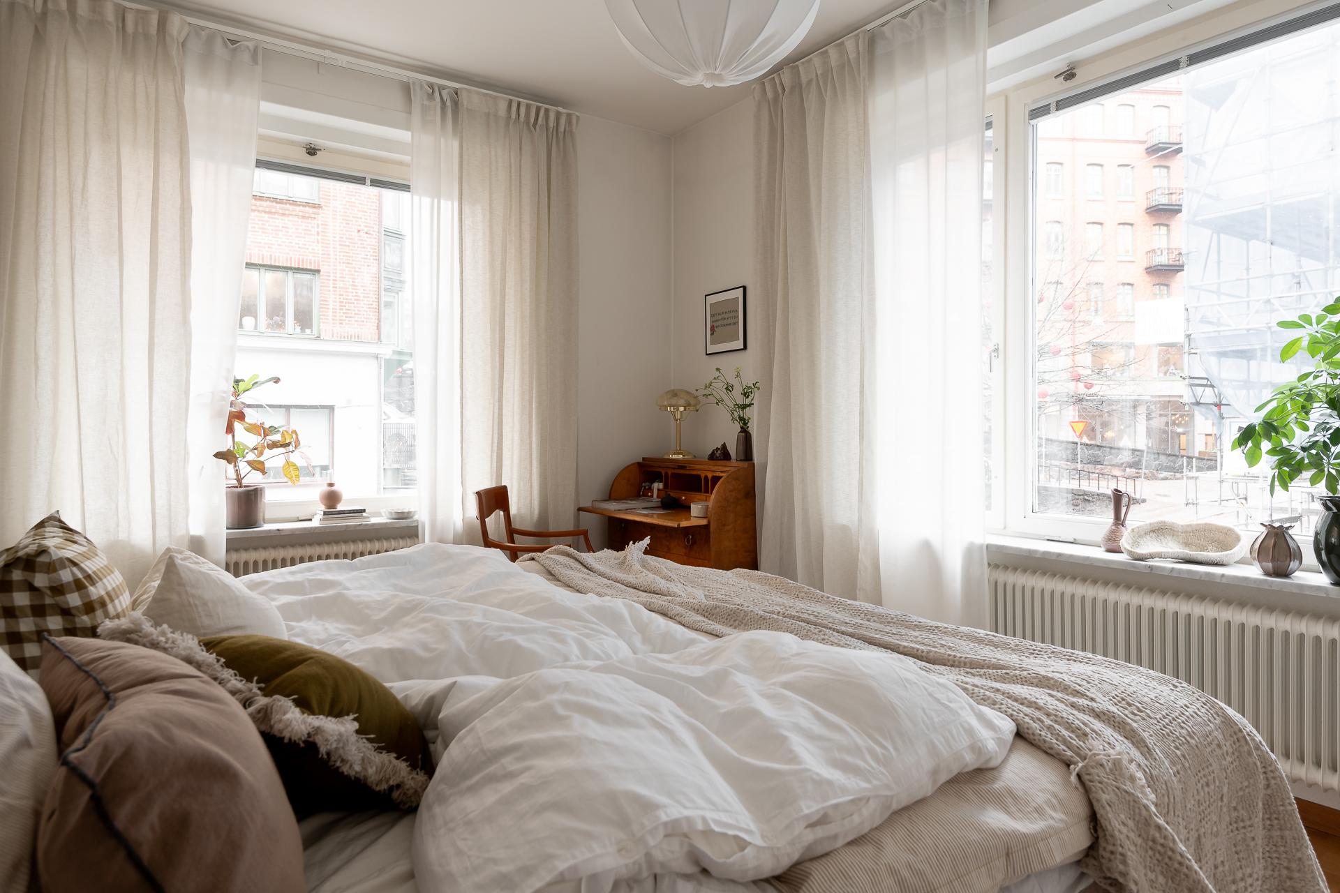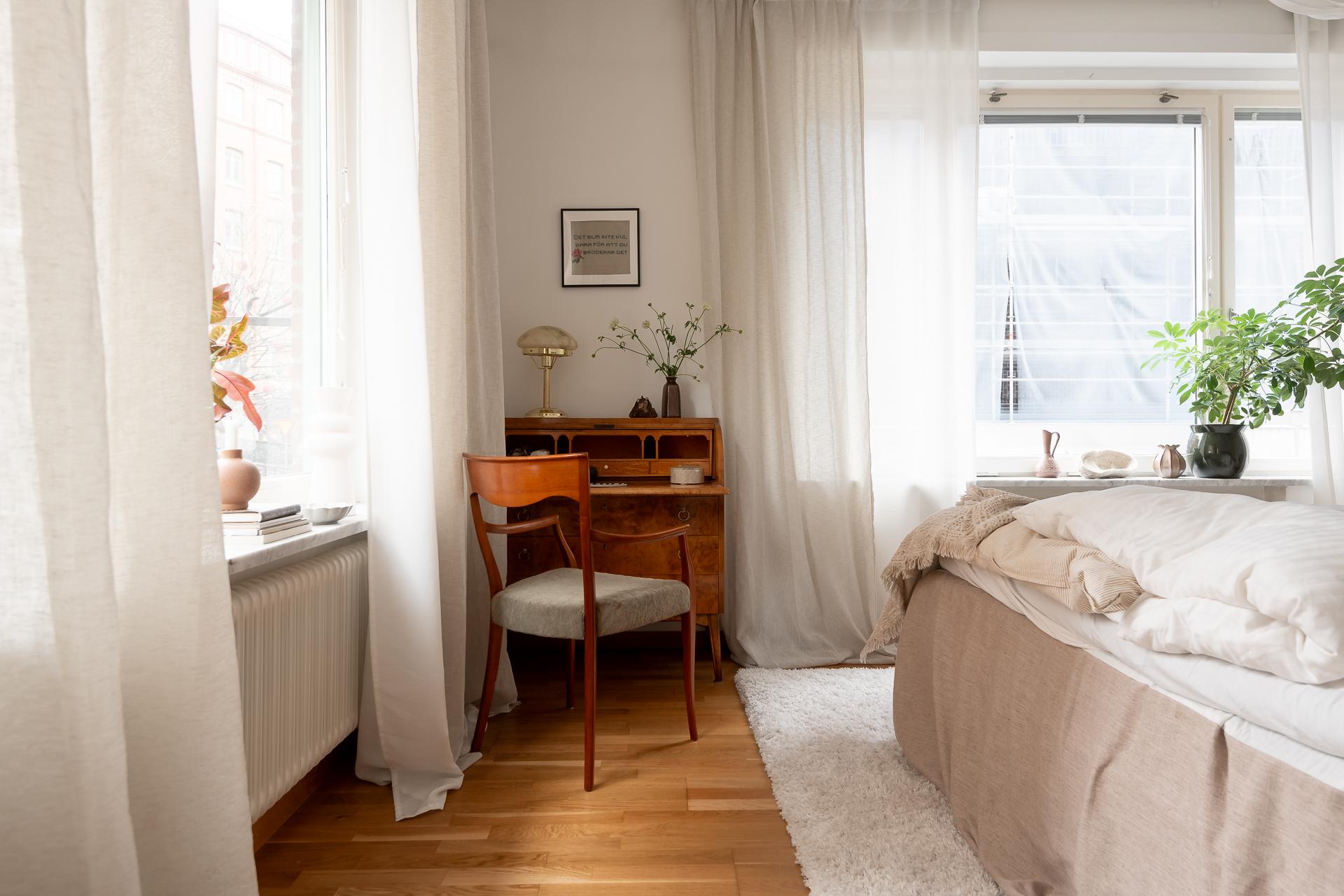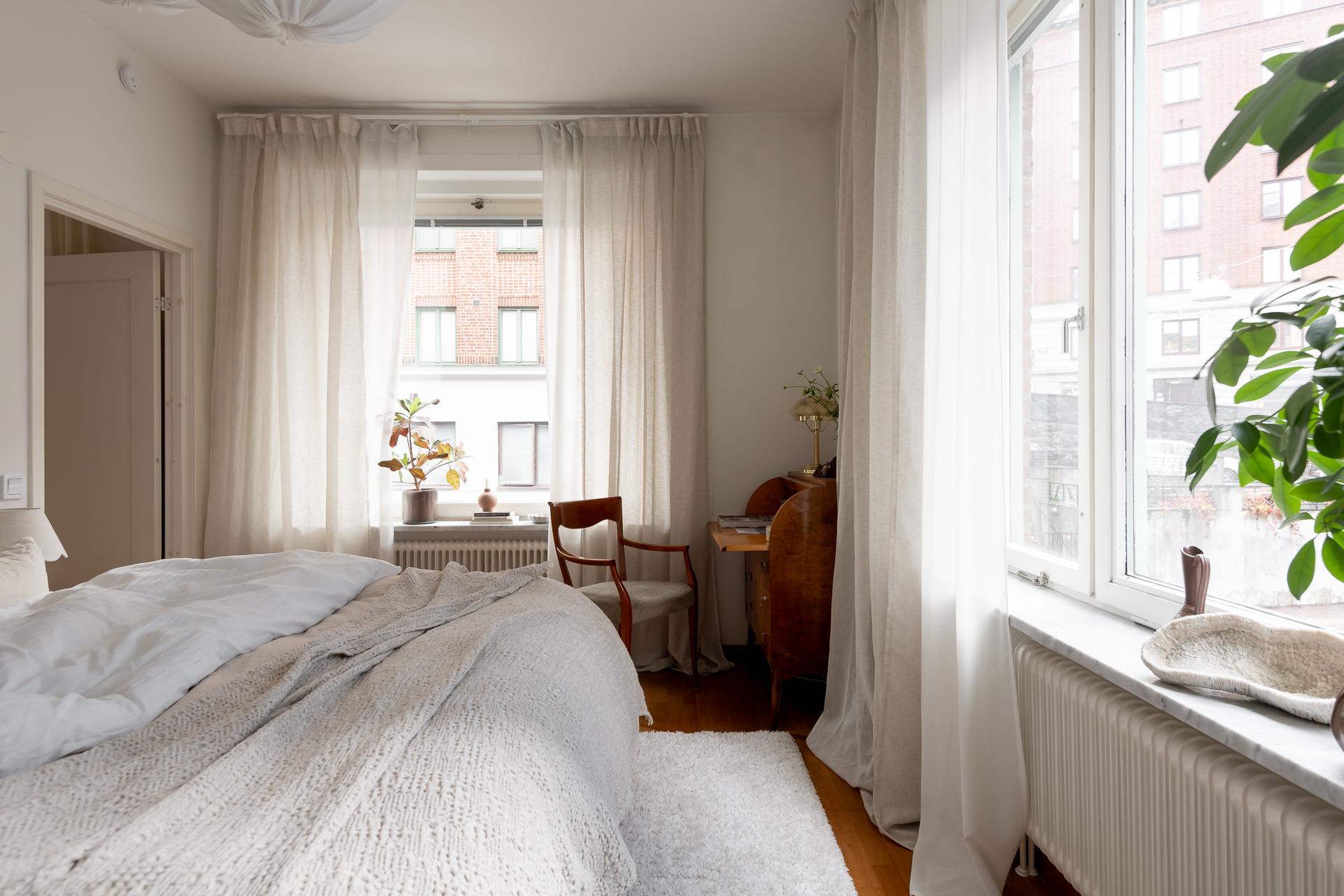 För många en dröm med ett hörnrum- nu kan den bli verklighet. Här har ni fönster både ut Luntantugatan med nationalromantisk arkitektur i blickfånget och samtidigt åt Kungsgatan med dess fina funkiskåkar. Stora fönster i original även här liksom de stolta radiatorerna och fönsterbänkarna i carraramarmor som finns i alla fönster i lägenheten. Ena kortsiddan består av hela fem garderober, så här ryms det mesta i klädväg antingen ni är själva eller bor två. Plats för dubbelsäng, nattduksbord och skrivbord för den som önskar.