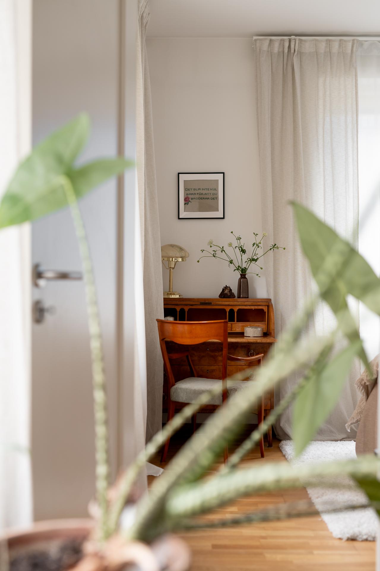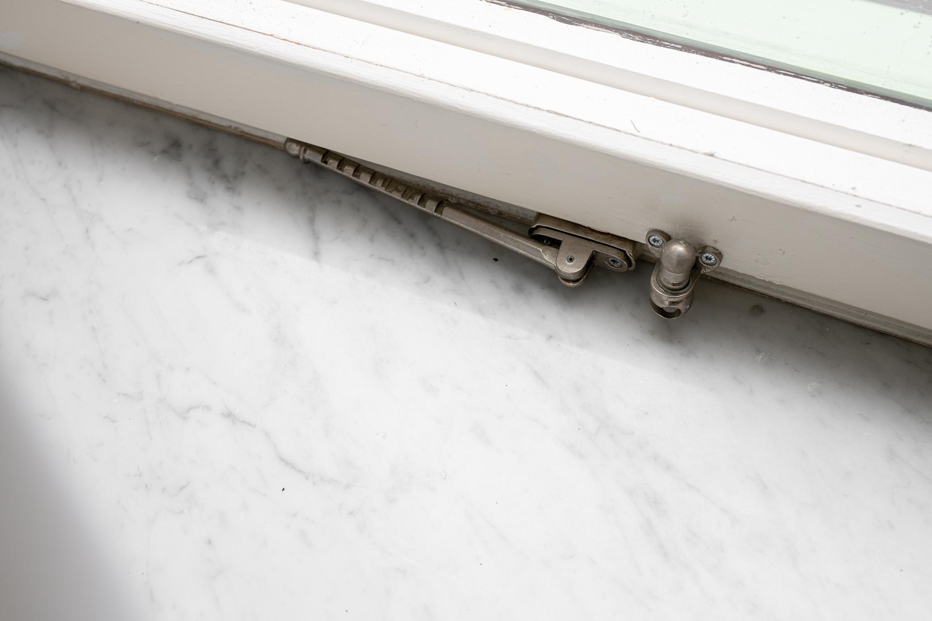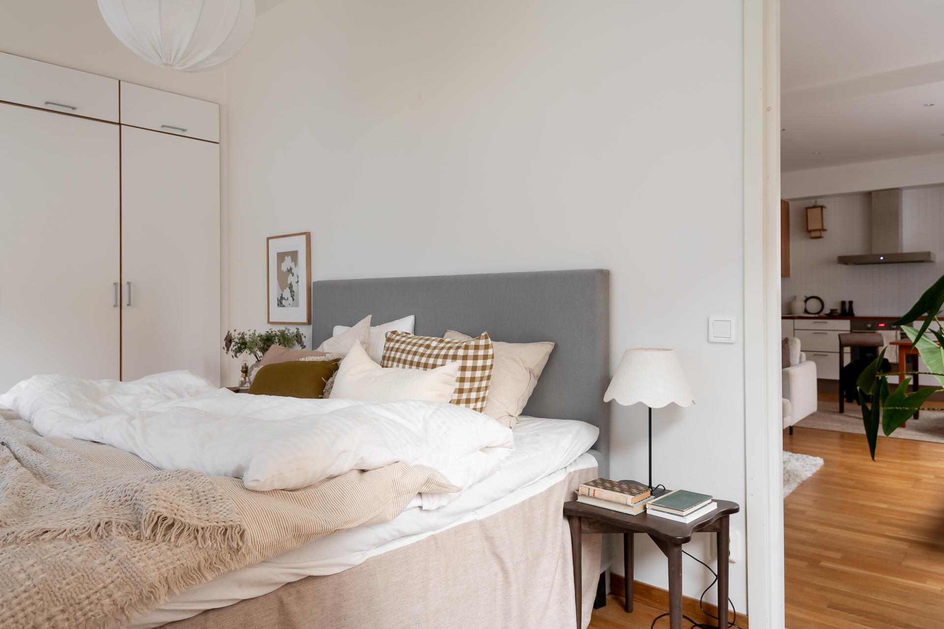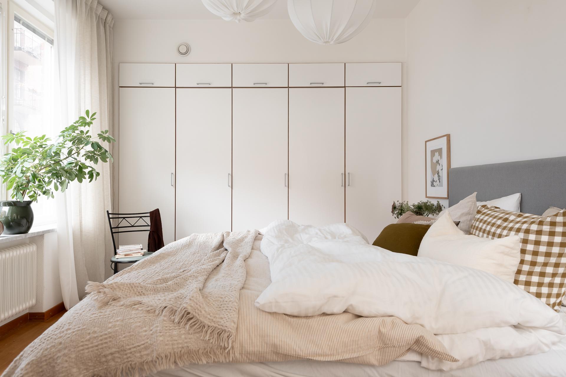 För många en dröm med ett hörnrum- nu kan den bli verklighet. Här har ni fönster både ut Luntantugatan med nationalromantisk arkitektur i blickfånget och samtidigt åt Kungsgatan med dess fina funkiskåkar. Stora fönster i original även här liksom de stolta radiatorerna och fönsterbänkarna i carraramarmor som finns i alla fönster i lägenheten. Ena kortsiddan består av hela fem garderober, så här ryms det mesta i klädväg antingen ni är själva eller bor två. Plats för dubbelsäng, nattduksbord och skrivbord för den som önskar.
