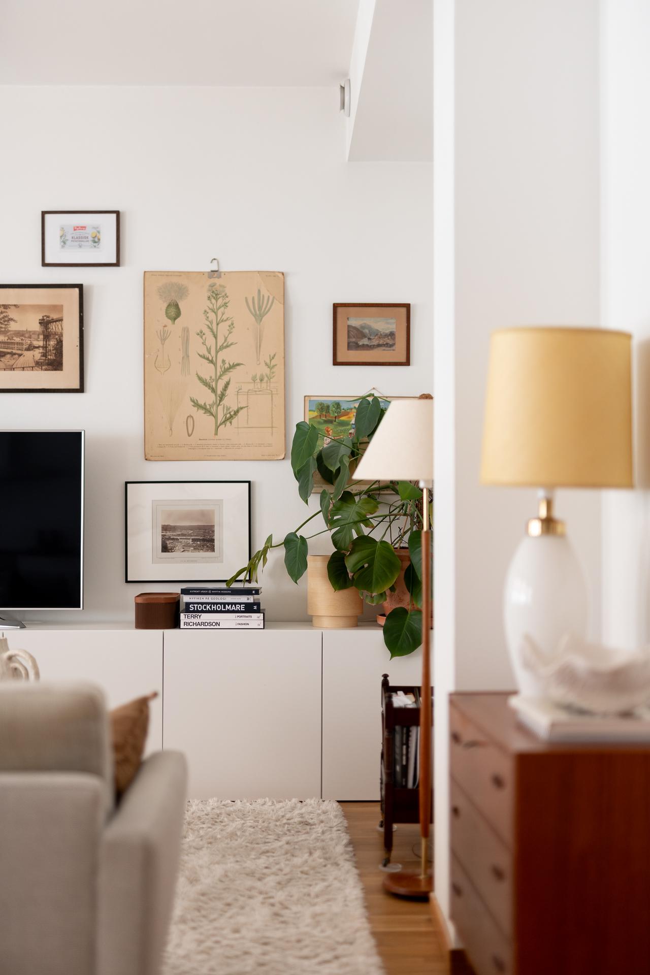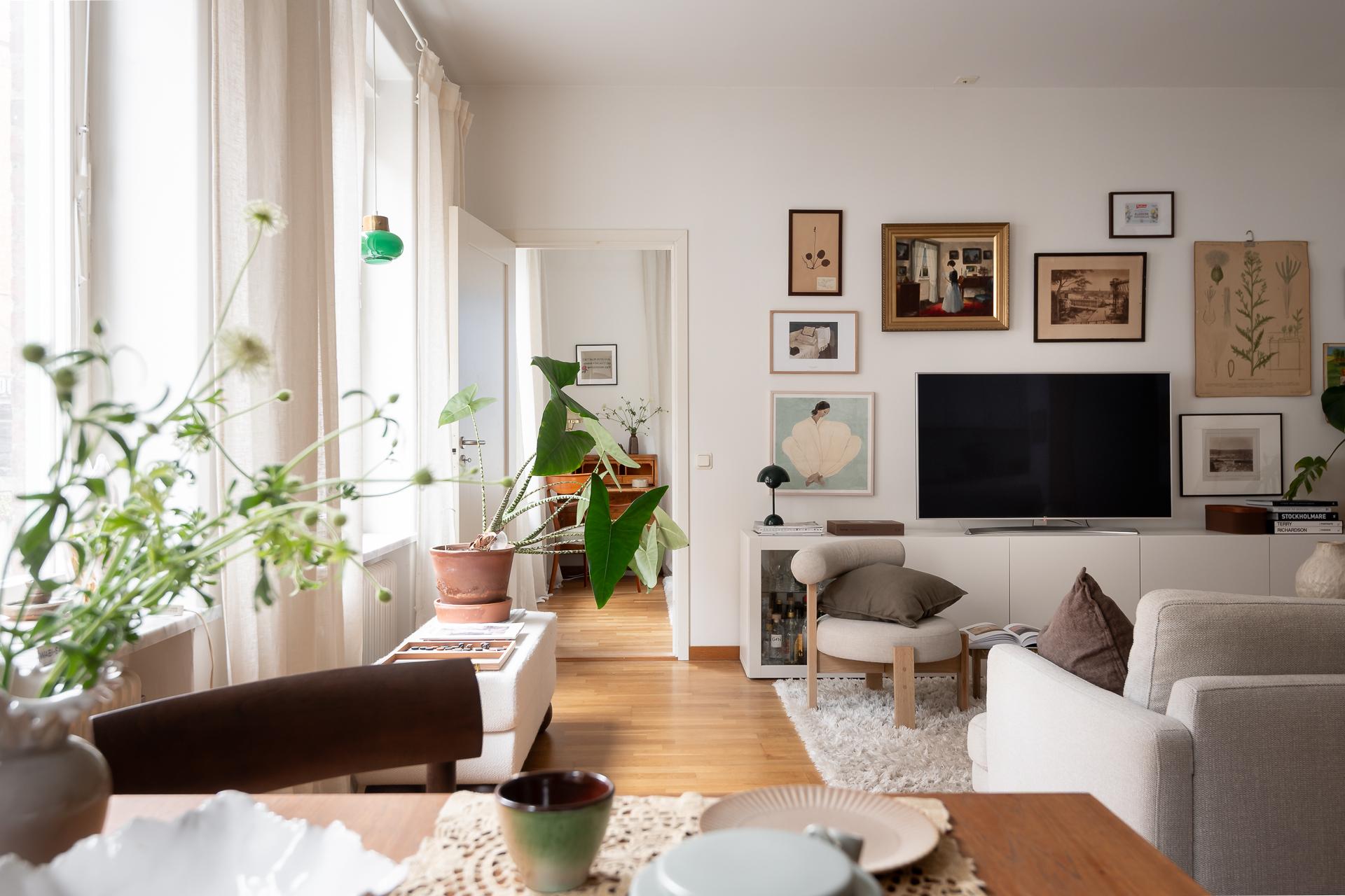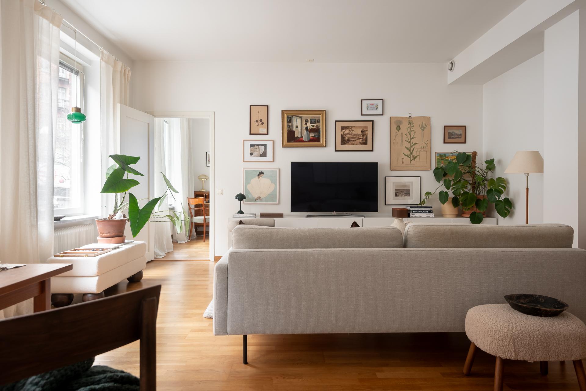 Vardagsrumsdelen har hittat sin egen plats i rummet och där är det idag möblerat med soffgrupp, tv-hörna och sideboard. En varm och ombonad känsla råder i rummet och det förstärks bokstavligen också via de fina gjutjärnsradiatorerna i original.