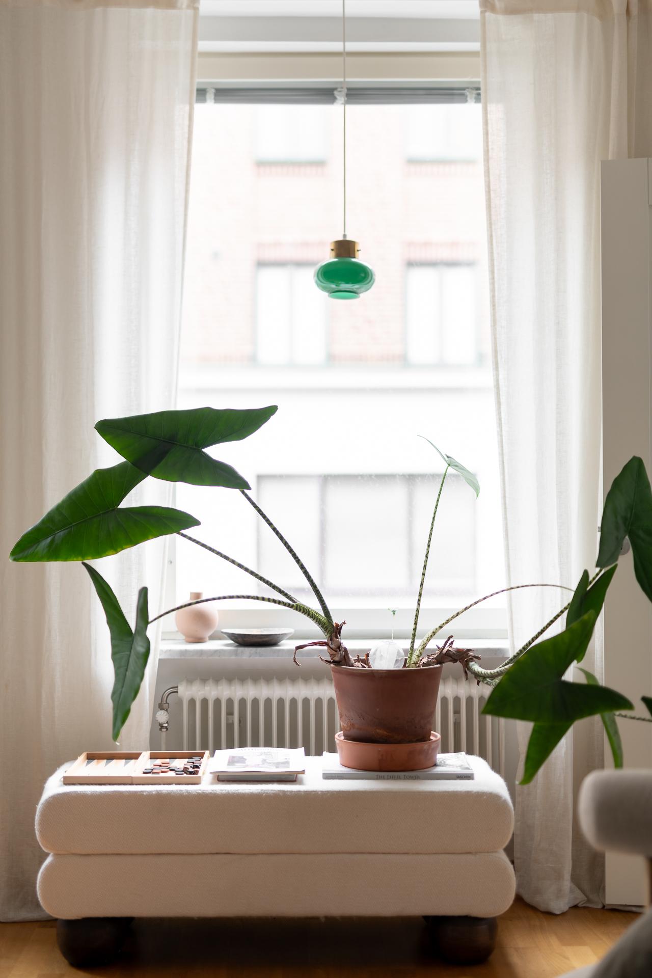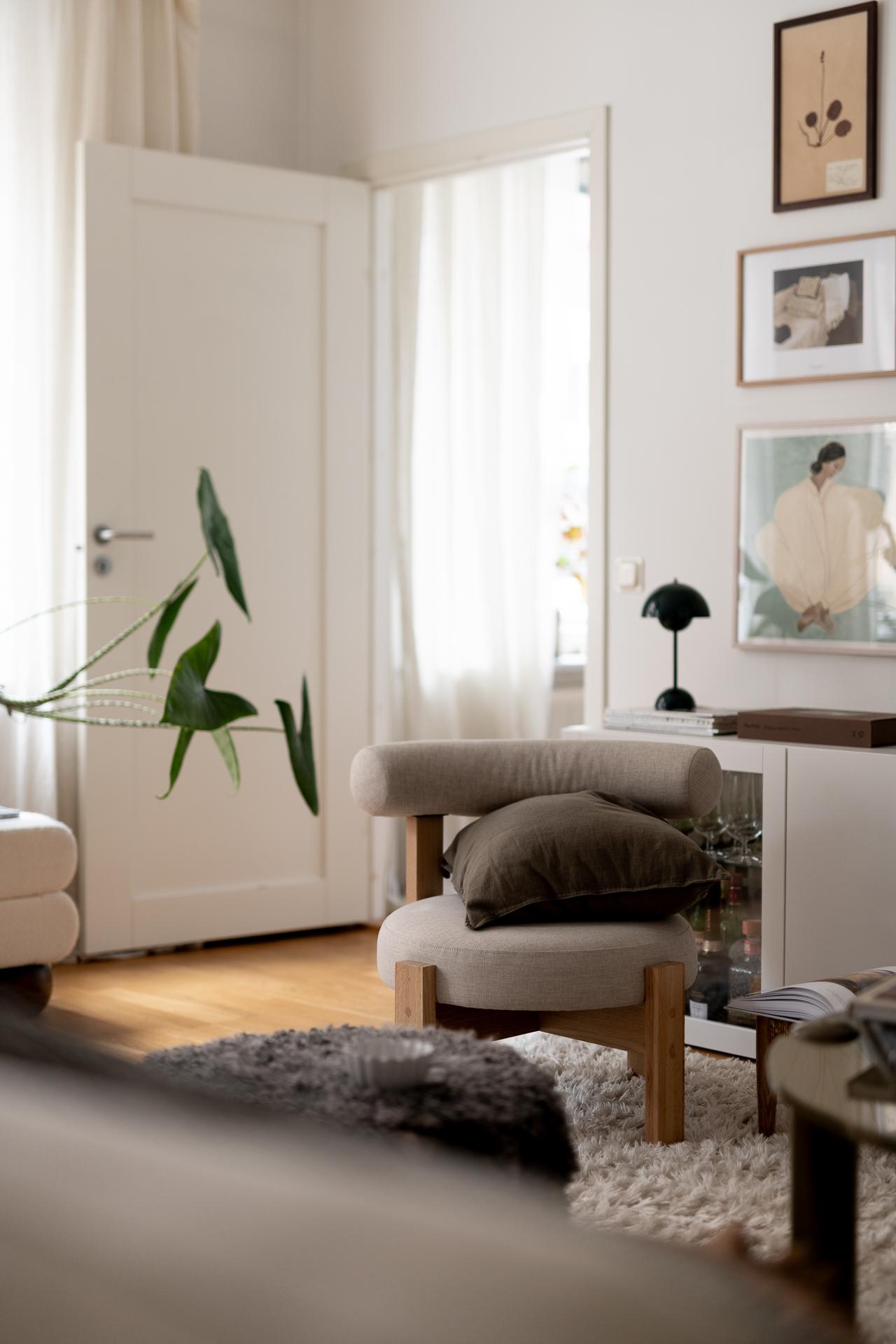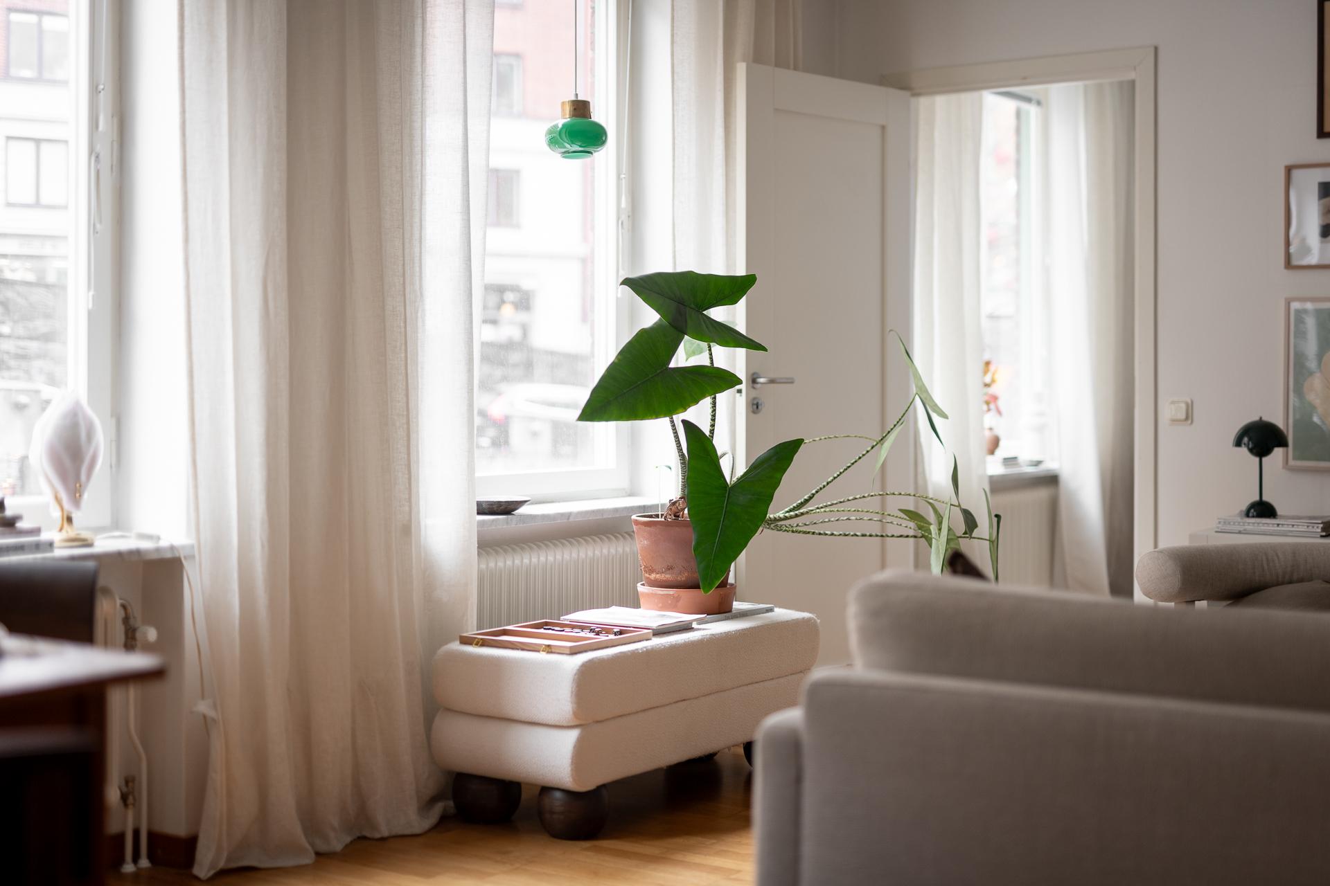 Vardagsrumsdelen har hittat sin egen plats i rummet och där är det idag möblerat med soffgrupp, tv-hörna och sideboard. En varm och ombonad känsla råder i rummet och det förstärks bokstavligen också via de fina gjutjärnsradiatorerna i original.