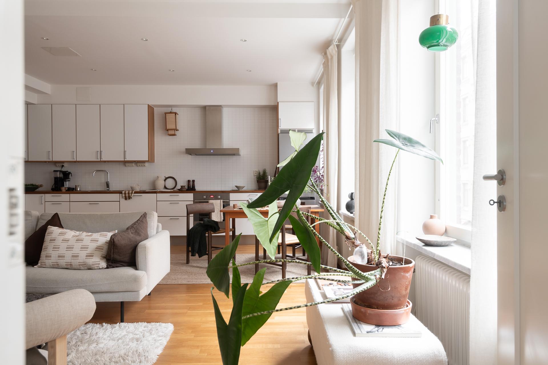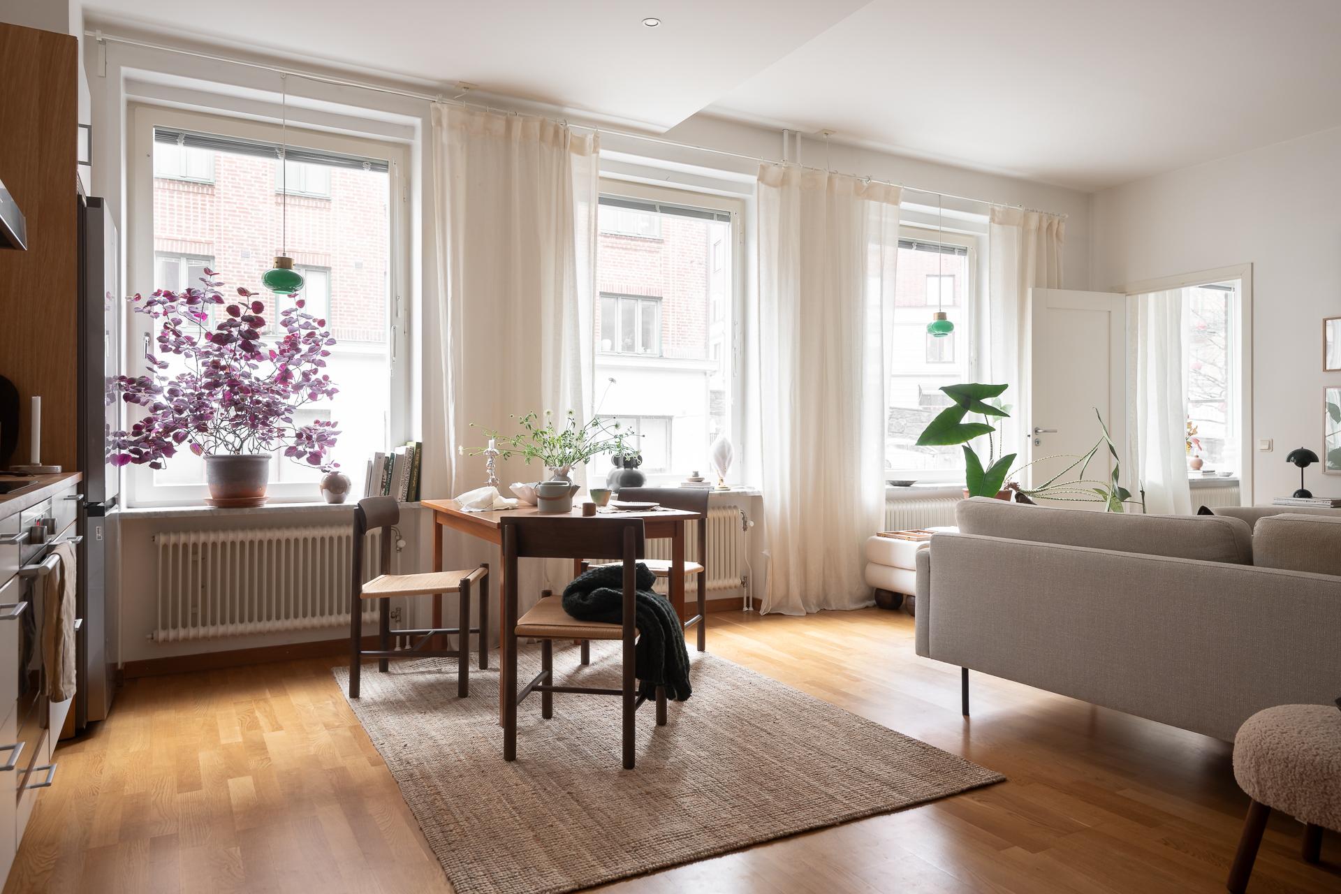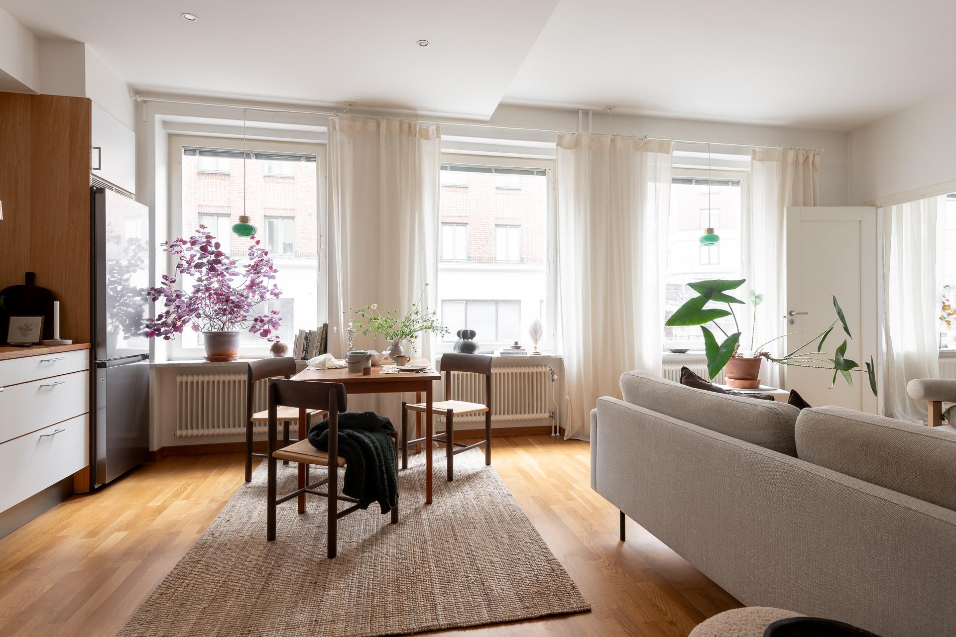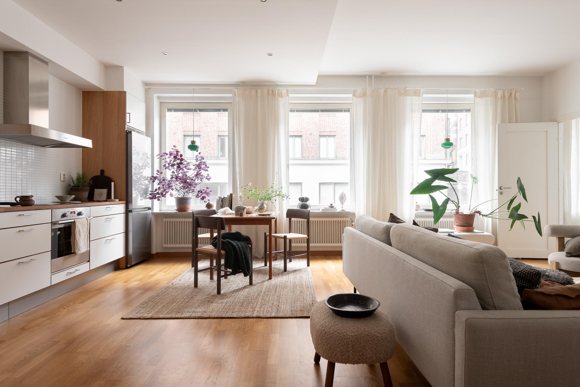 Hela köket är planerat längs lägenhetens ena kortsida och ligger i öppen planlösning ihop med vardagsrummet. Bänkskiva i massiv ek, vita, släta köksluckor och vitvaror av god kvalitet med ny induktonshäll från Electrolux (hösten 2025) och ny kyl/frys från Samsung (hösten 2025). Check på diskmaskin för att underlätta vardagsbestyren. Tre stora fönster på rad ut mot gatan ger inte bara köket utan hela lägenheten ett storslaget ljus. Trots den öppna planlösningen finner man ändå rum i rummen och det är enkelt att avgränsa de olika funktionerna i rummet. Intill fönstren blir en naturlig plats för matbordet men möbleringsalternativen är många. Just fönstren är värda lite extra uppmärksamhet - extra stora och extra många och dessutom vackert renoverade för några år sen.