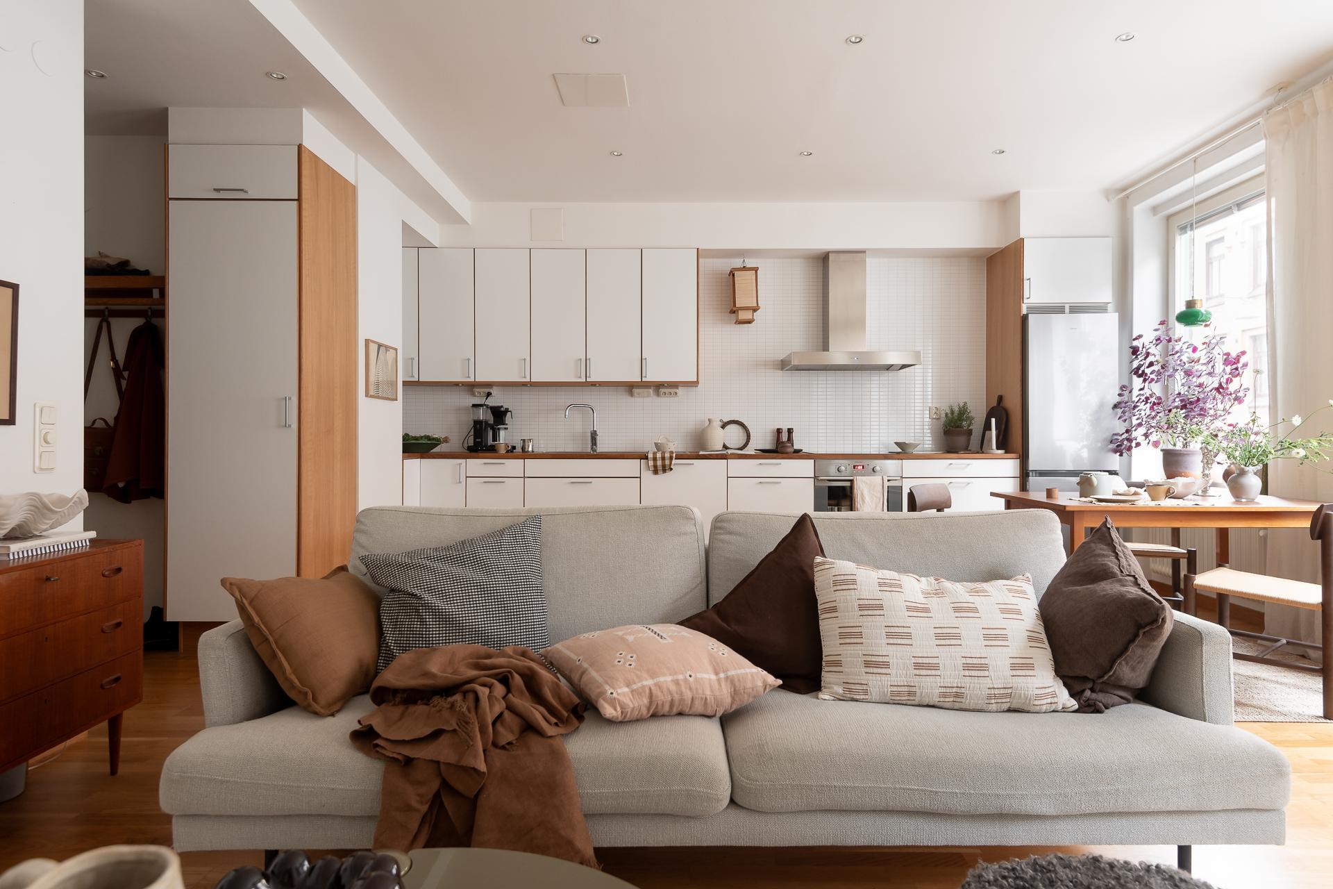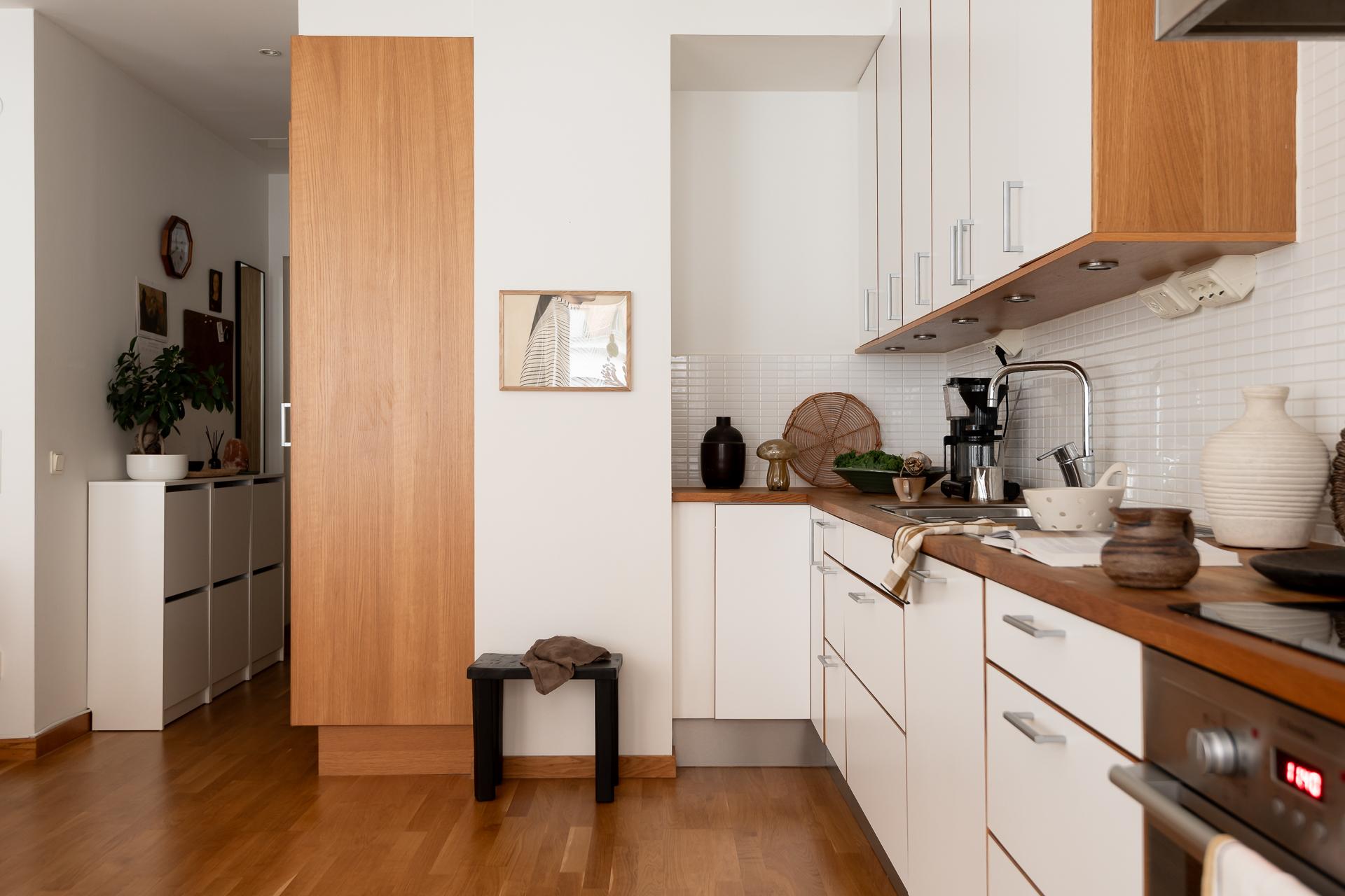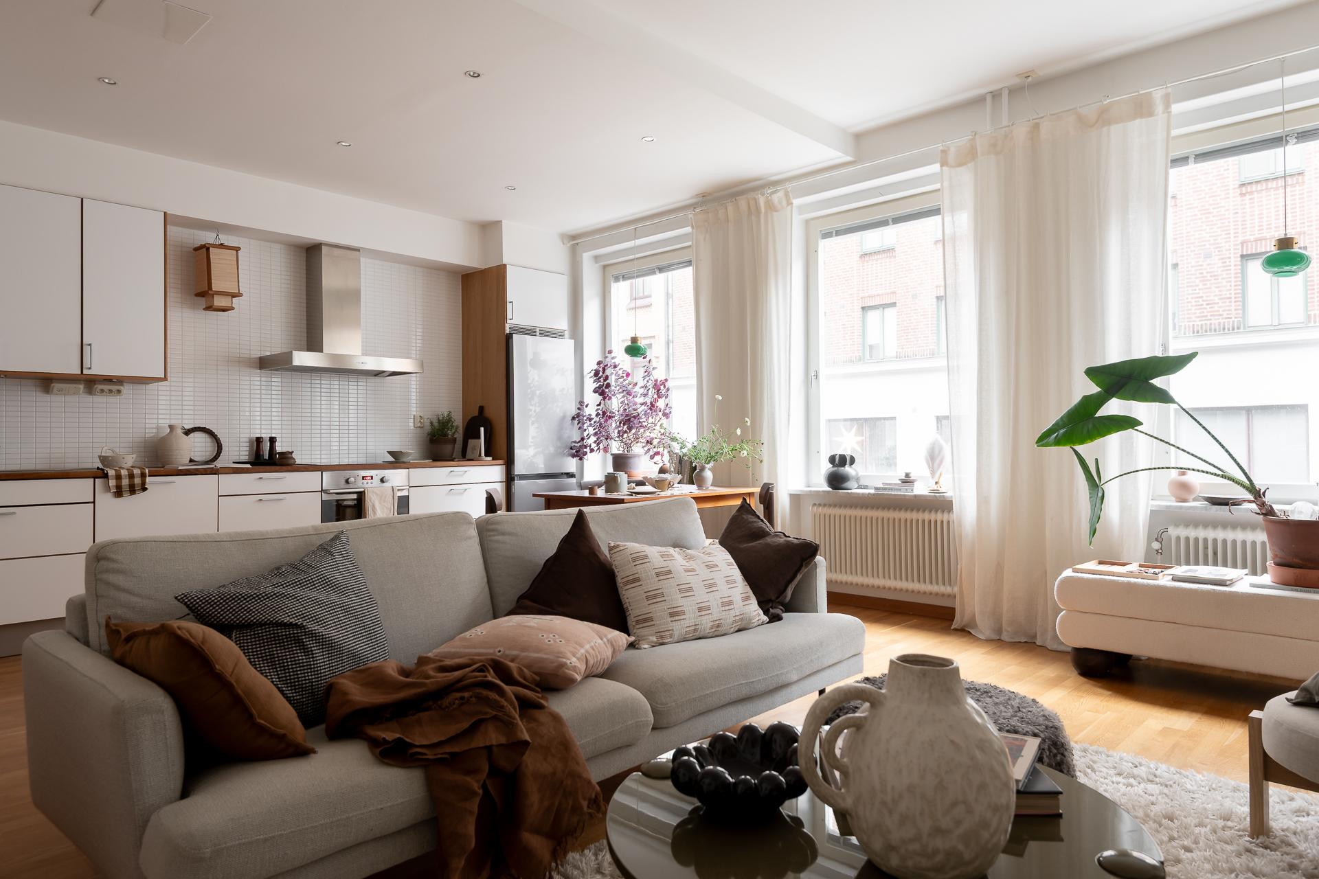 Hela köket är planerat längs lägenhetens ena kortsida och ligger i öppen planlösning ihop med vardagsrummet. Bänkskiva i massiv ek, vita, släta köksluckor och vitvaror av god kvalitet med ny induktonshäll från Electrolux (hösten 2025) och ny kyl/frys från Samsung (hösten 2025). Check på diskmaskin för att underlätta vardagsbestyren. Tre stora fönster på rad ut mot gatan ger inte bara köket utan hela lägenheten ett storslaget ljus. Trots den öppna planlösningen finner man ändå rum i rummen och det är enkelt att avgränsa de olika funktionerna i rummet. Intill fönstren blir en naturlig plats för matbordet men möbleringsalternativen är många. Just fönstren är värda lite extra uppmärksamhet - extra stora och extra många och dessutom vackert renoverade för några år sen.