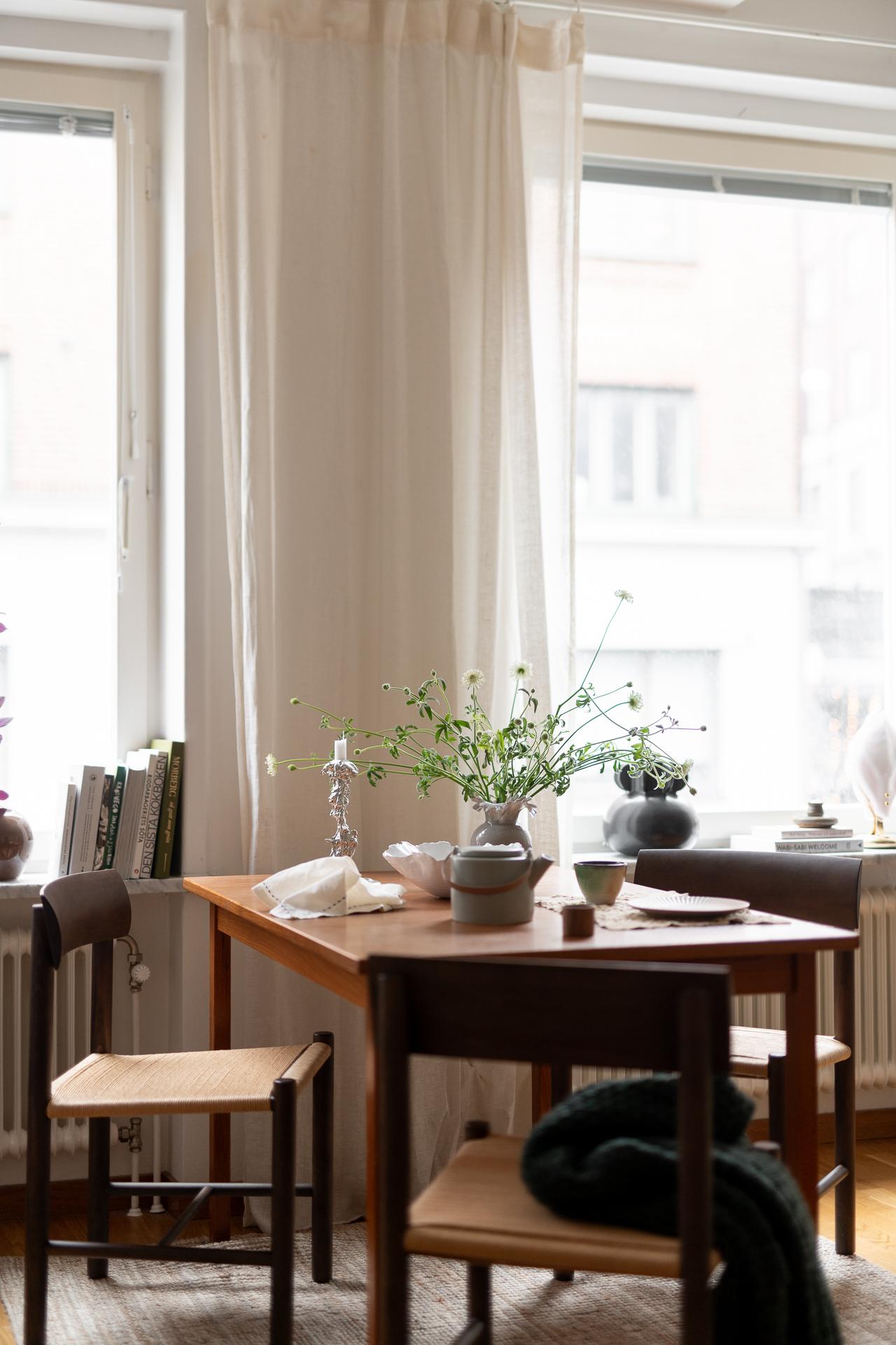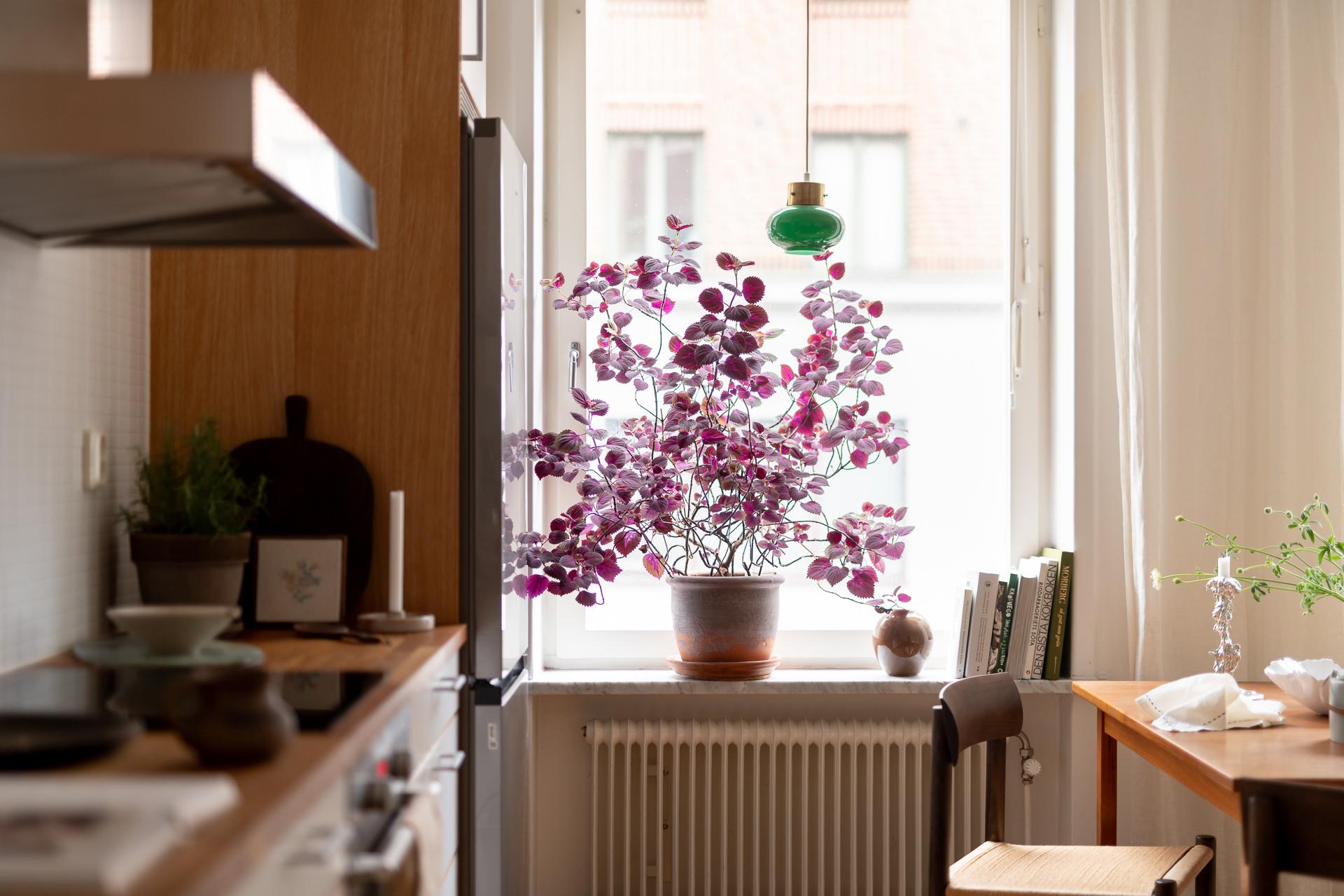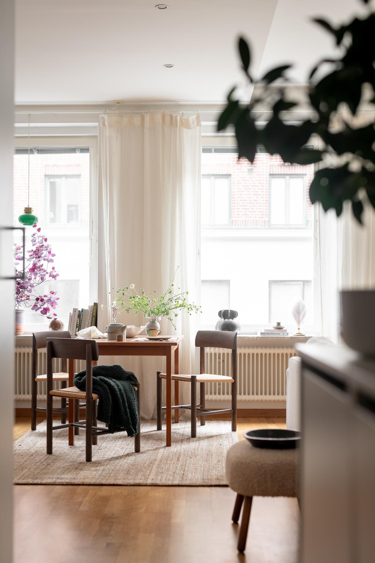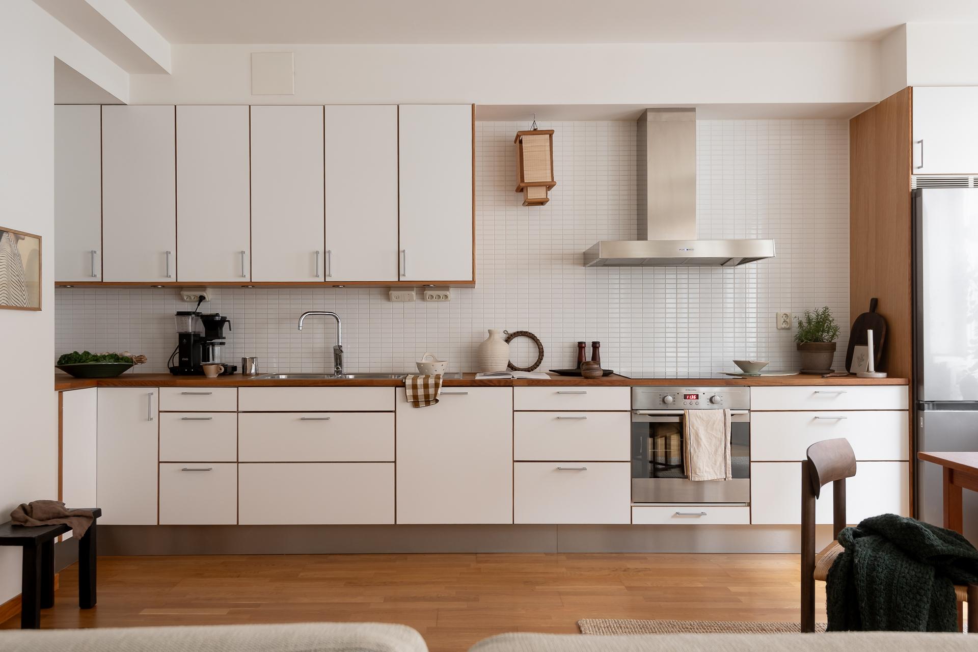Hela köket är planerat längs lägenhetens ena kortsida och ligger i öppen planlösning ihop med vardagsrummet. Bänkskiva i massiv ek, vita, släta köksluckor och vitvaror av god kvalitet med ny induktonshäll från Electrolux (hösten 2025) och ny kyl/frys från Samsung (hösten 2025). Check på diskmaskin för att underlätta vardagsbestyren. Tre stora fönster på rad ut mot gatan ger inte bara köket utan hela lägenheten ett storslaget ljus. Trots den öppna planlösningen finner man ändå rum i rummen och det är enkelt att avgränsa de olika funktionerna i rummet. Intill fönstren blir en naturlig plats för matbordet men möbleringsalternativen är många. Just fönstren är värda lite extra uppmärksamhet - extra stora och extra många och dessutom vackert renoverade för några år sen.