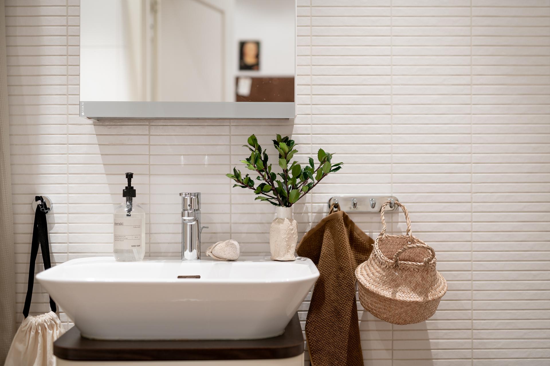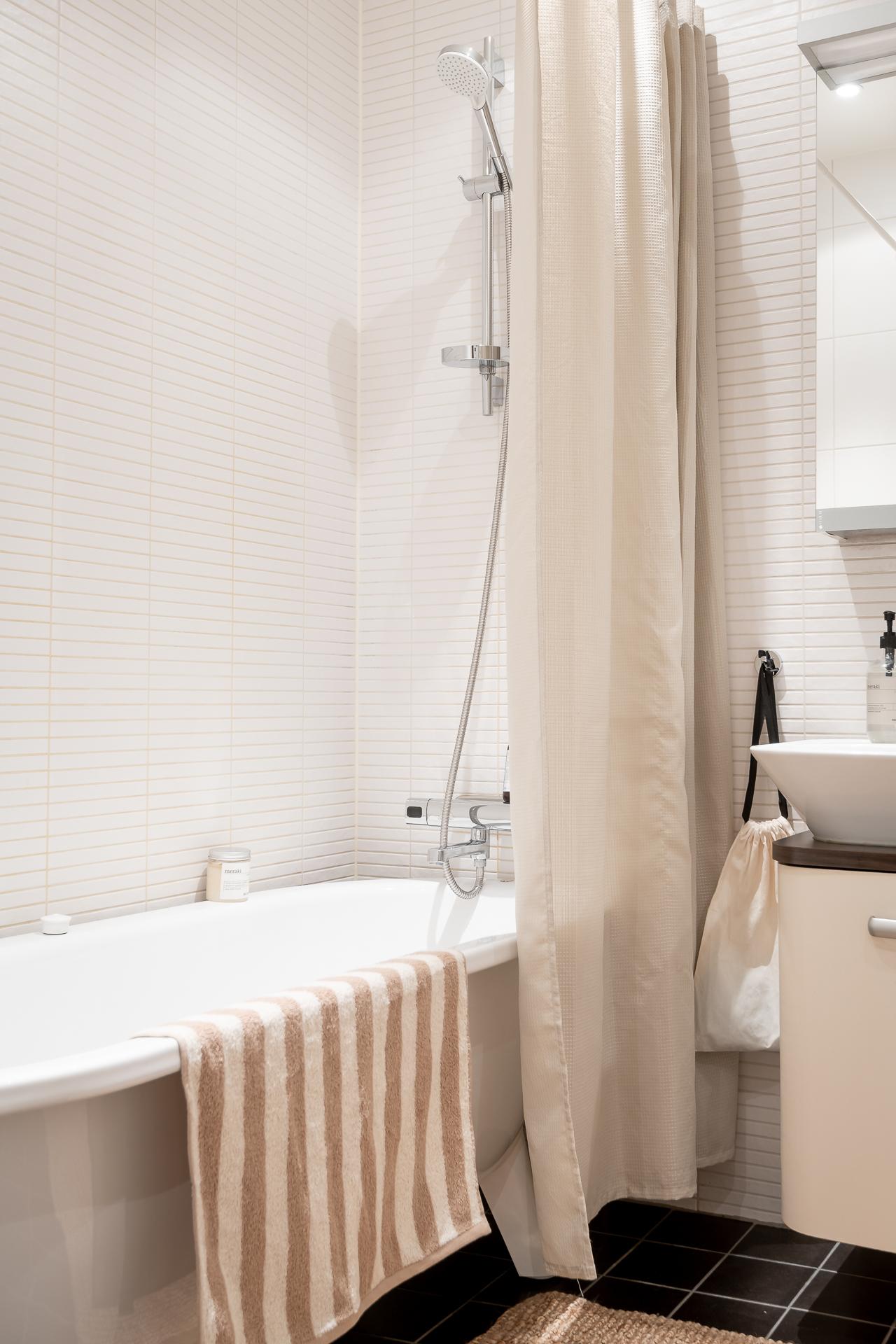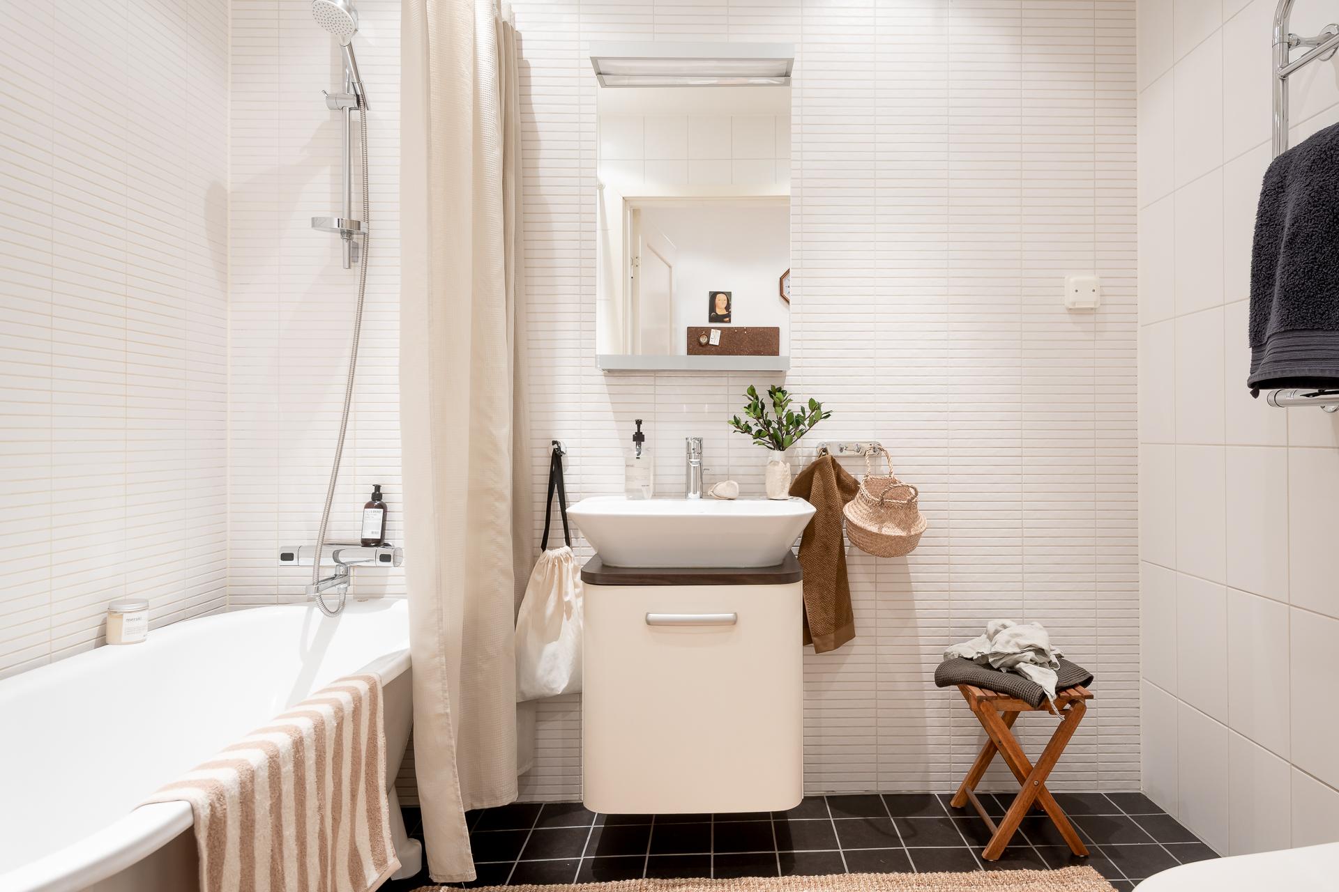 Till vänster i hallen ligger det helkaklade badrummet. Mörkgrå klinker på golvet med underliggande värmeslingor matchar fint med de vita kakelplattorna på väggen. Det är utrustat med badkar, kommod med handfat, vitt spegelskåp, wc-stol och handdukstork. Blandaren i badkaret är ny från 2025 och duschmunstycket är från 2023.