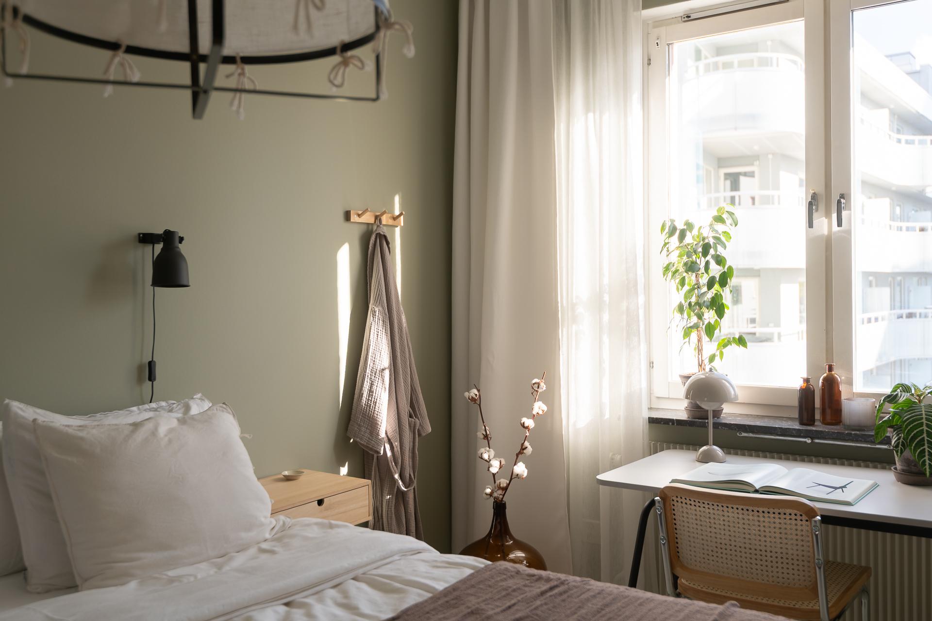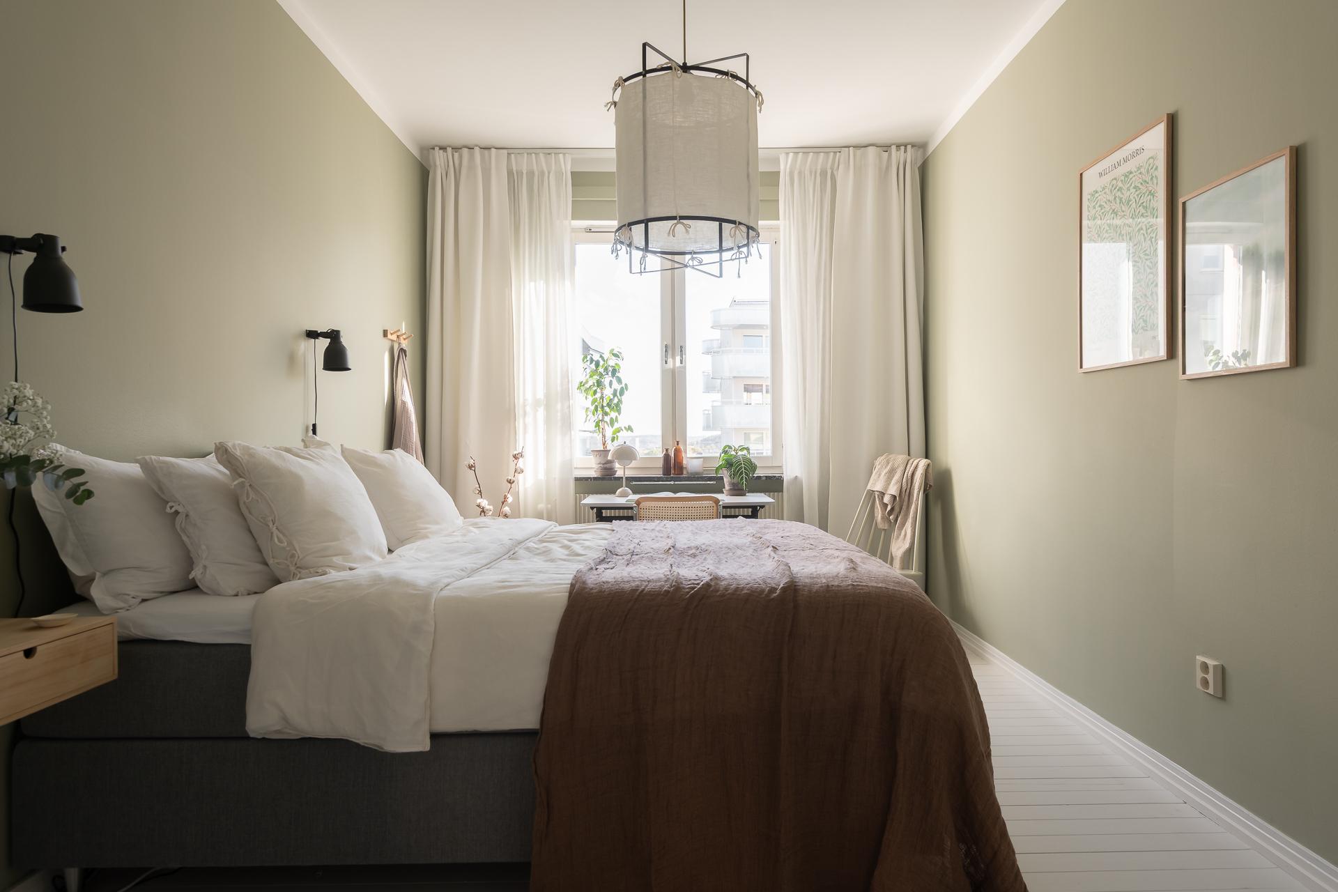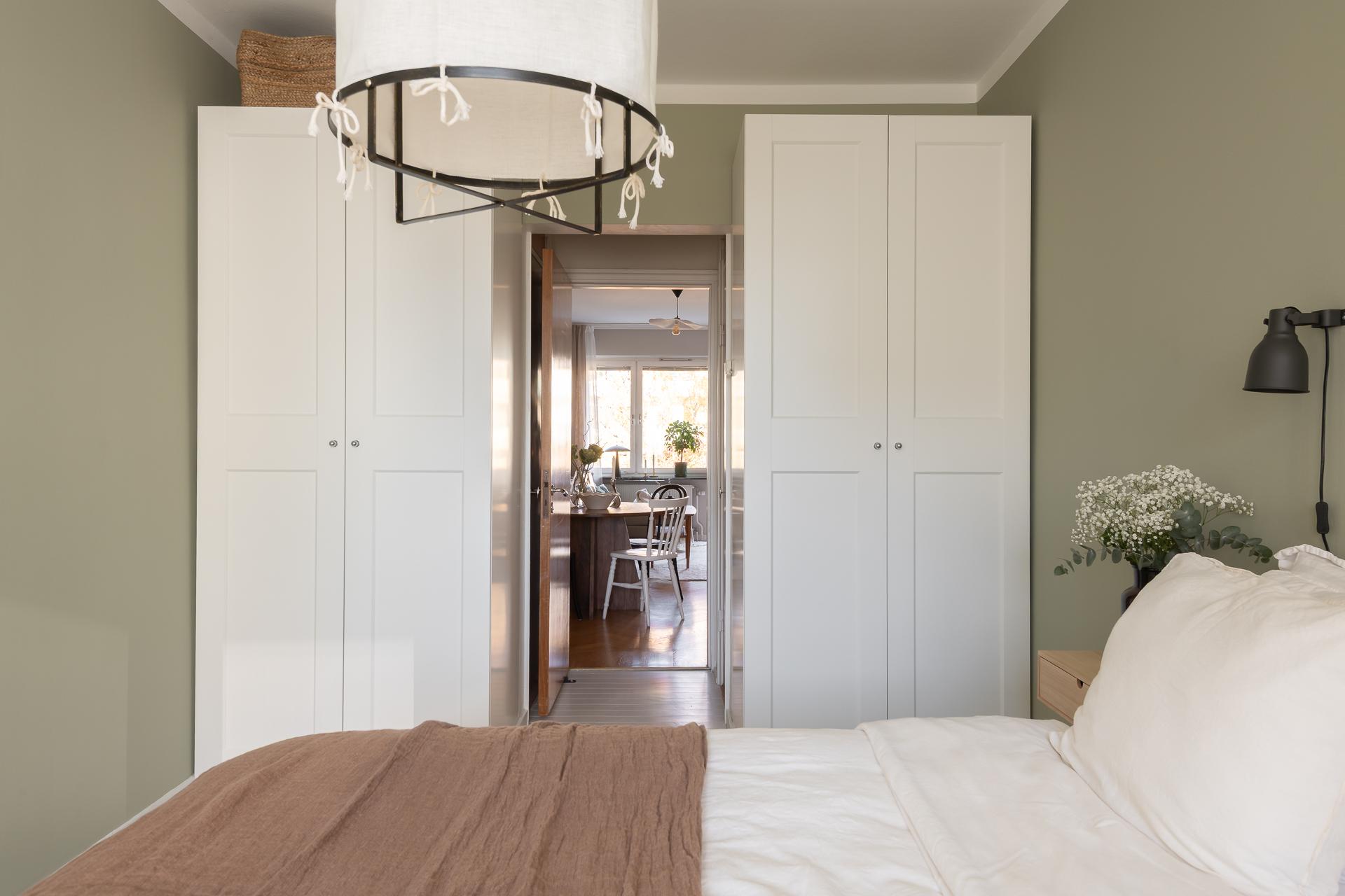 Sovrummet nås via vardagsrummet och bjuder på mycket bra förvaringsmöjligheter, inbyggda garderober med överskåp i original möter oss direkt innanför dörren, lite längre in finns flertalet garderober i fullhöjd. Detta är ett mycket rymligt rum som rymmer både dubbelsäng med sidobord samt arbetshörna. Rummets väggar är målade i en skön grön nyans och golvet består av ett ljusmålat plankgolv.