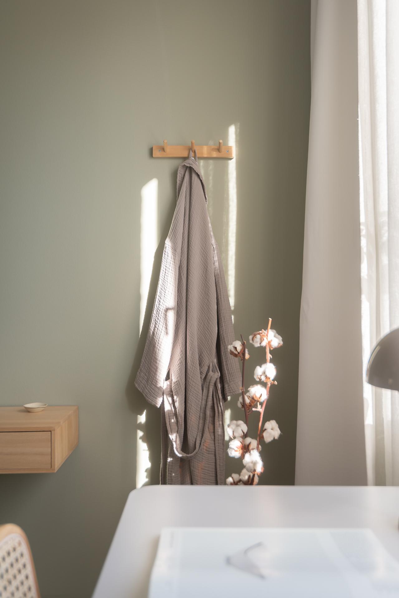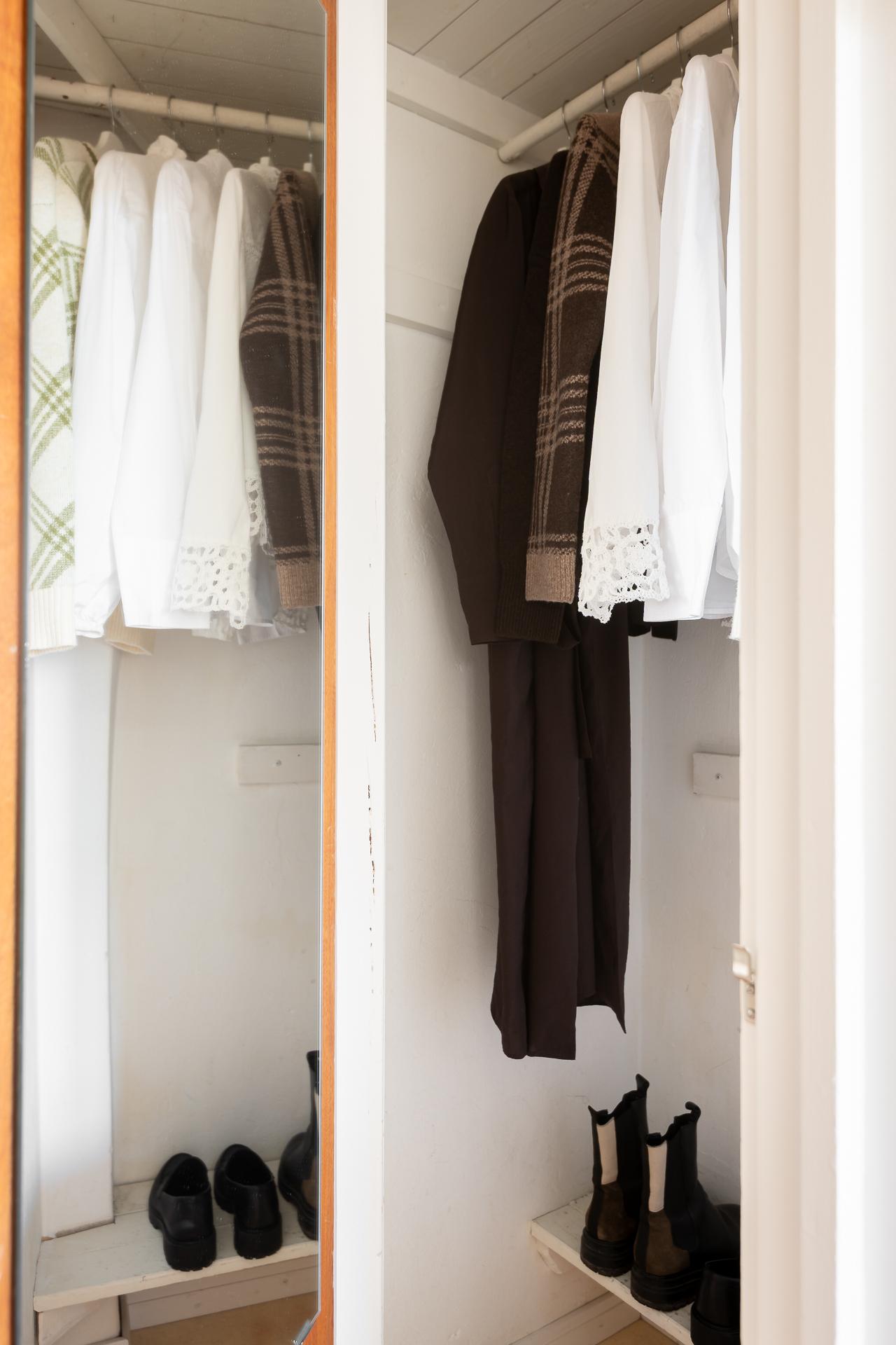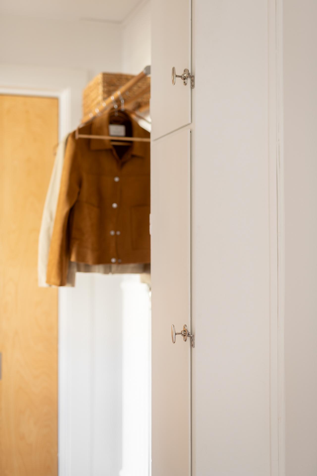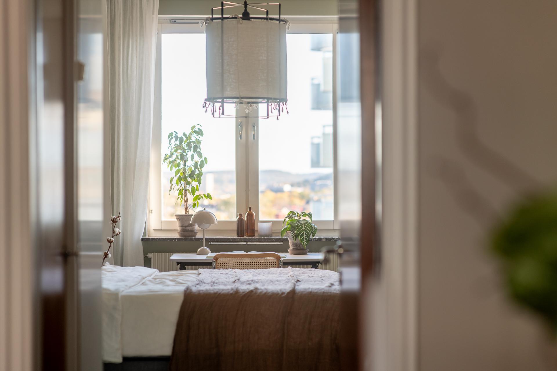 Sovrummet nås via vardagsrummet och bjuder på mycket bra förvaringsmöjligheter, inbyggda garderober med överskåp i original möter oss direkt innanför dörren, lite längre in finns flertalet garderober i fullhöjd. Detta är ett mycket rymligt rum som rymmer både dubbelsäng med sidobord samt arbetshörna. Rummets väggar är målade i en skön grön nyans och golvet består av ett ljusmålat plankgolv.