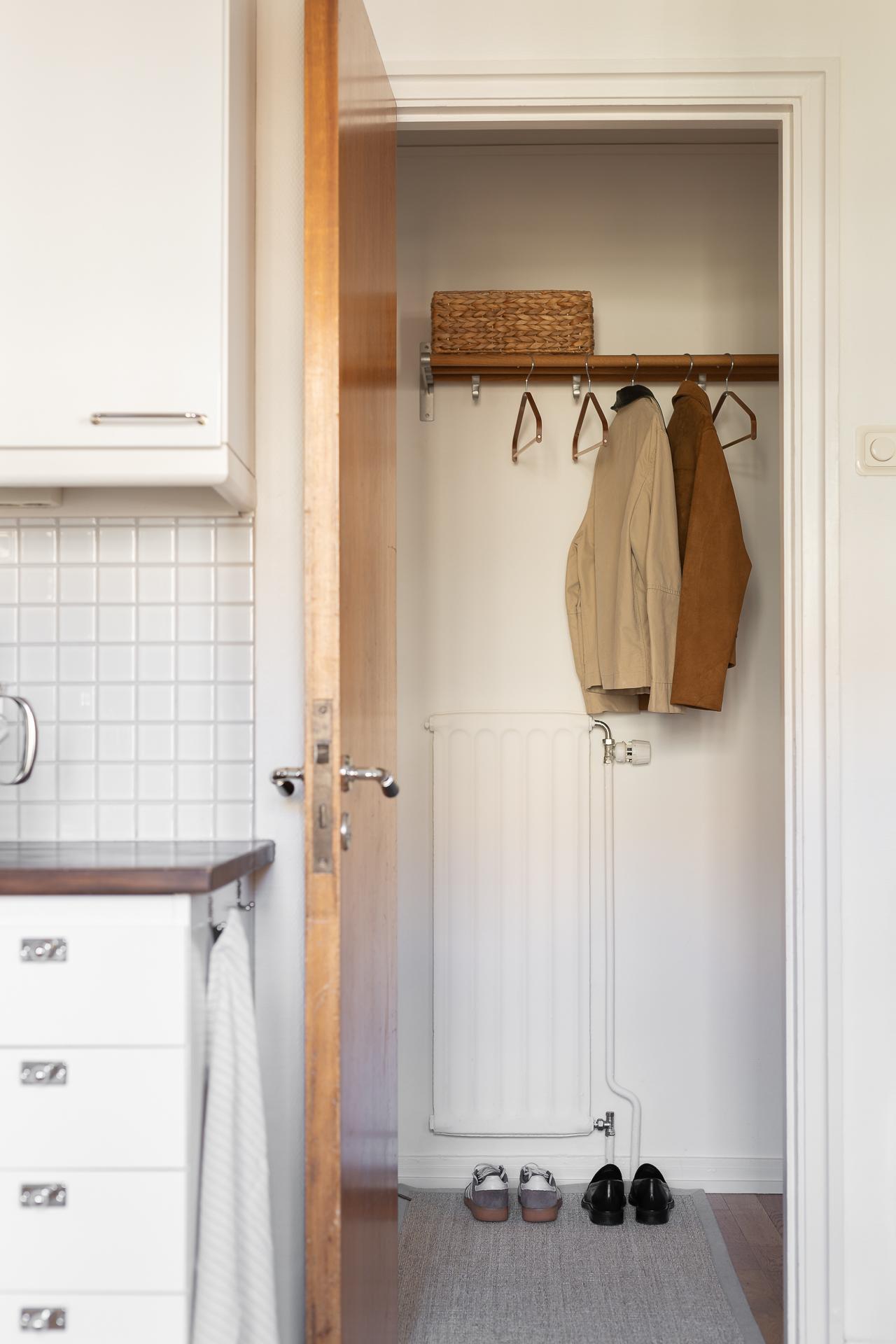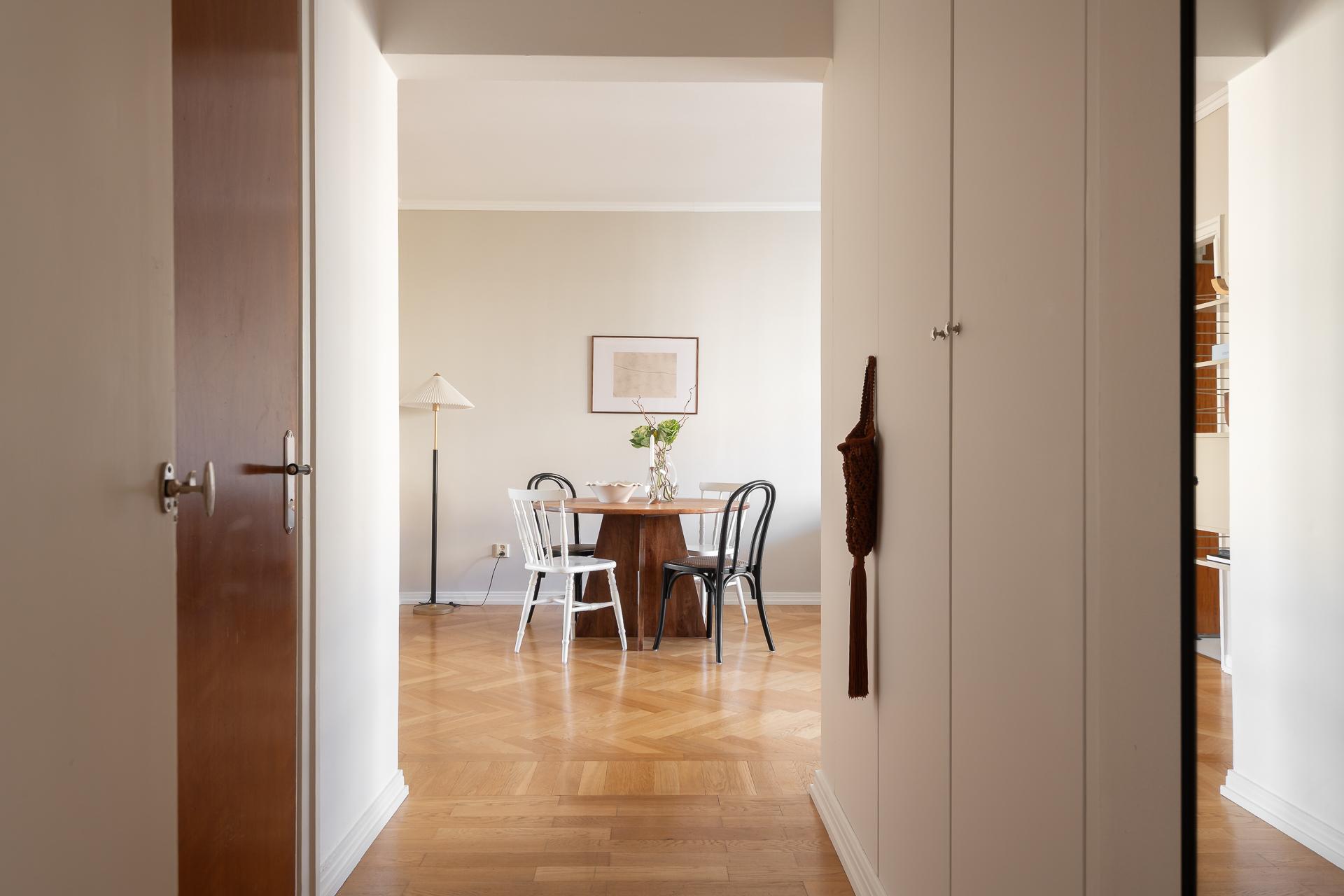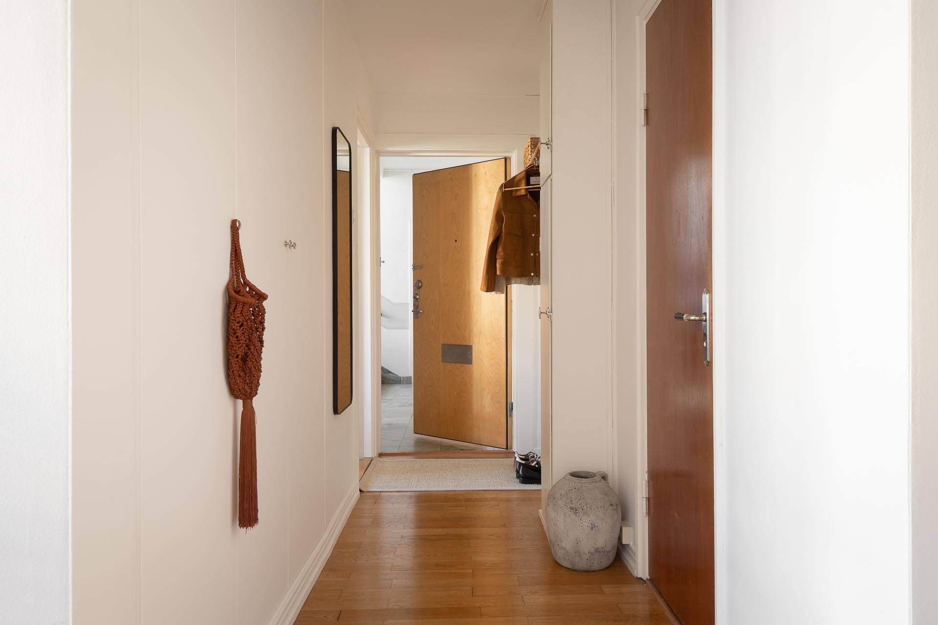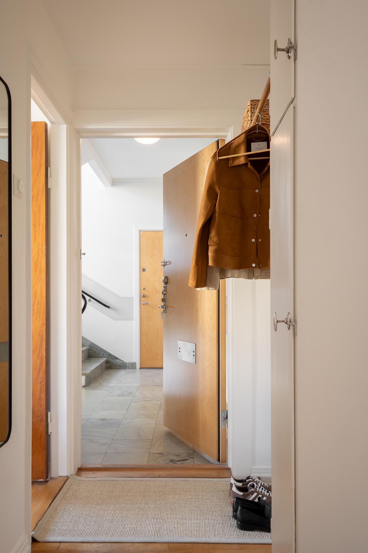 Trapphuset på Lemansgatan 6 är prydligt och inbjudande och mycket av den tidstypiska andan lever kvar. Ta de vackra stentrapporna eller hissen från gatuplan upp till våning sex och stig på! Direkt innanför dörren får vi en fin vy in mot vardagsrum och kök. Gott om utrymme för jackavhängning och bra förvaringsmöjligheter erbjuds i flertalet garderober samt hatthylla. Hallen har vita väggar i och golvet är belagt med parkett. Hallen fungerar som lägenhetens nav och härifrån når man kök, vardagsrum samt badrum.