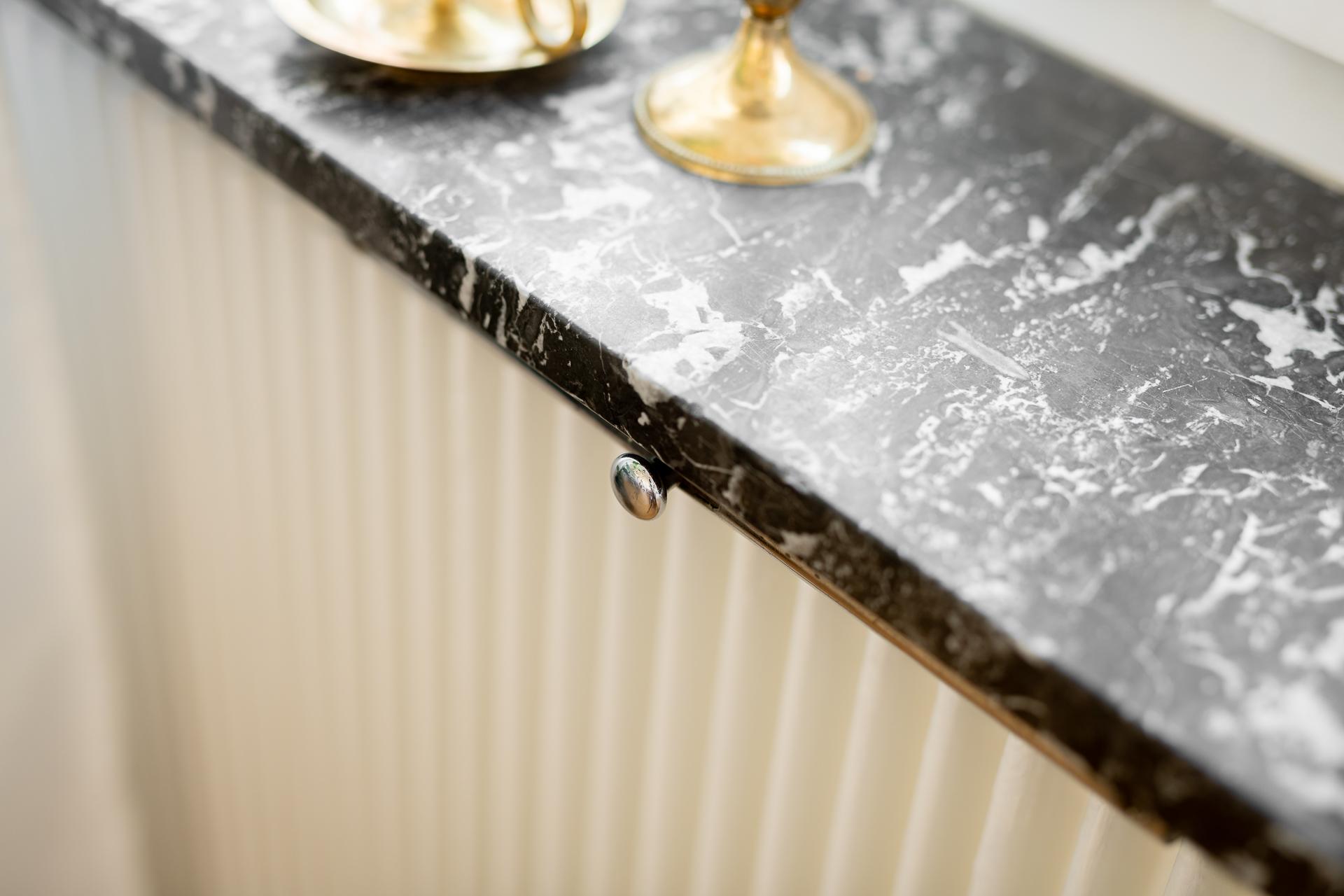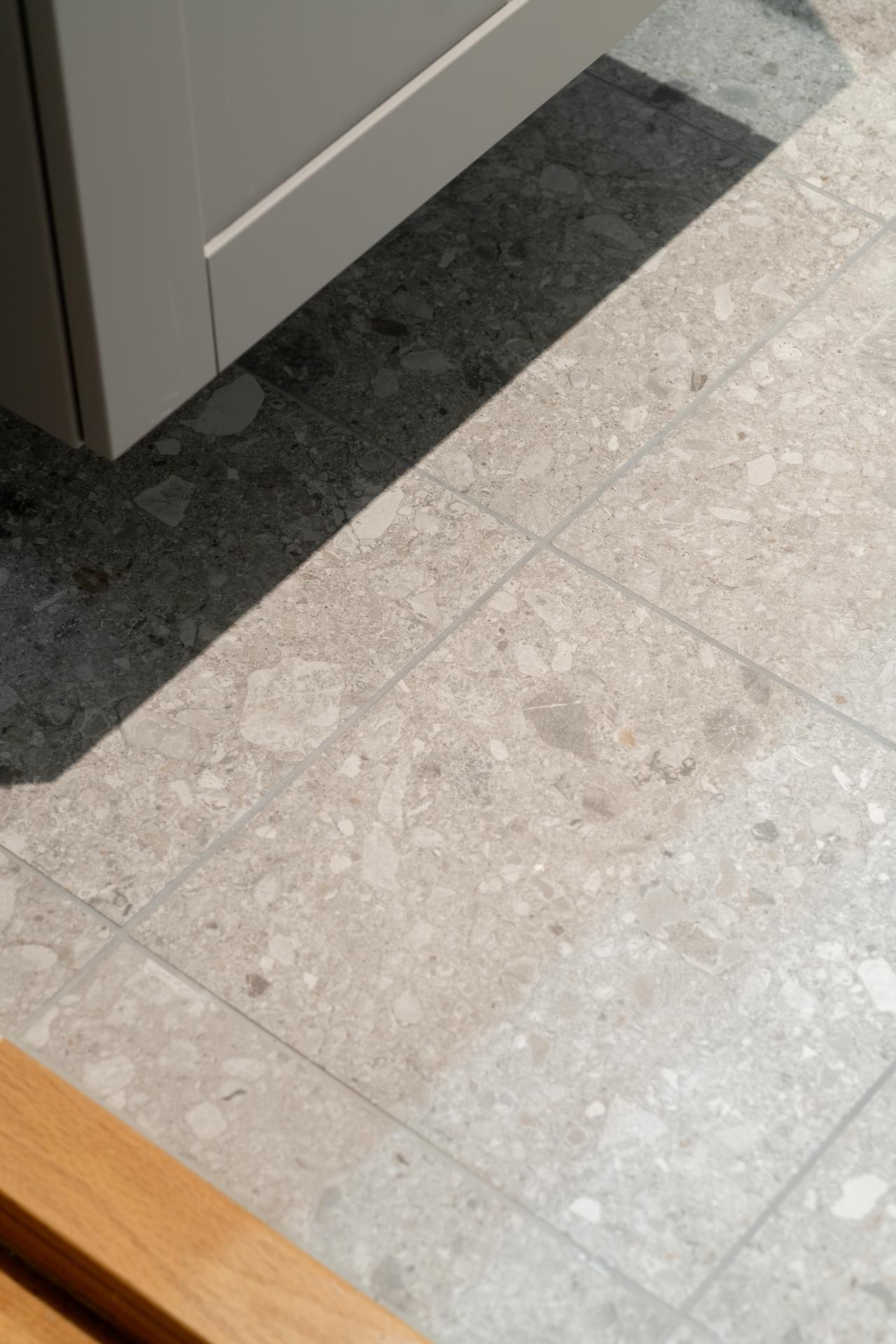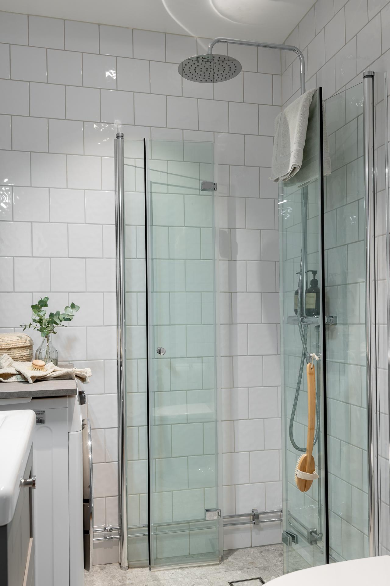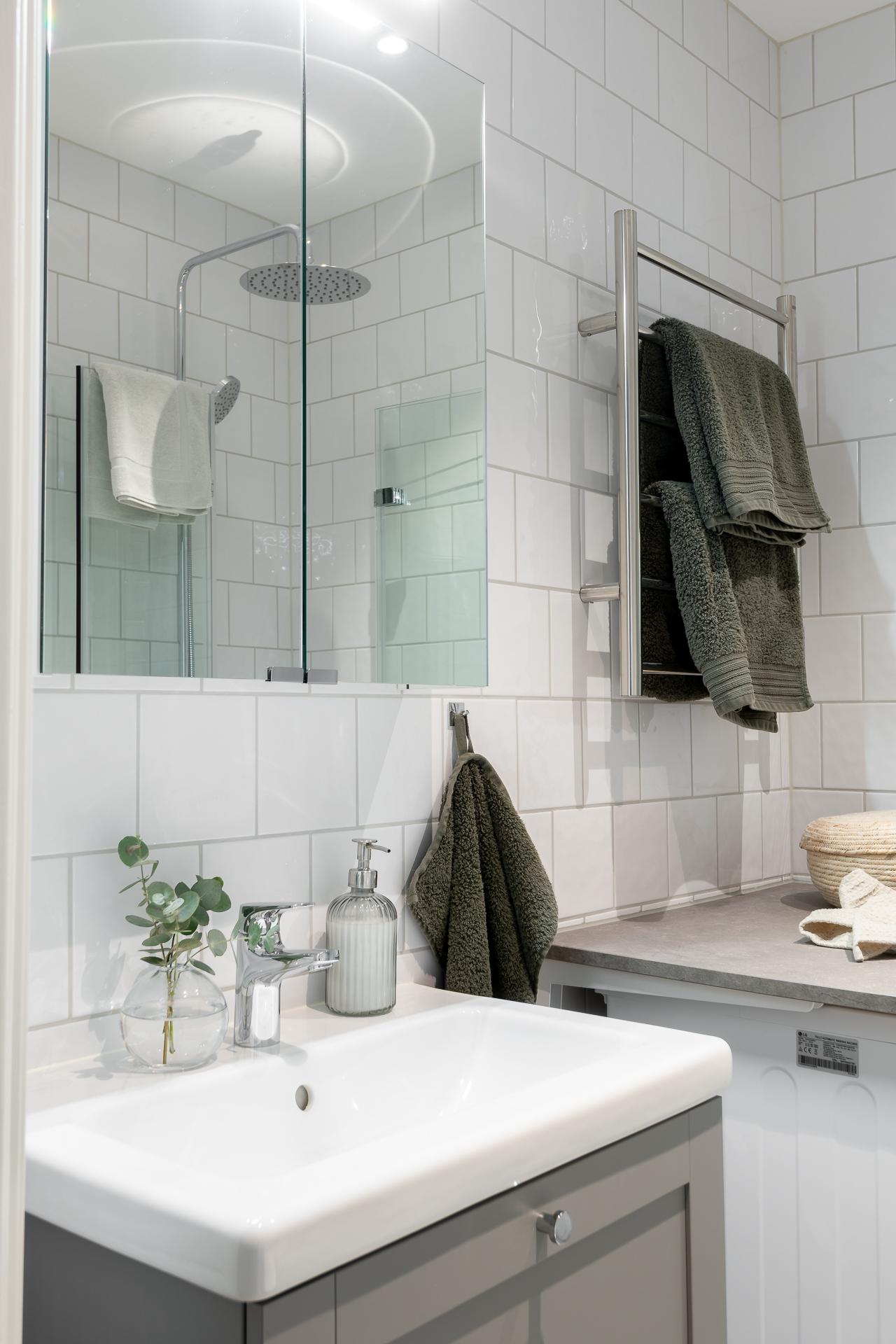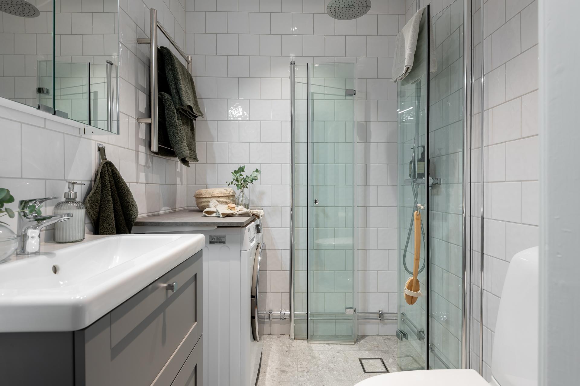 Badrummet totalrenoverades under 2024 i klassiska, tidlösa färger och smakfulla materialval. Här inryms duschhörna med infällbara glasdörrar samt hand och takdusch, handfat med kommod, spegelskåp, WC, samt kombinerad tvättmaskin. Väggarna är klädda med vitt kvadratiskt kakel och golvet är klätt med grått terazzo klinker med underliggande golvvärme. Elektrisk handdukstork. Kvalitetsdokument finns.