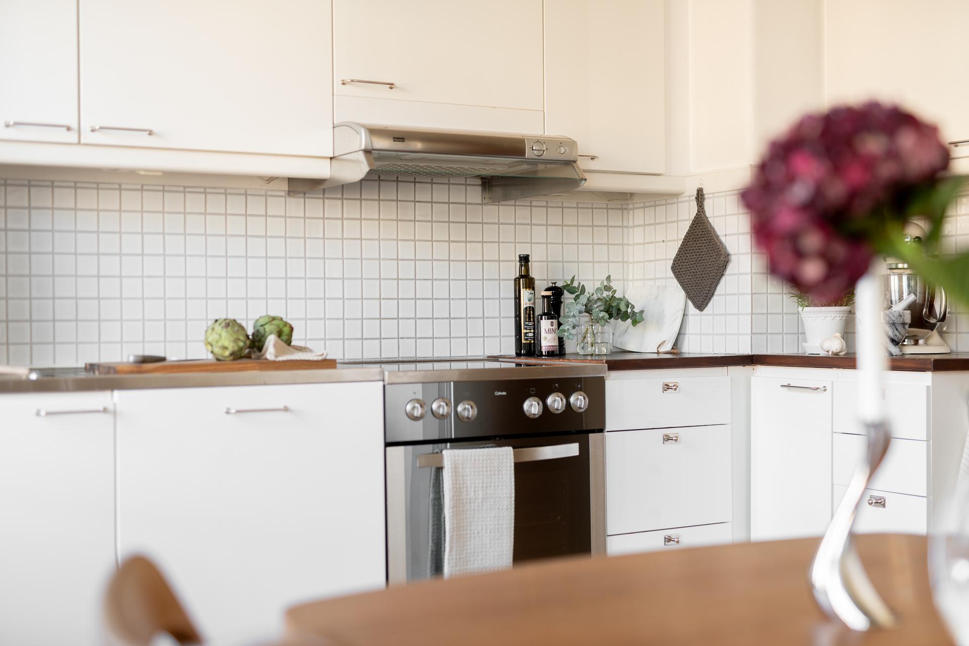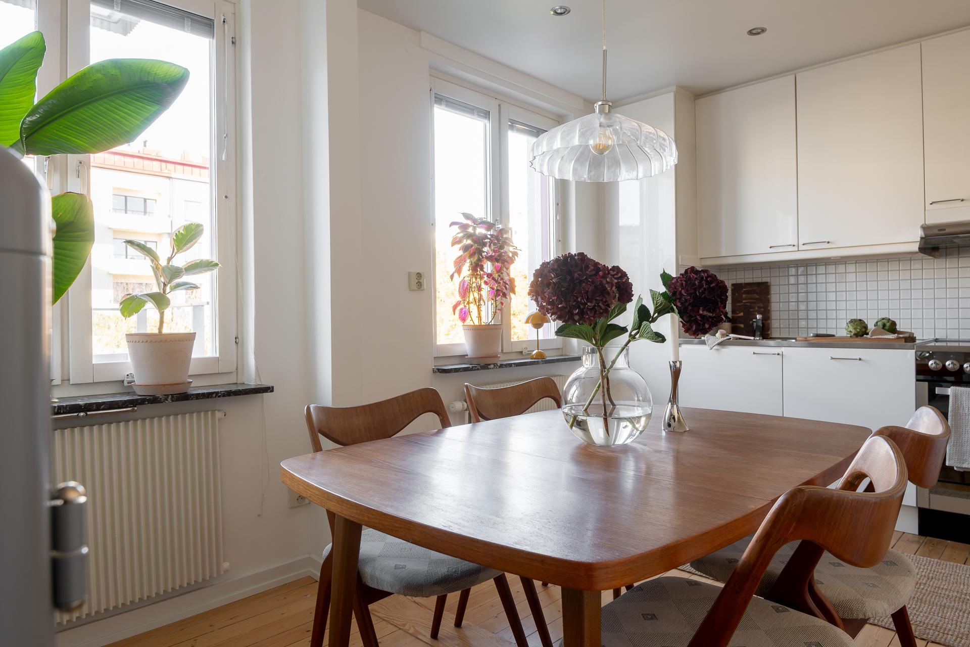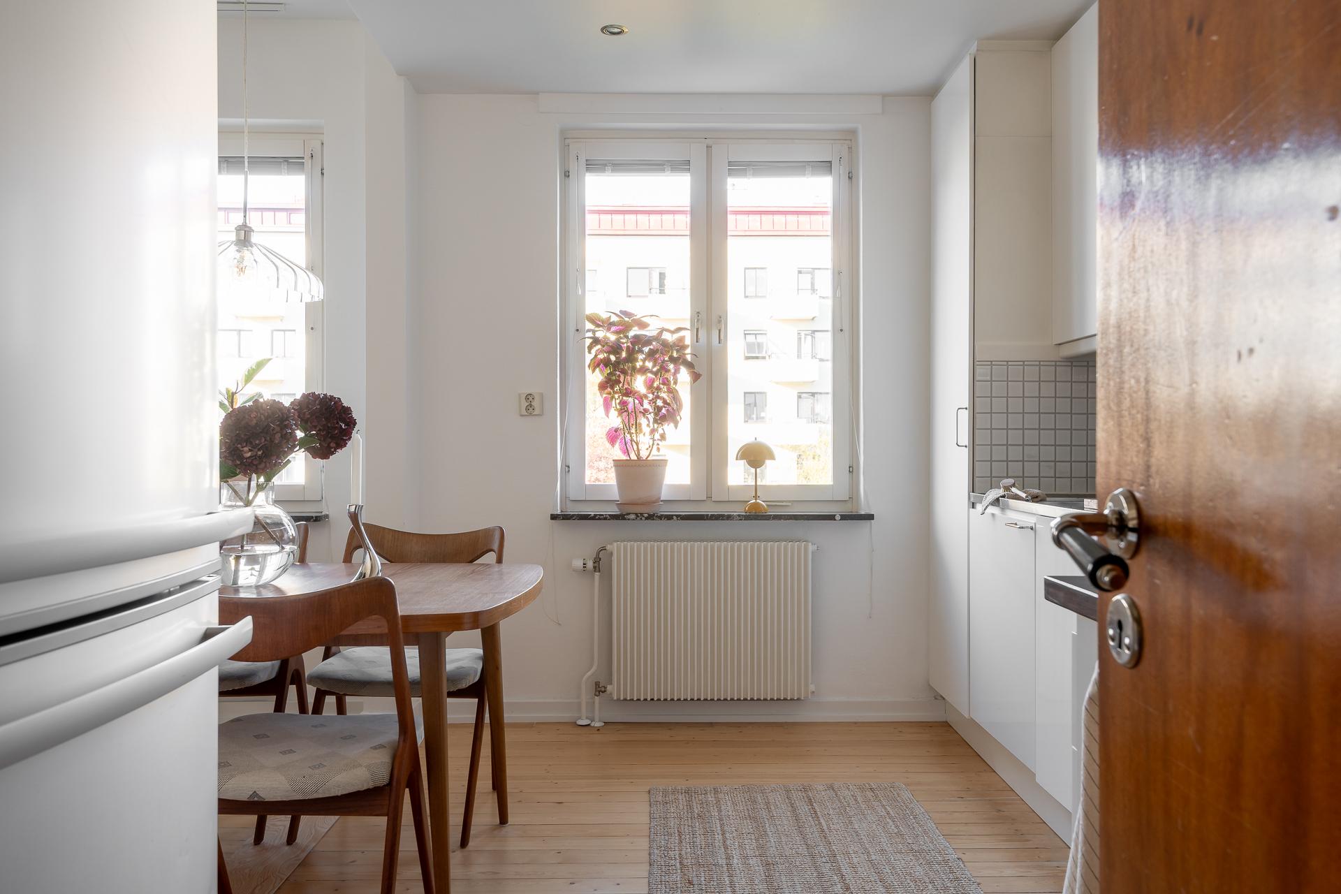 I köket strömmar ljuset och kvällssolen in genom stora fönster i nordväst. Här finns för den som vill möjlighet att skapa ett ytterligare rum, se alternativ planskiss. Köket är mycket välplanerat, och det är rejält tilltaget med förvaring i både över och underskåp. Inredningen har vita släta luckor, köksbänkar i rostfritt stål samt ek, partierna ovanför bänkarna är klädda med vitt kvadratiskt kakel. Maskinell utrustning består av diskmaskin, spis, fläkt samt kyl och frys. Väggarna är ljusa och på golvet ligger ett plankgolv.
