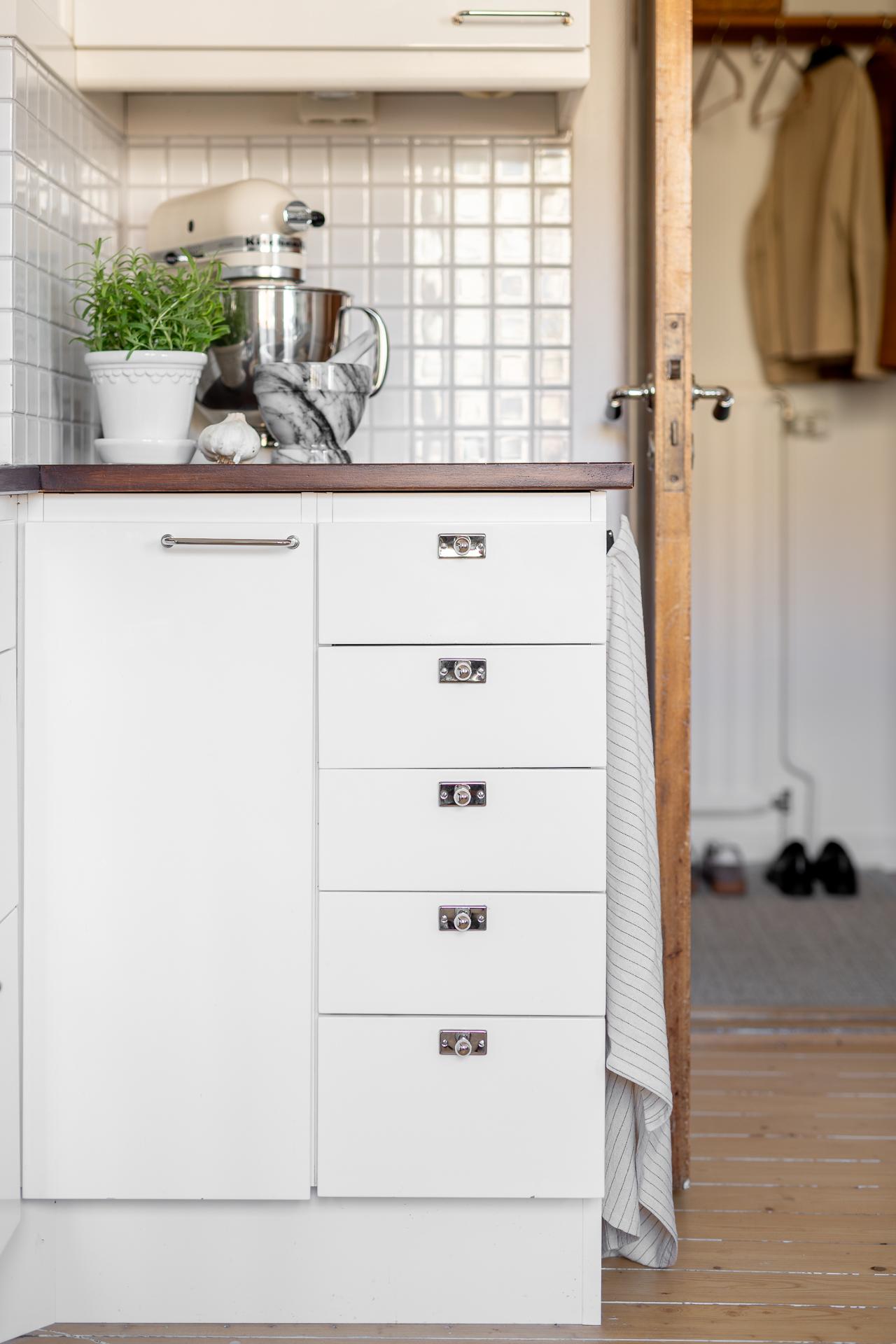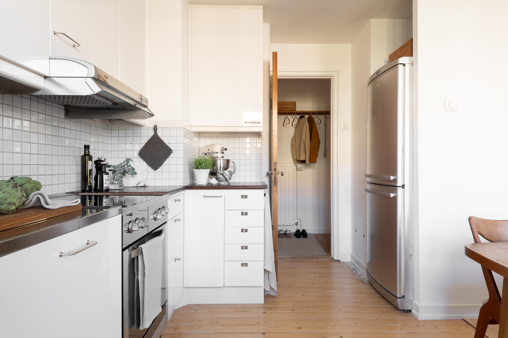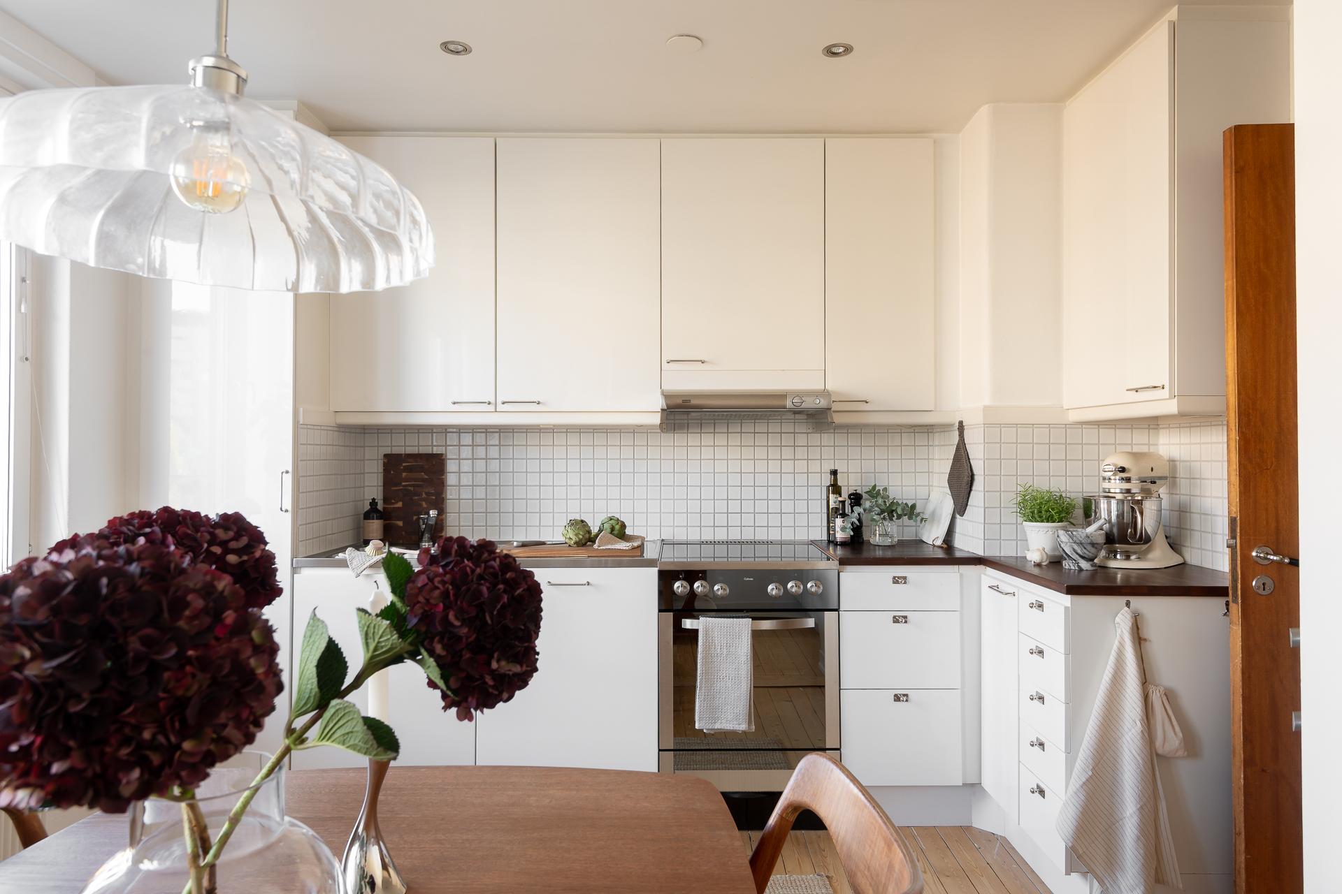 I köket strömmar ljuset och kvällssolen in genom stora fönster i nordväst. Här finns för den som vill möjlighet att skapa ett ytterligare rum, se alternativ planskiss. Köket är mycket välplanerat, och det är rejält tilltaget med förvaring i både över och underskåp. Inredningen har vita släta luckor, köksbänkar i rostfritt stål samt ek, partierna ovanför bänkarna är klädda med vitt kvadratiskt kakel. Maskinell utrustning består av diskmaskin, spis, fläkt samt kyl och frys. Väggarna är ljusa och på golvet ligger ett plankgolv.