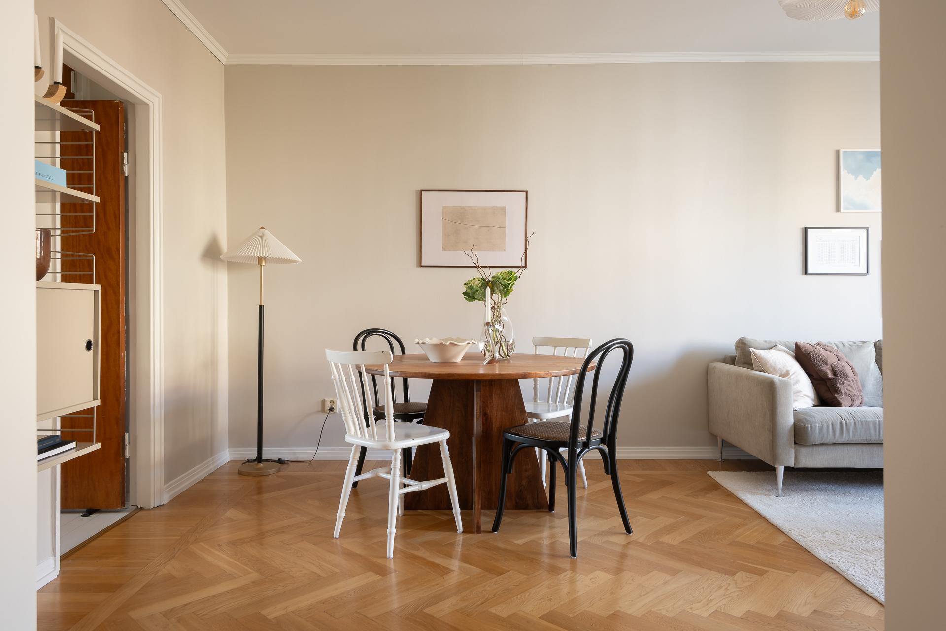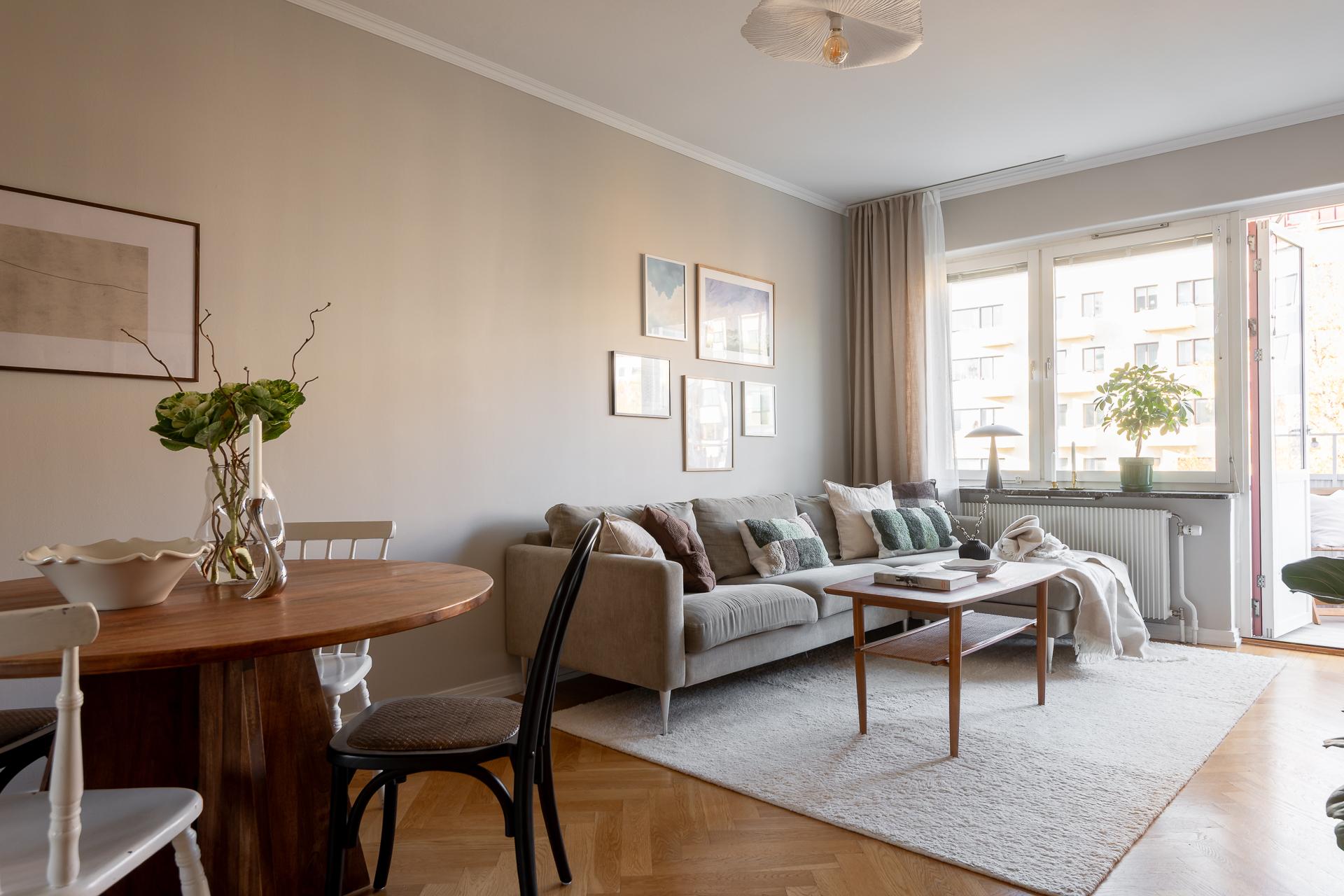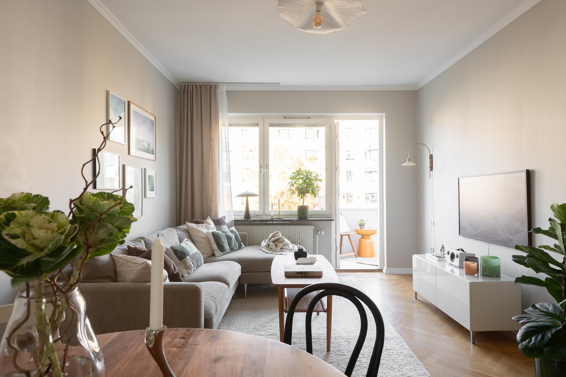 Vardagsrummet är stilfullt och vilsamt med väl tilltagna ytor, med plats för både soffgrupp, matplats och förvaringsmöbler. Här är det lätt att trivas och det är här man samlas och umgås. Den genomgående planlösningen, takhöjden och de stora fönstren ger lägenheten ett otroligt härligt ljusflöde och luftig atmosfär. Rummet förlängs av den rymliga balkongen som bjuder på många härliga soltimmar från tidig vår till sen höst. Rummets väggar är ljusa och på golvet ligger vacker fiskbensparkett.