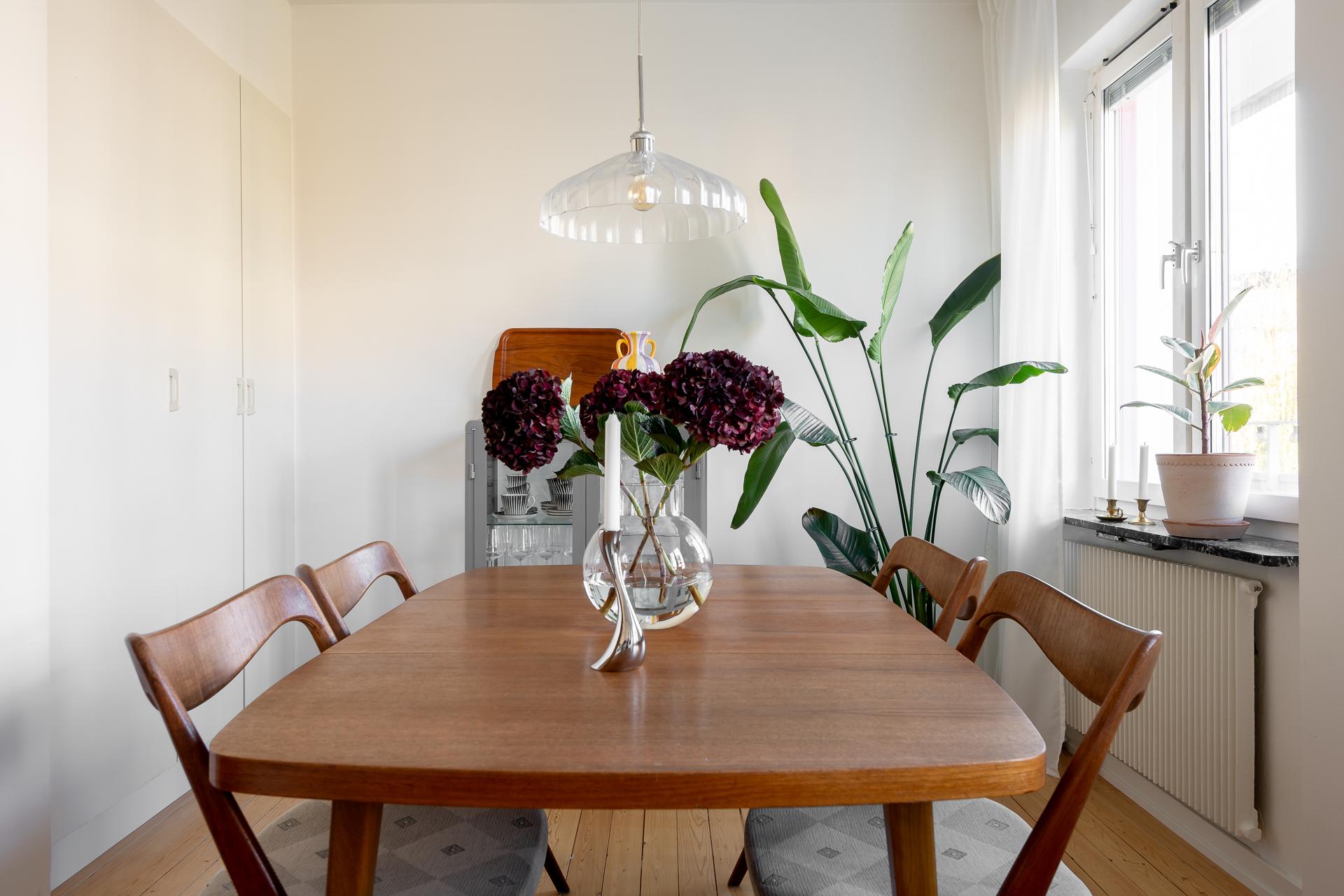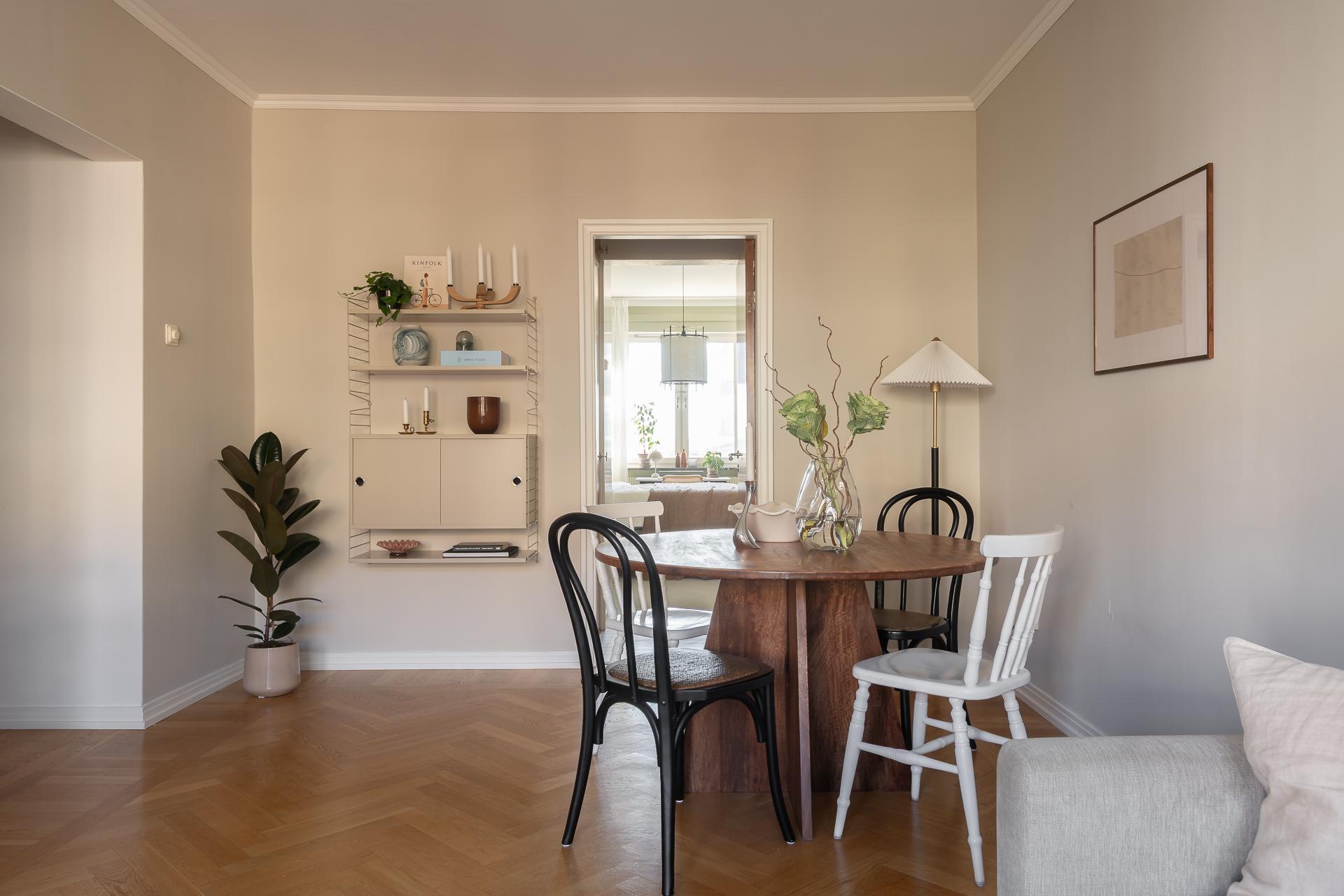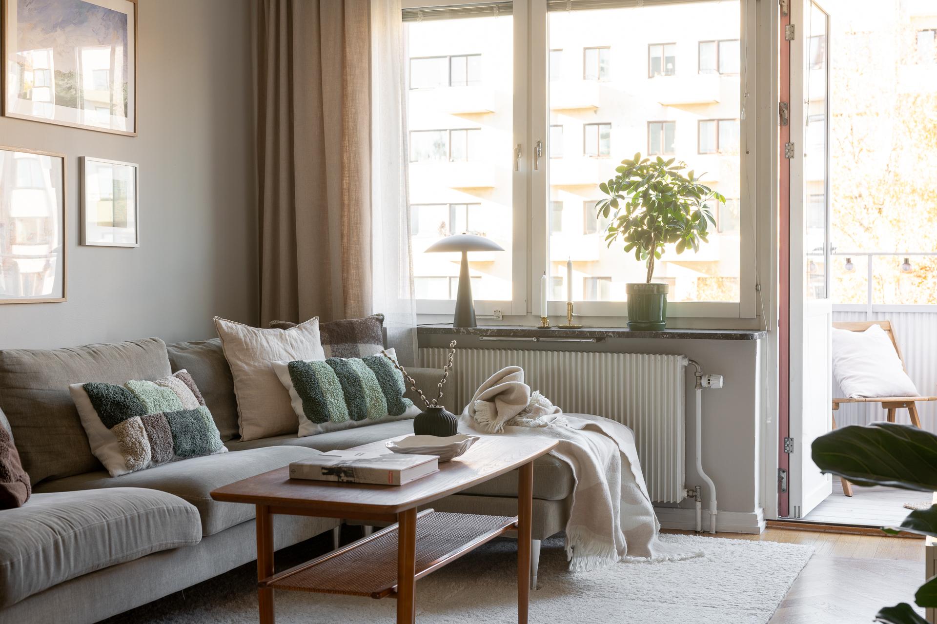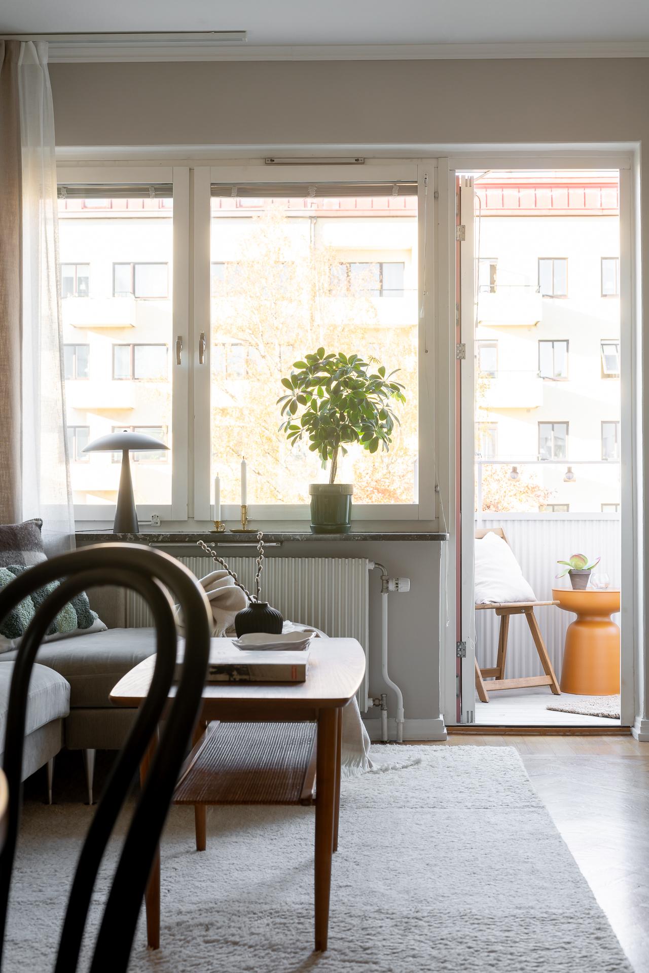 Vardagsrummet är stilfullt och vilsamt med väl tilltagna ytor, med plats för både soffgrupp, matplats och förvaringsmöbler. Här är det lätt att trivas och det är här man samlas och umgås. Den genomgående planlösningen, takhöjden och de stora fönstren ger lägenheten ett otroligt härligt ljusflöde och luftig atmosfär. Rummet förlängs av den rymliga balkongen som bjuder på många härliga soltimmar från tidig vår till sen höst. Rummets väggar är ljusa och på golvet ligger vacker fiskbensparkett.