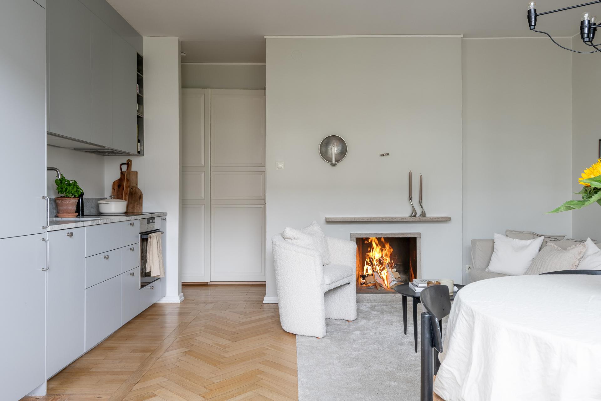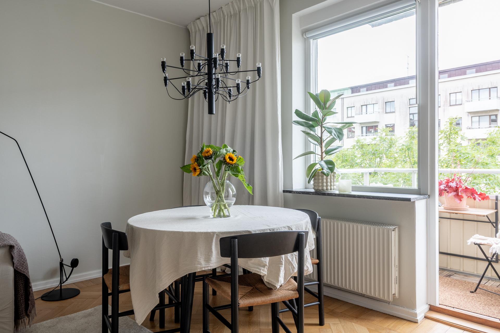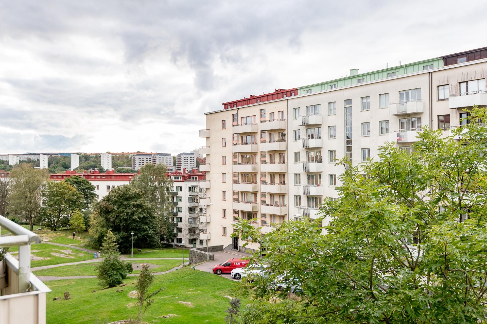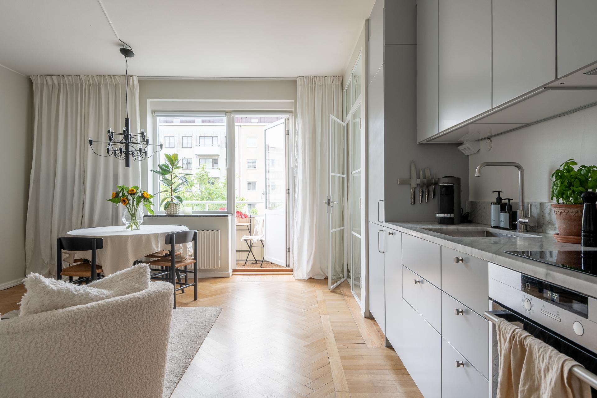 Tack vare sin generösa takhöjd och smarta planlösning känns denna smakfullt renoverade funkispärla betydligt större än vad antalet kvadratmeter anger. Vardagsrummet och köket förenas i en öppen sällskapsyta som växer när dörren ut till balkongen står öppen. Balkongen badar i sol, och utsikten över den parklika grönytan bakom huset ända bort mot Guldhedens höjder är intagande. Ljuset strömmar in, och efter att kvällsmörkret väl lagt sig är det mysigt att elda i den vackra öppna spisen. Lägenheten passar bra för såväl en singel som ett par, och en snygg industrivägg i glas och vitt smide skiljer av en mysig sovalkov med plats för en 140-säng. Alkoven har eget fönster och känns som ett riktigt sovrum. Läget är perfekt, och här bor man i rofyllda funkiskvarter med Chalmers campus inom ett stenkast och Avenyns puls på kort promenadavstånd. Dessutom är det en välskött förening med goda hyresintäkter från lokaler och hyresrätter.