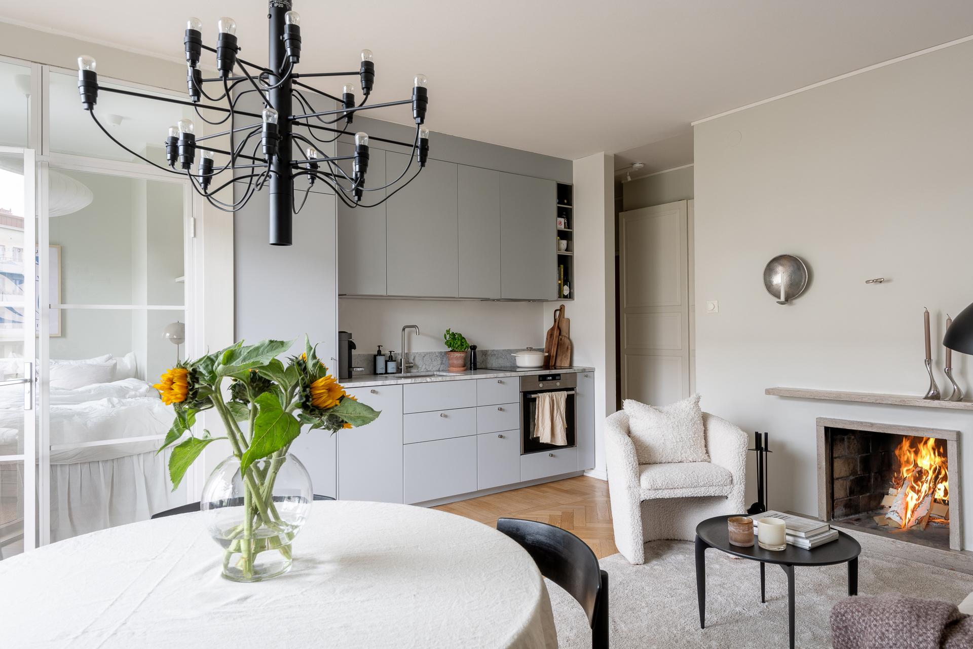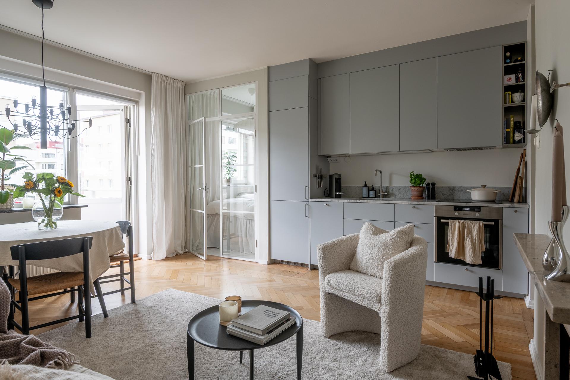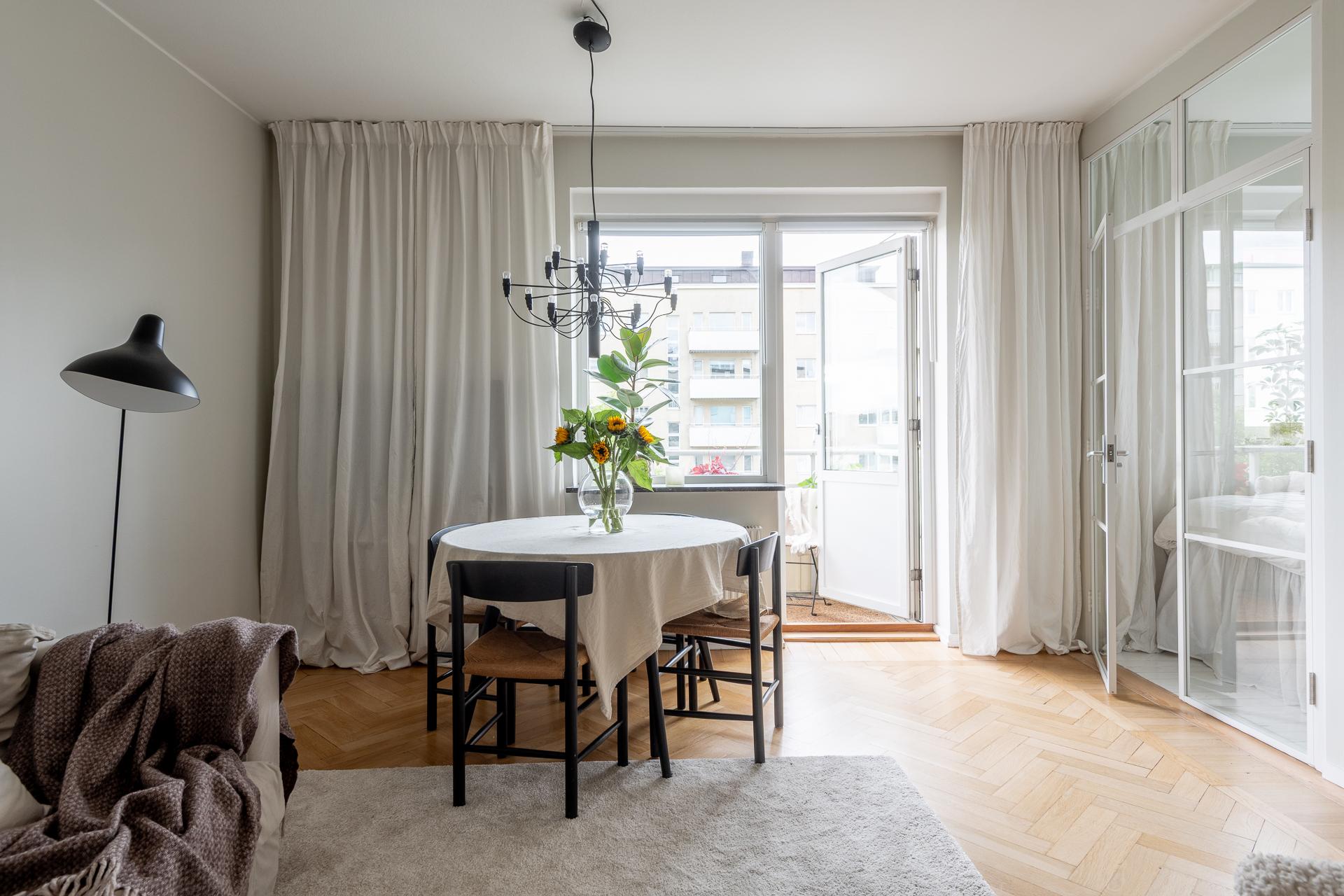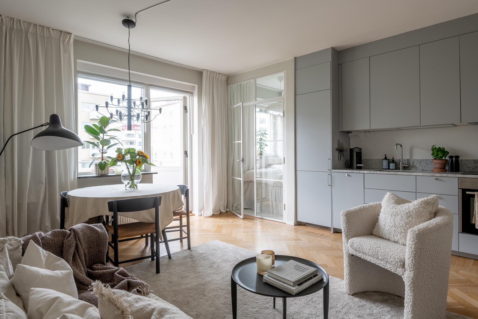 Tack vare sin generösa takhöjd och smarta planlösning känns denna smakfullt renoverade funkispärla betydligt större än vad antalet kvadratmeter anger. Vardagsrummet och köket förenas i en öppen sällskapsyta som växer när dörren ut till balkongen står öppen. Balkongen badar i sol, och utsikten över den parklika grönytan bakom huset ända bort mot Guldhedens höjder är intagande. Ljuset strömmar in, och efter att kvällsmörkret väl lagt sig är det mysigt att elda i den vackra öppna spisen. Lägenheten passar bra för såväl en singel som ett par, och en snygg industrivägg i glas och vitt smide skiljer av en mysig sovalkov med plats för en 140-säng. Alkoven har eget fönster och känns som ett riktigt sovrum. Läget är perfekt, och här bor man i rofyllda funkiskvarter med Chalmers campus inom ett stenkast och Avenyns puls på kort promenadavstånd. Dessutom är det en välskött förening med goda hyresintäkter från lokaler och hyresrätter.