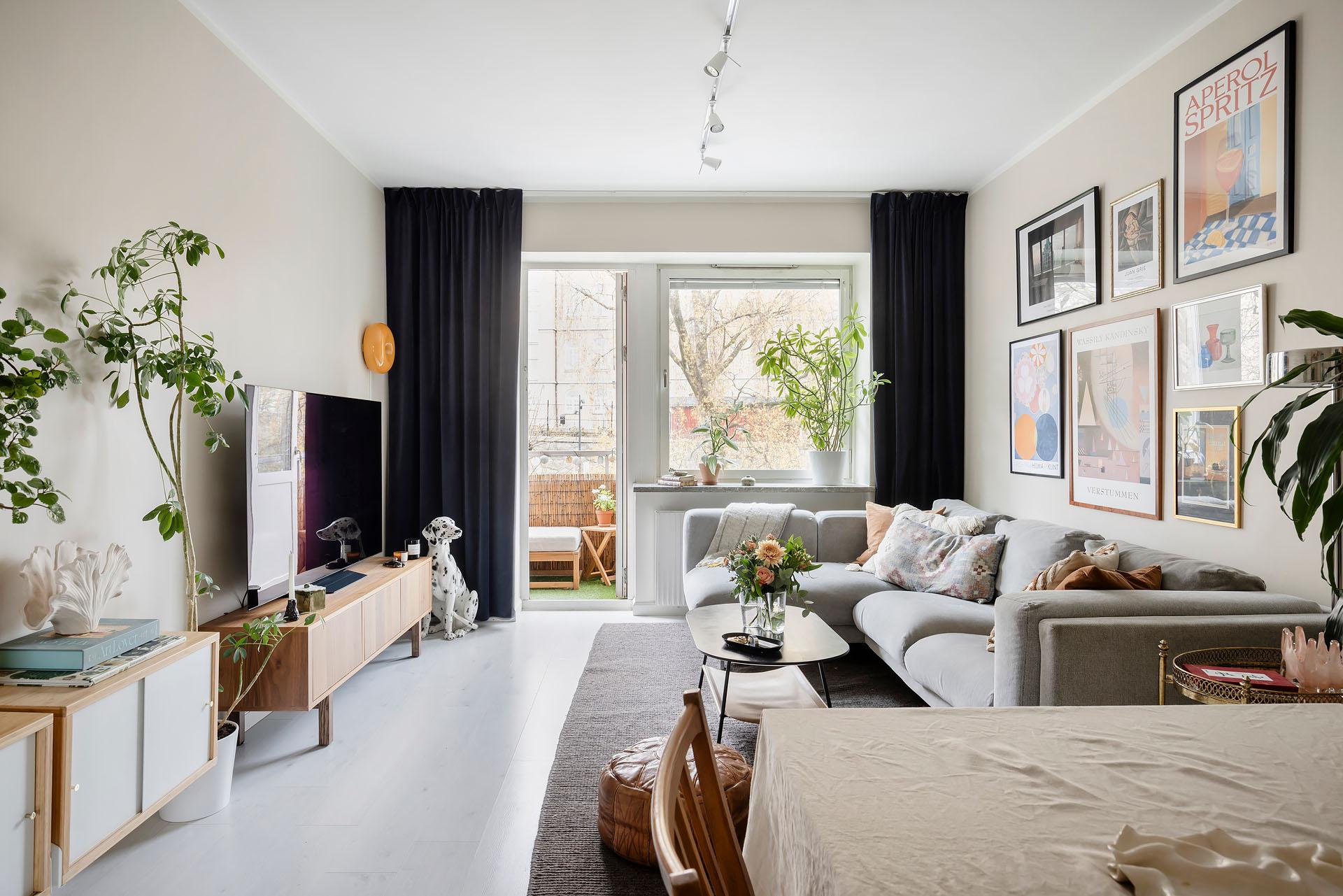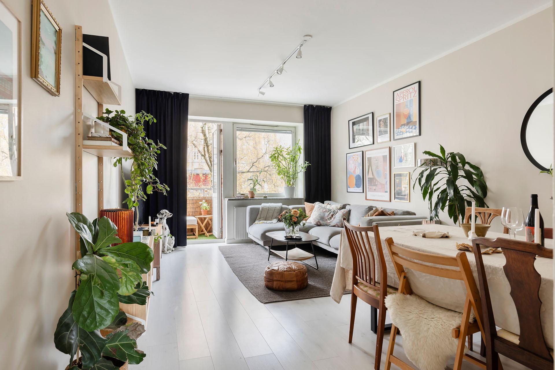 Planlösningen är tilltalande, och det är trevligt att ha uppsikt över vardagsrummet när man är i köket. Kvadratmeterna är väl fördelade, och det finns bra förvaringsmöjligheter i både köket, sovrummet och den breda, ljusa och välkomnande hallen. Takhöjden, öppningarna, de stora fönstren och den fria utsikten ger en känsla av rymd. Ljusinsläppet är generöst, och sommartid njuter man av solen på balkongen i söder. Eller ute på föreningens gård där det finns trädgårdsmöbler och grill. Förutom en fin utemiljö har den välskötta och ekonomiskt välmående föreningen även cykelrum, tre tvättstugor och sexton parkeringsplatser som hyrs ut enligt ett separat kösystem.