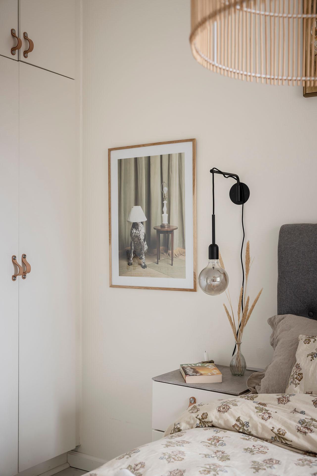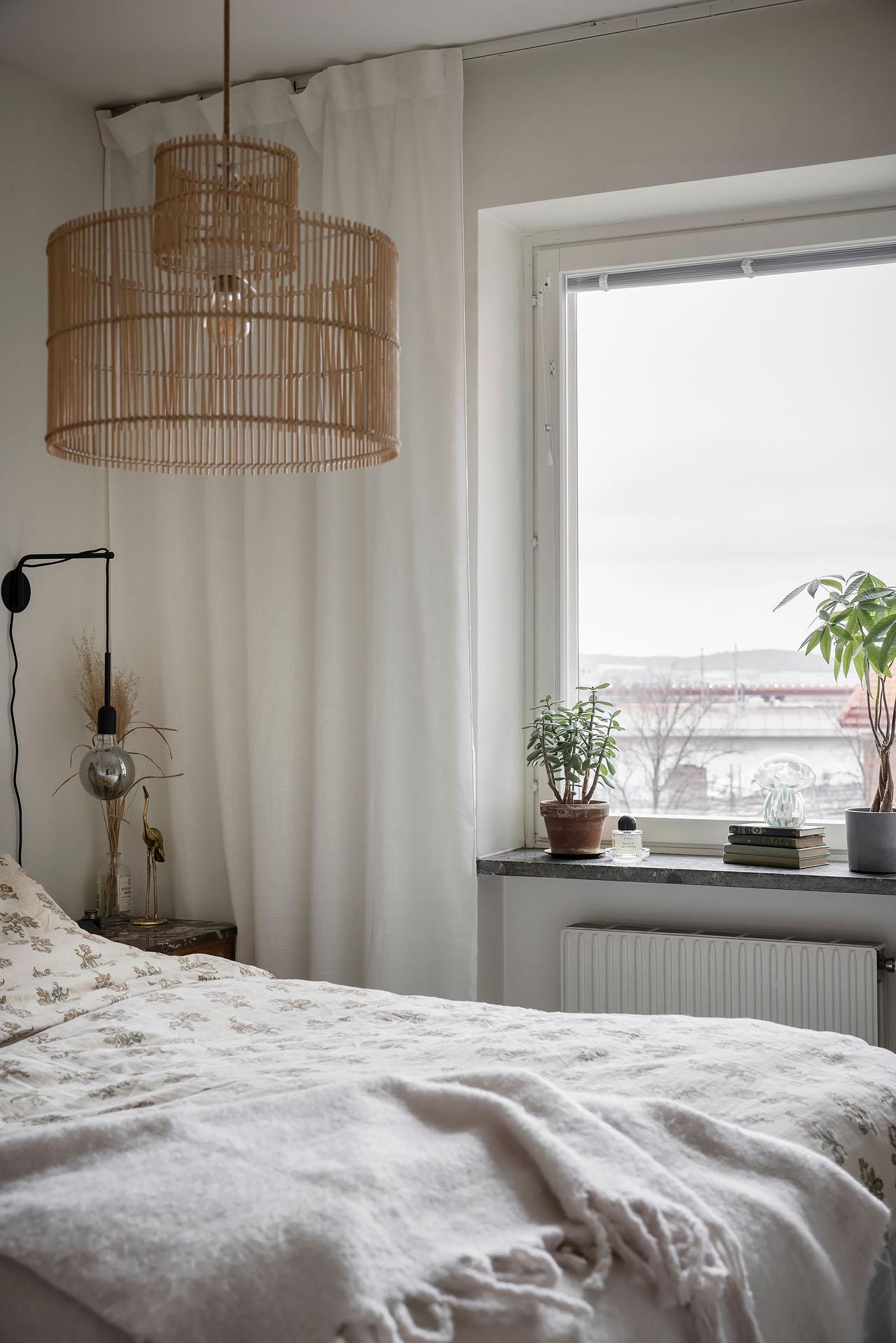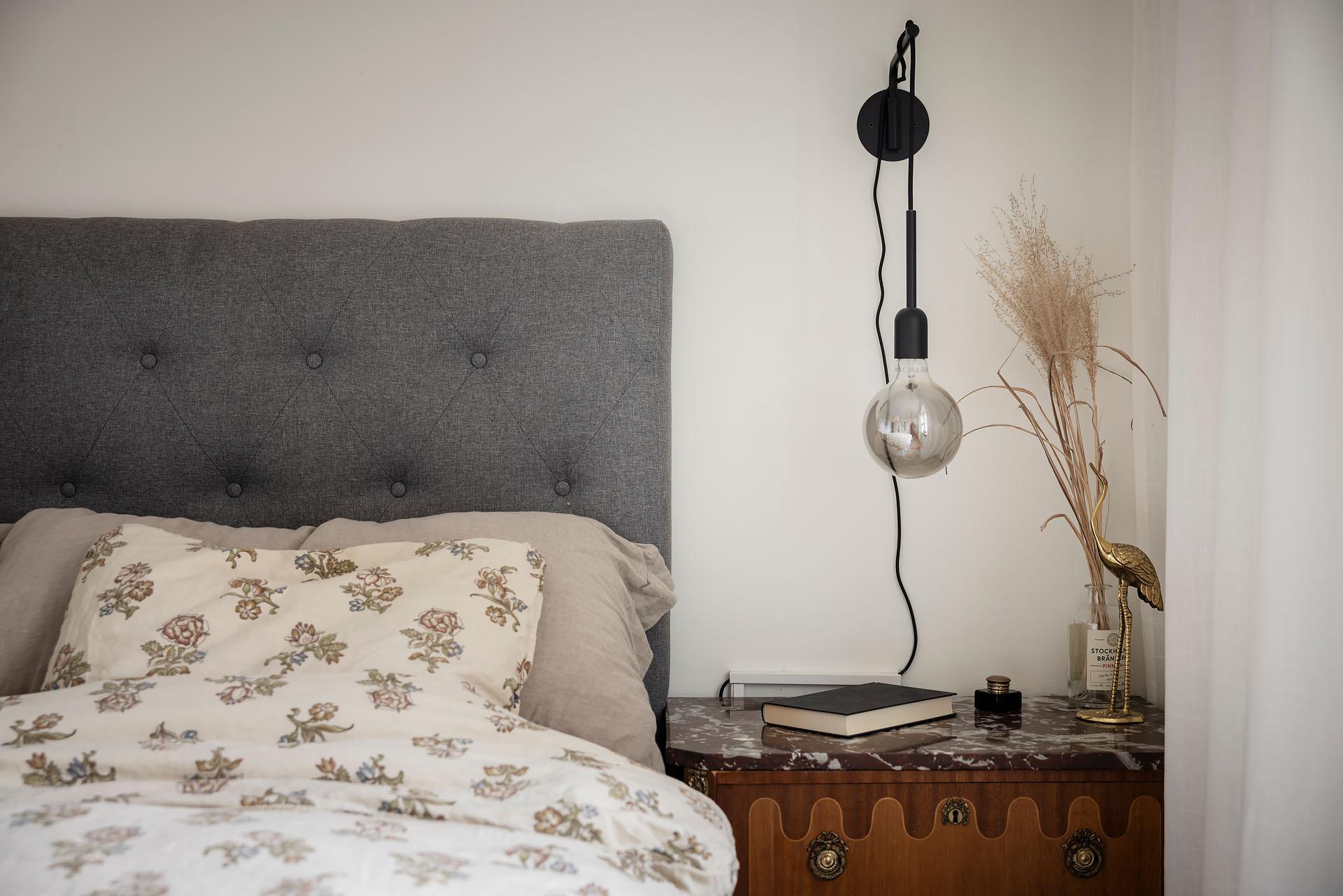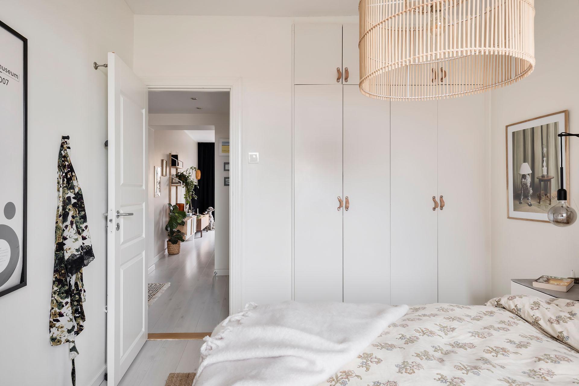 Sovrummet rymmer lätt och ledigt en dubbelsäng, och de två inbyggda dubbelgarderoberna sväljer det mesta i klädväg. Här sover man gott om natten, och på morgonen är det ljuvligt att vakna till den milsvida utsikten bort mot de blånande bergen i fjärran. Rummets väggar är vitmålade och golvet belagt med samma ljusa parkettmönstrade laminat som i övriga lägenheten.