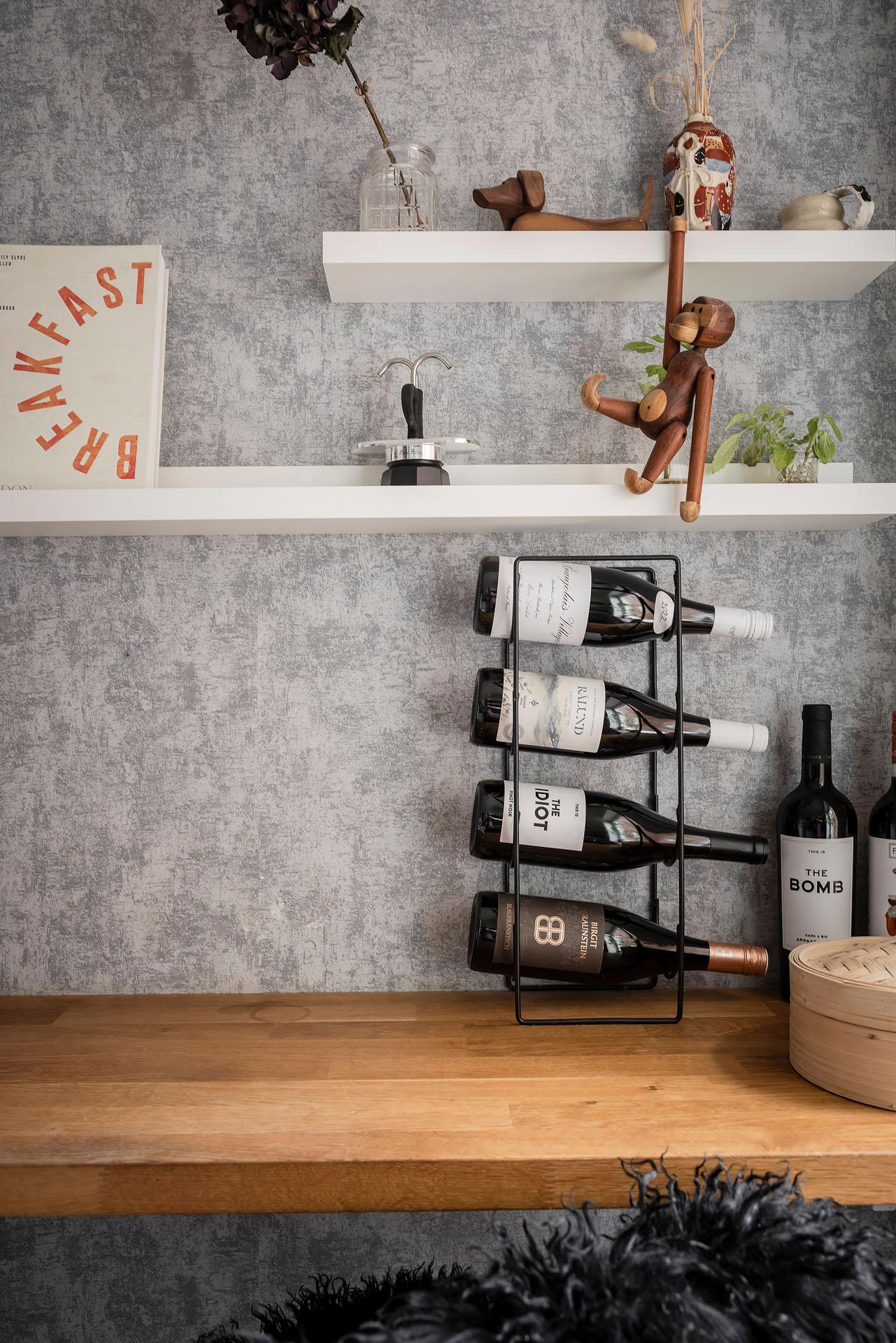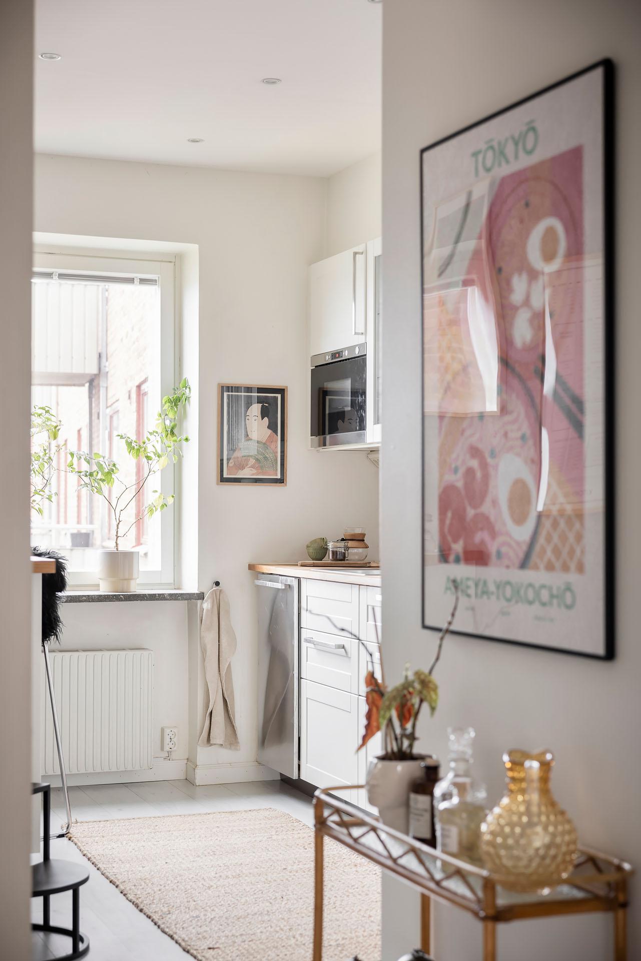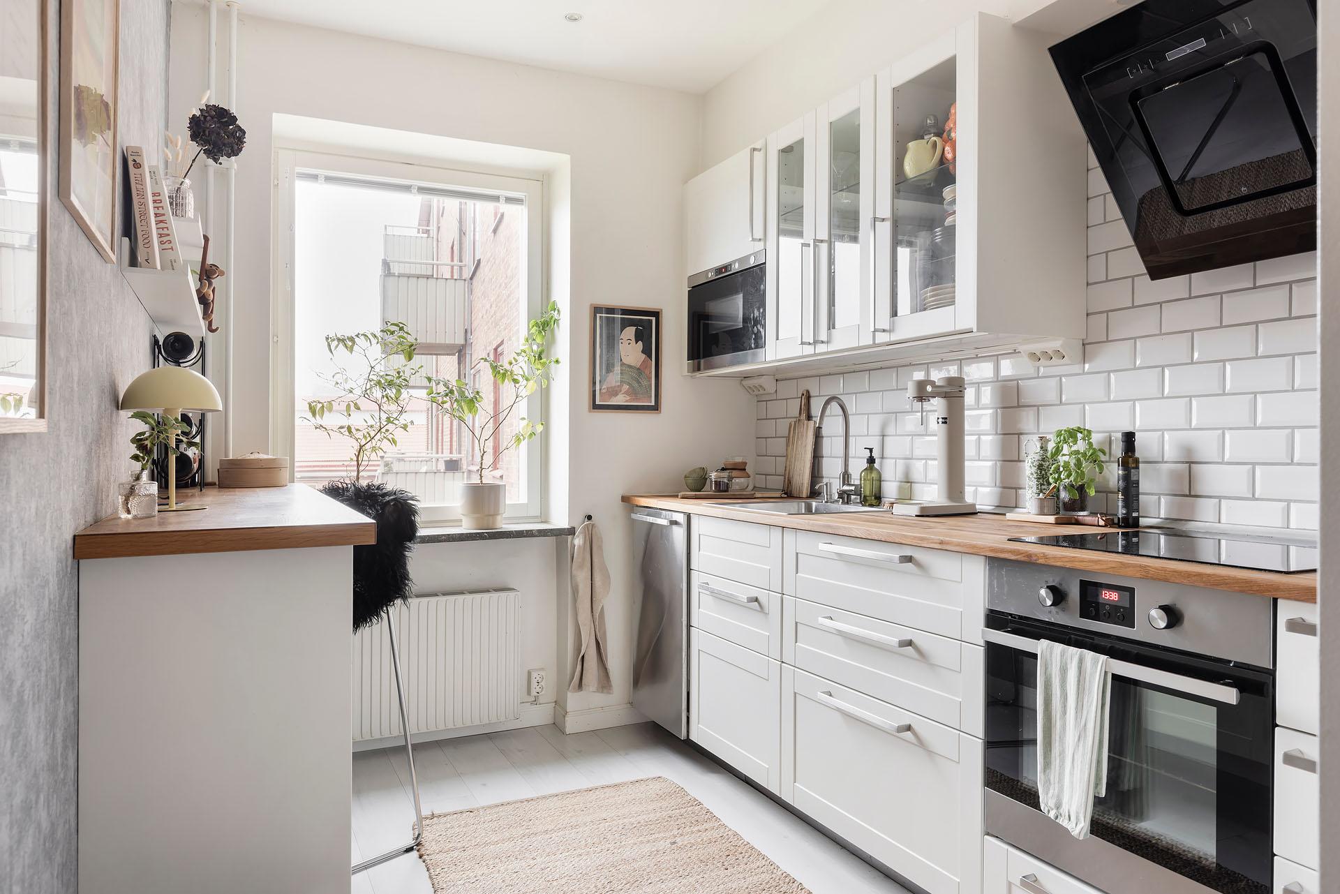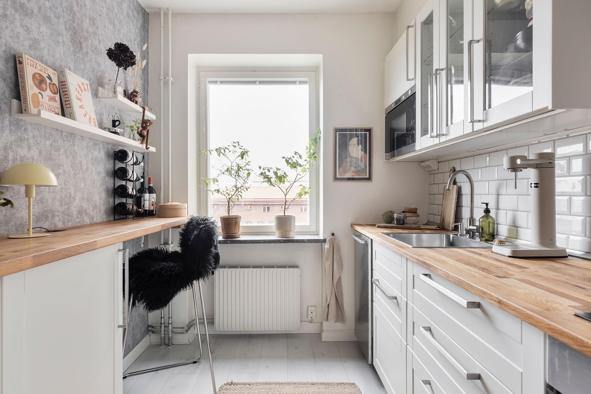 I köket är det väl tilltaget med både förvaring och arbetsyta, och tack vare lägenhetens breda öppningar har hemmakockarna bra uppsikt över umgänget i vardagsrummet. Det finns även plats för att bjuda ett par gäster på ett glas vin medan de väntar på maten, eller för att slå sig ner med en kopp kaffe och bläddra i kokböckerna. Bänkskivorna är i ek, och skåpen har vita luckor och lådor. Partiet ovanför den breda arbetsbänken, med infälld induktionshäll och diskho, är klätt med vitt kakel i halvförband. Varmluftsugnen och den inbyggda mikron och diskmaskinen är i rostfri design medan kylen/frysen är integrerade i inredningen. Diskmaskinen installerades 2023 och övriga vitvaror, inklusive den påkopplade svarta fläkten, i samband med helrenoveringen av köket 2015. Väggarna är målade i vitt och tapetserade med en grå fondtapet. Golvet är belagt med ljus parkettmönstrad laminat och taket har infällda spottar.
