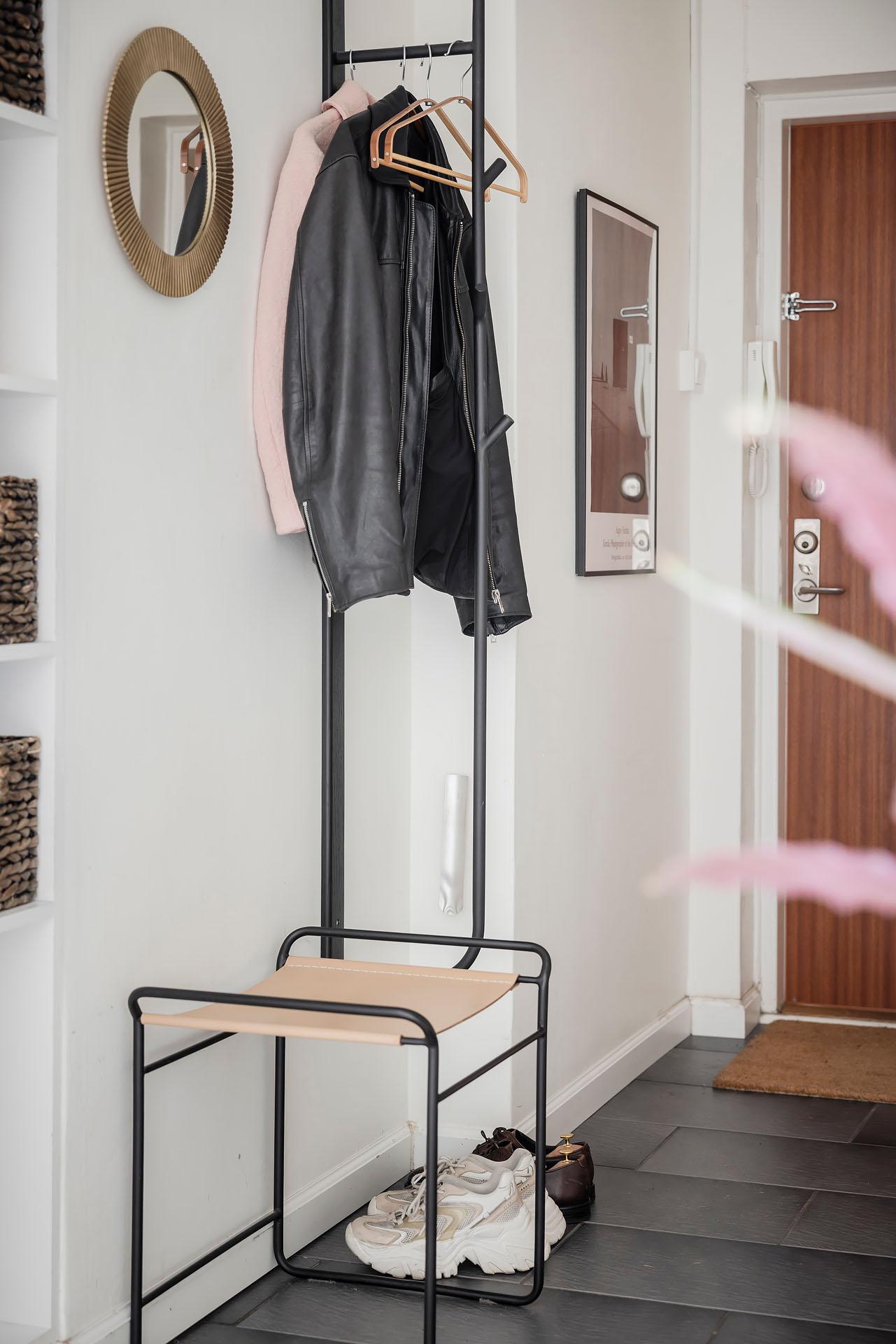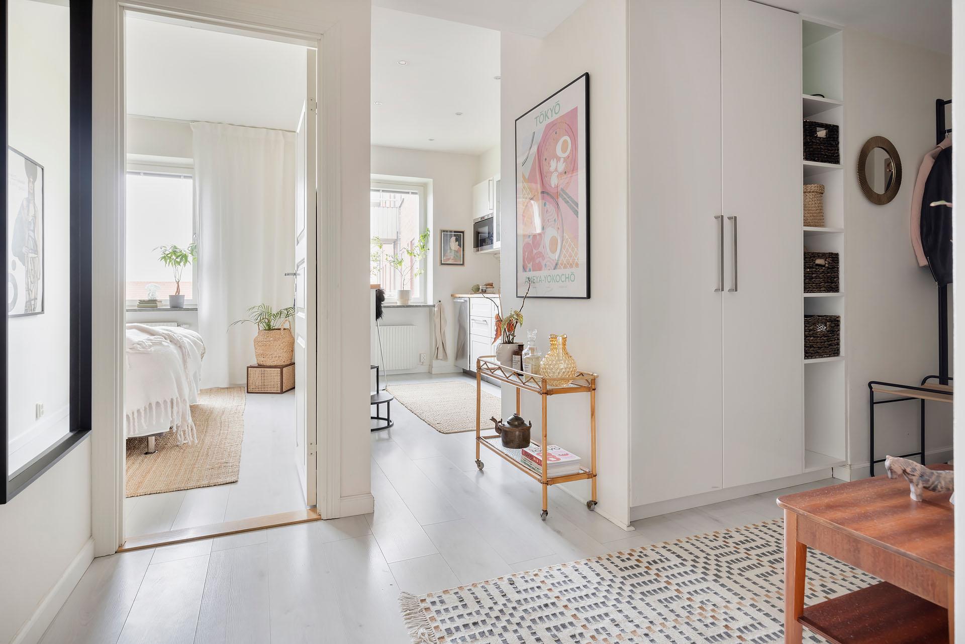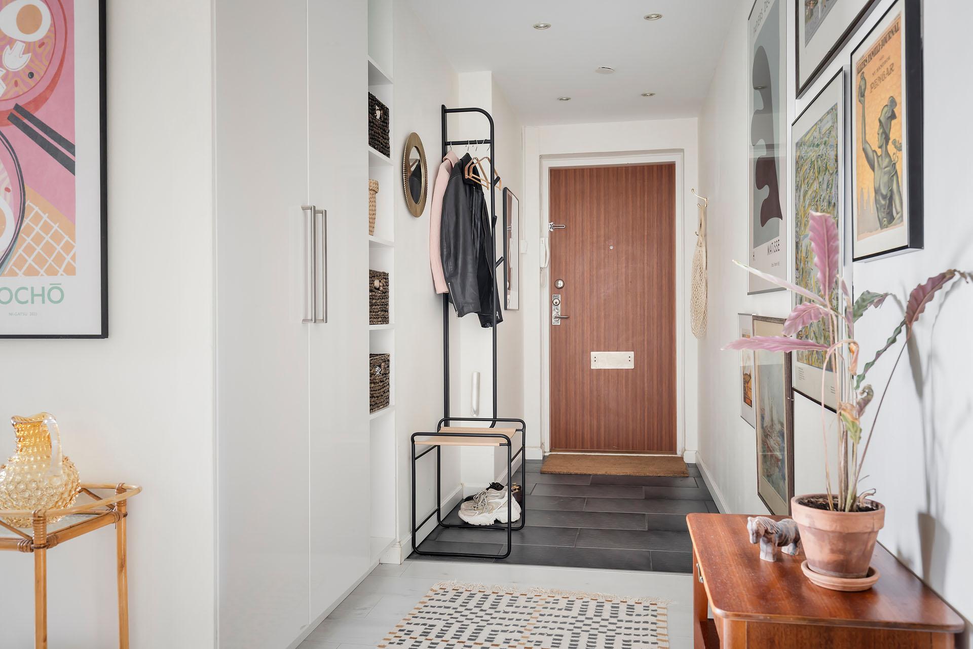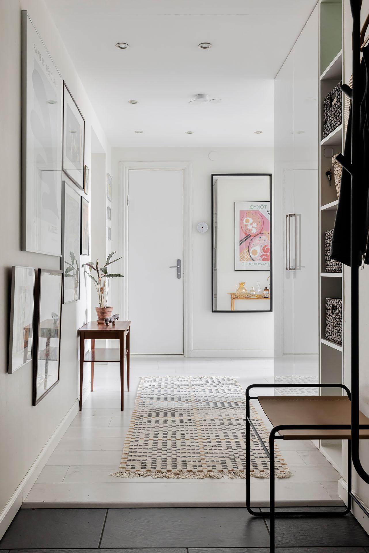 Hallen är rymlig, ljus och välkomnande. Det finns gott om utrymme för jackavhängning, och bra förvaringsmöjligheter erbjuds i form av två platsbyggda garderober som kompletteras av inbyggda hyllor för korgar eller dylikt. Väggarna är vitmålade och i hallens inre del löper ljus parkettmönstrad laminat tröskelfritt genom öppningarna mot vardagsrummet och köket. I entrén är golvet belagt med grafitgrå klinker. Solen letar sig in från köket och rummen, och efter mörkrets inbrott är det bara att tända de infällda spottarna i taket.