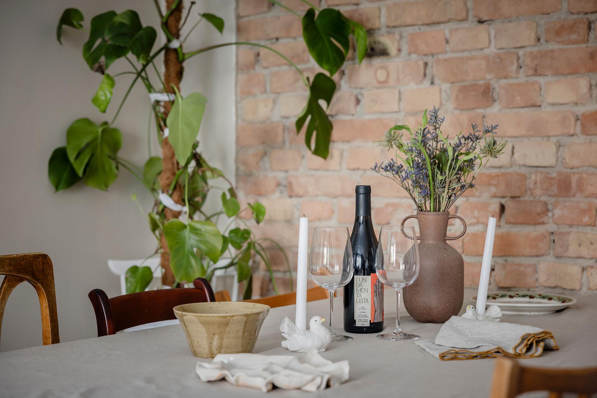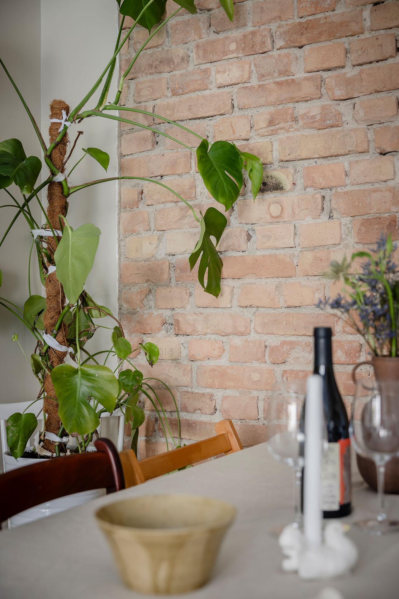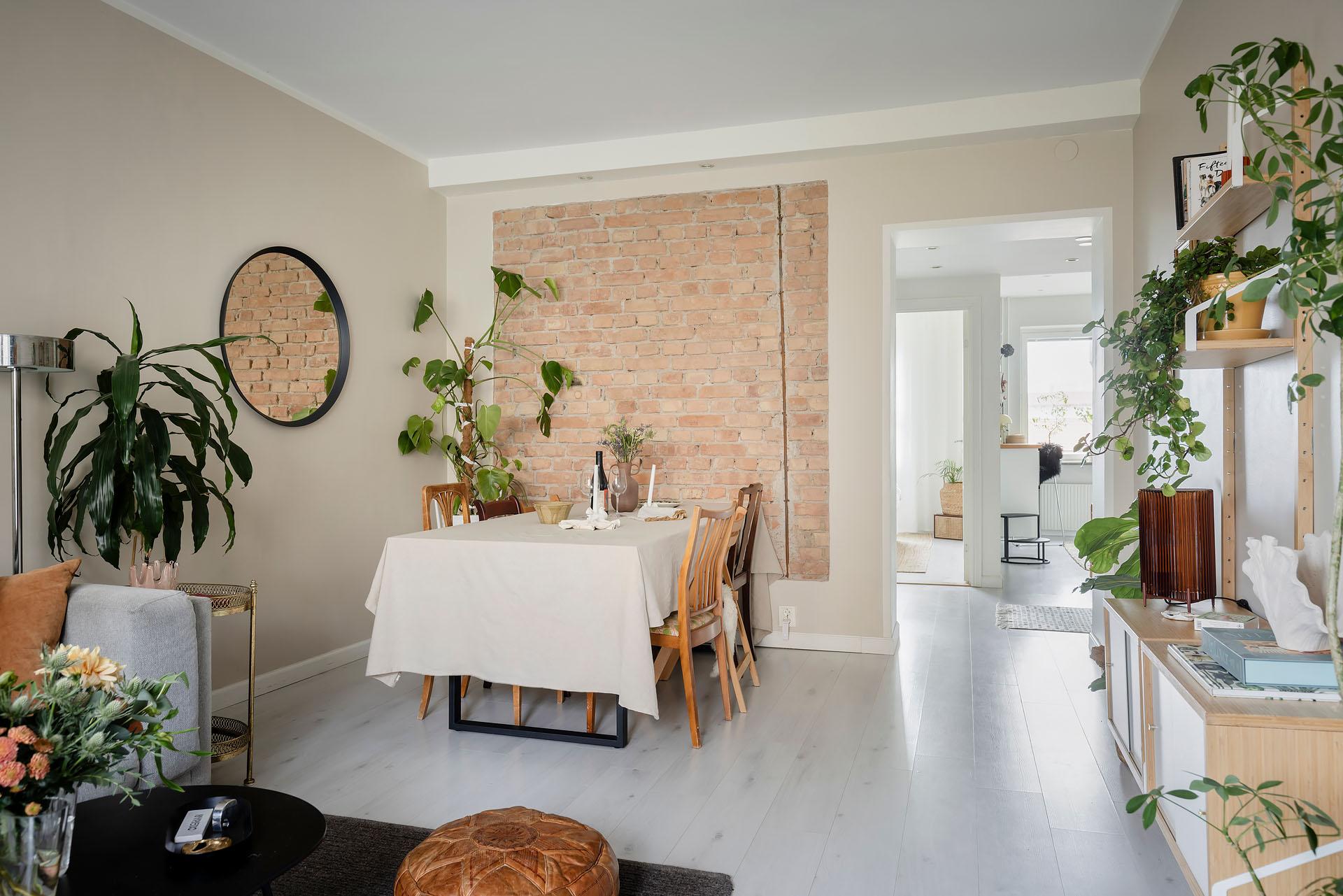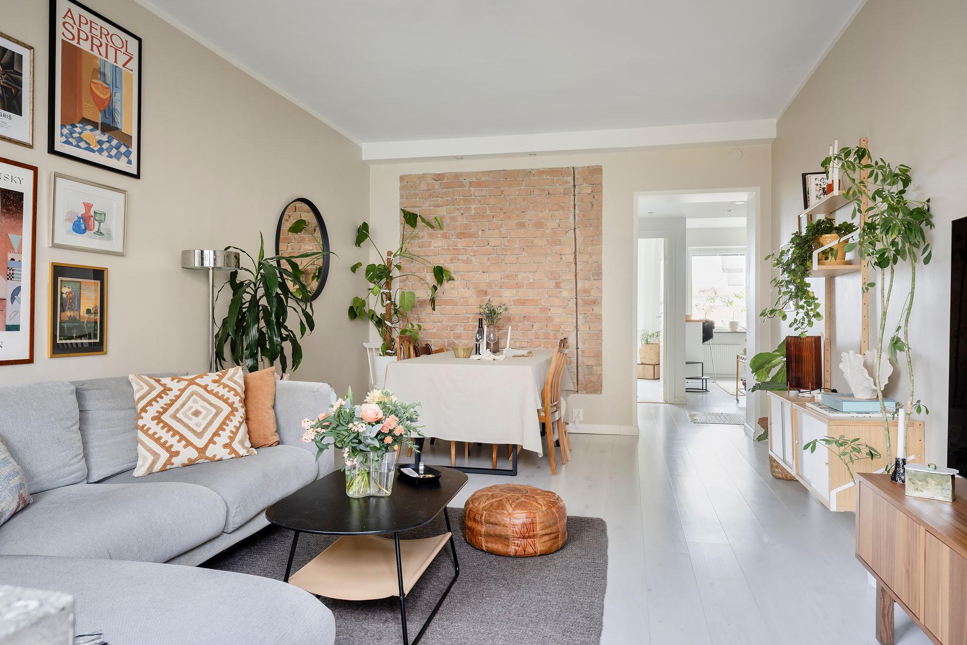Vardagsrummet är rymligt, och man får enkelt plats med både matgrupp, soffa, tv-bänk och bokhyllor utan att den luftiga känslan går förlorad. Sommartid är det härligt att sitta och äta, umgås eller bara koppla av på den södervända och soliga balkongen med Ånässkolans vackra fasad som kuliss. Det frilagda väggteglet vid den nuvarande matplatsen ger rummet karaktär, och i övrigt är väggarna målade i en varm beige kulör. Golvet är belagt med ljus parkettmönstrad laminat.