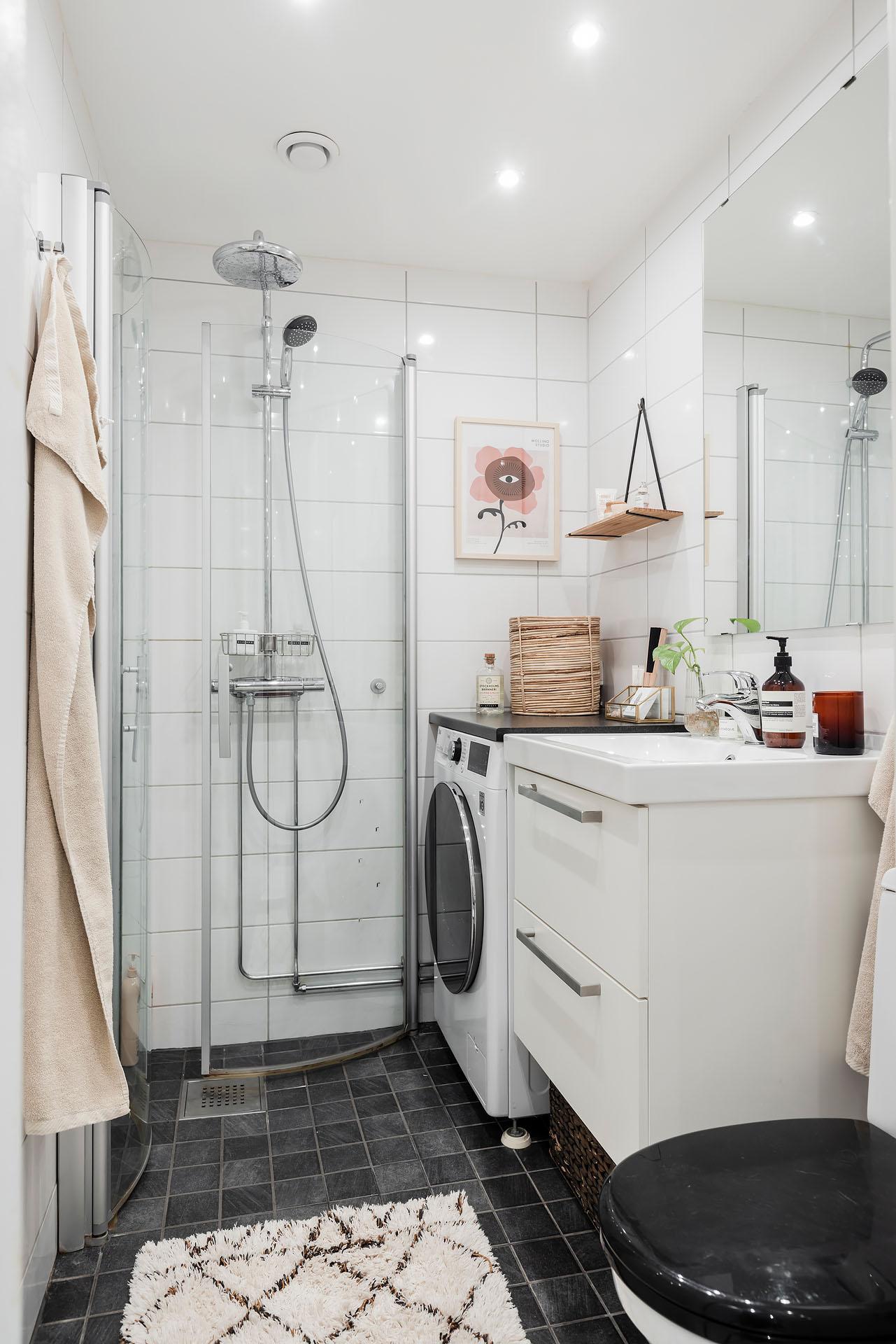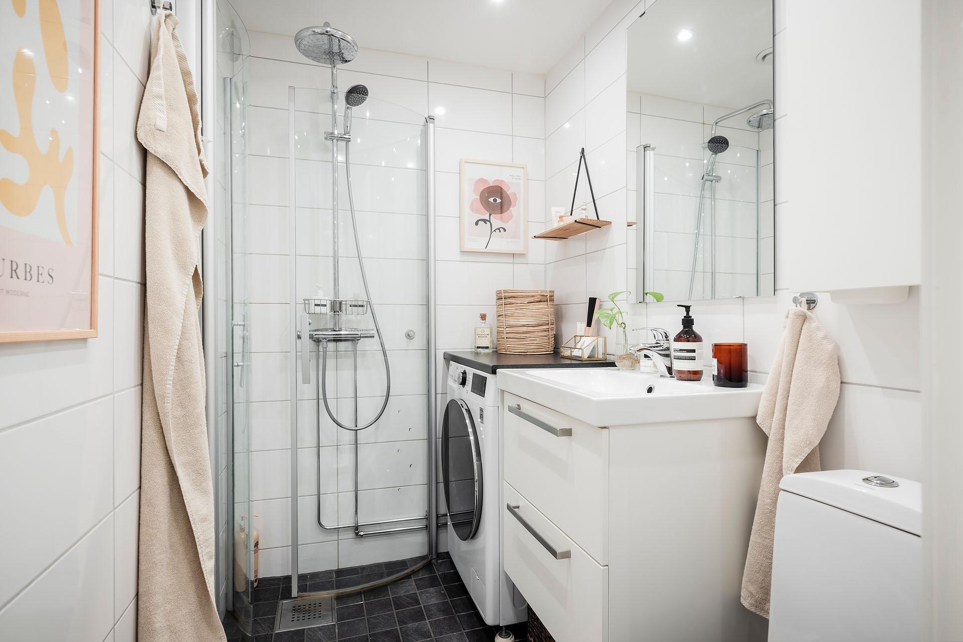 Det fräscha badrummet, totalrenoverat 2014, inrymmer duschhörna, tvättkommod, väggskåp och en kombinerad tvättmaskin och torktumlare som sattes in 2020. Duschhörnan, som skärmas av med infällbara glasdörrar, är utrustad med både takdusch och handmunstycke. Väggarna är helkaklade i vitt och golvet belagt med mörkgrå klinker. De infällda takspottarna ger en bra och behaglig belysning.