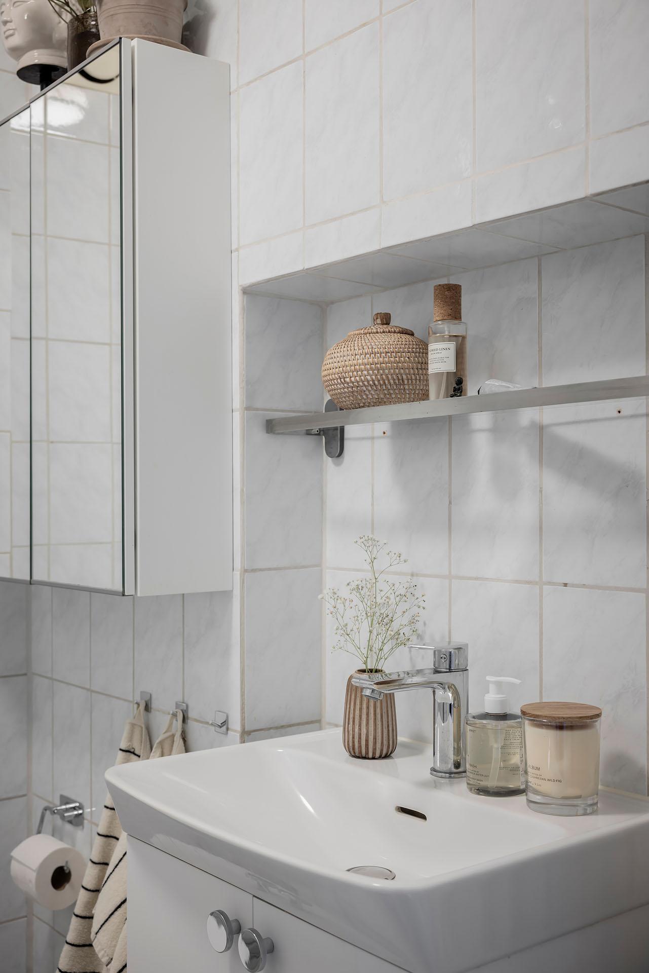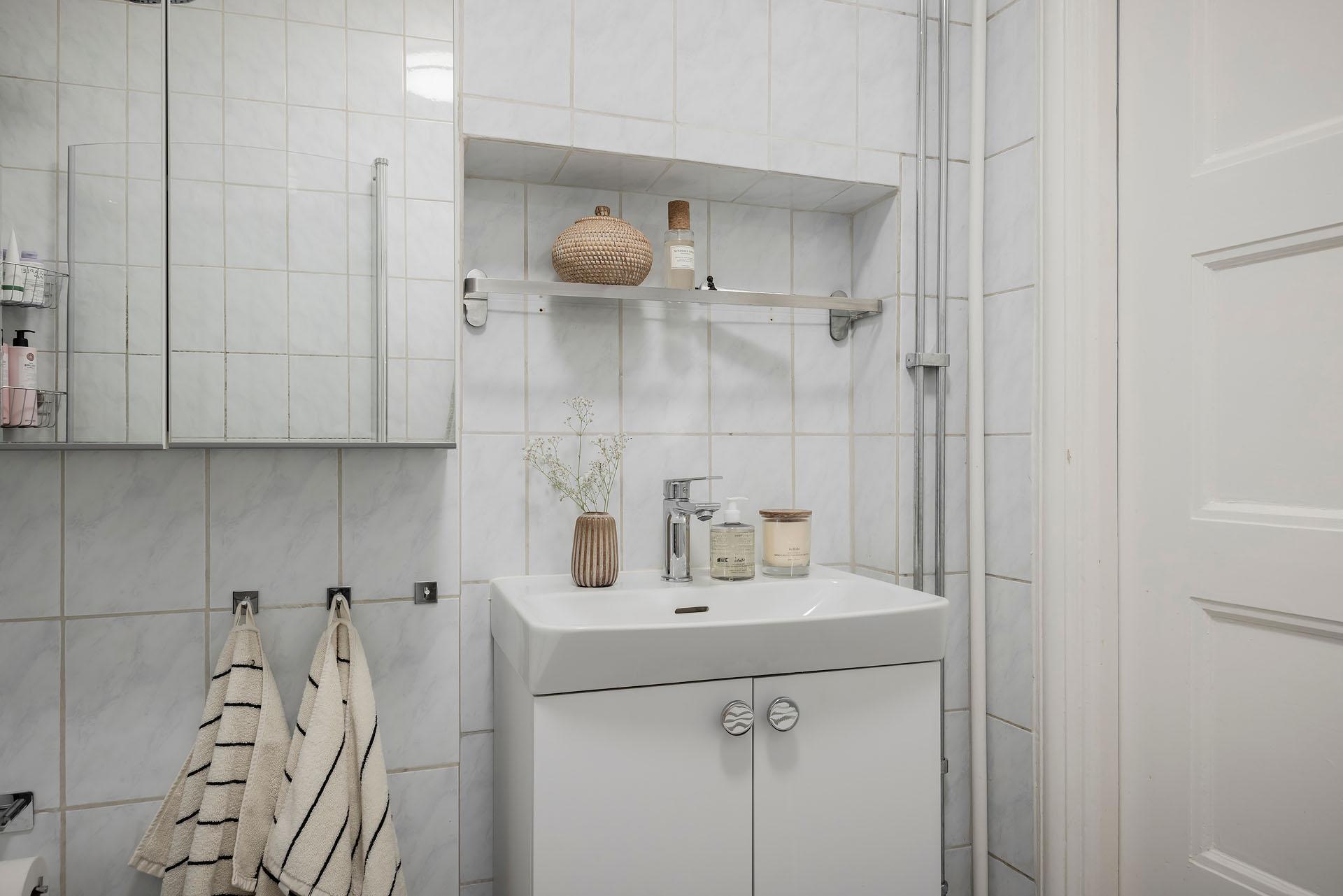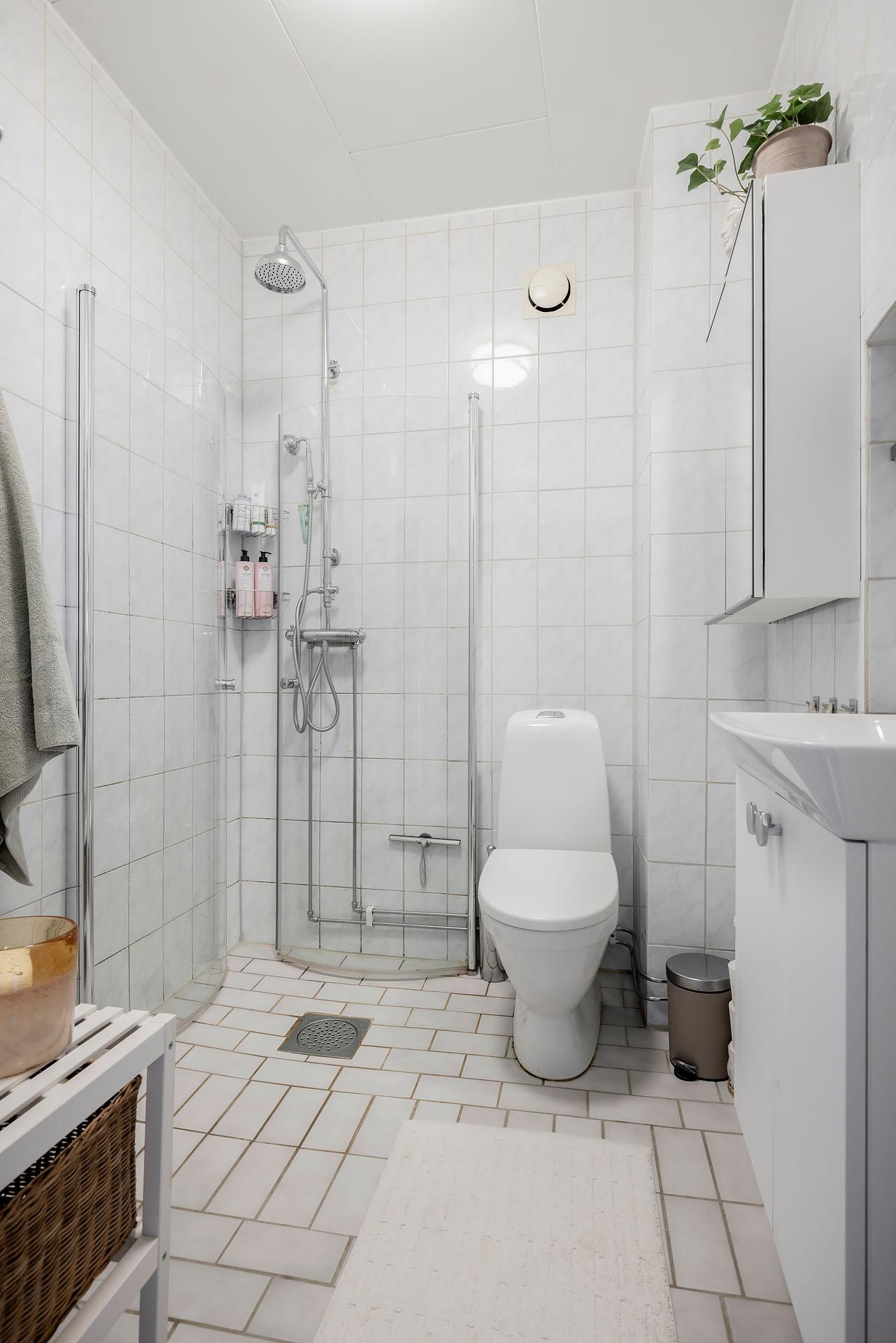 Badrummet inrymmer duschhörna, handdukstork, tvättkommod, spegelskåp och toalett. Duschhörnan, som skärmas av med nya infällbara glasdörrar, är utrustad med både takdusch och handmunstycke. Även kommoden och toaletten är nya. Väggarna är klädda med ljusblått kakel och golvet belagt med ljusblå klinker.