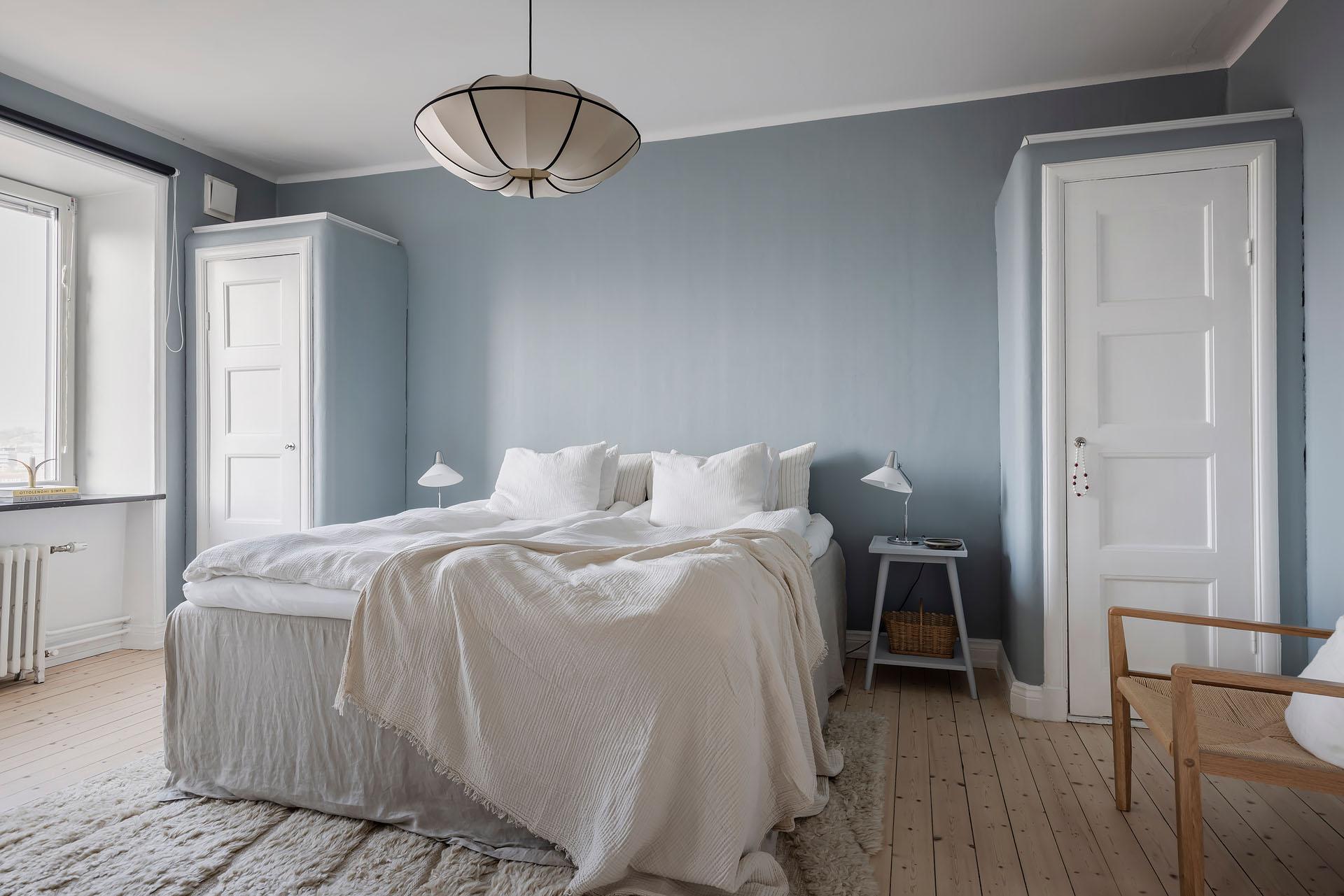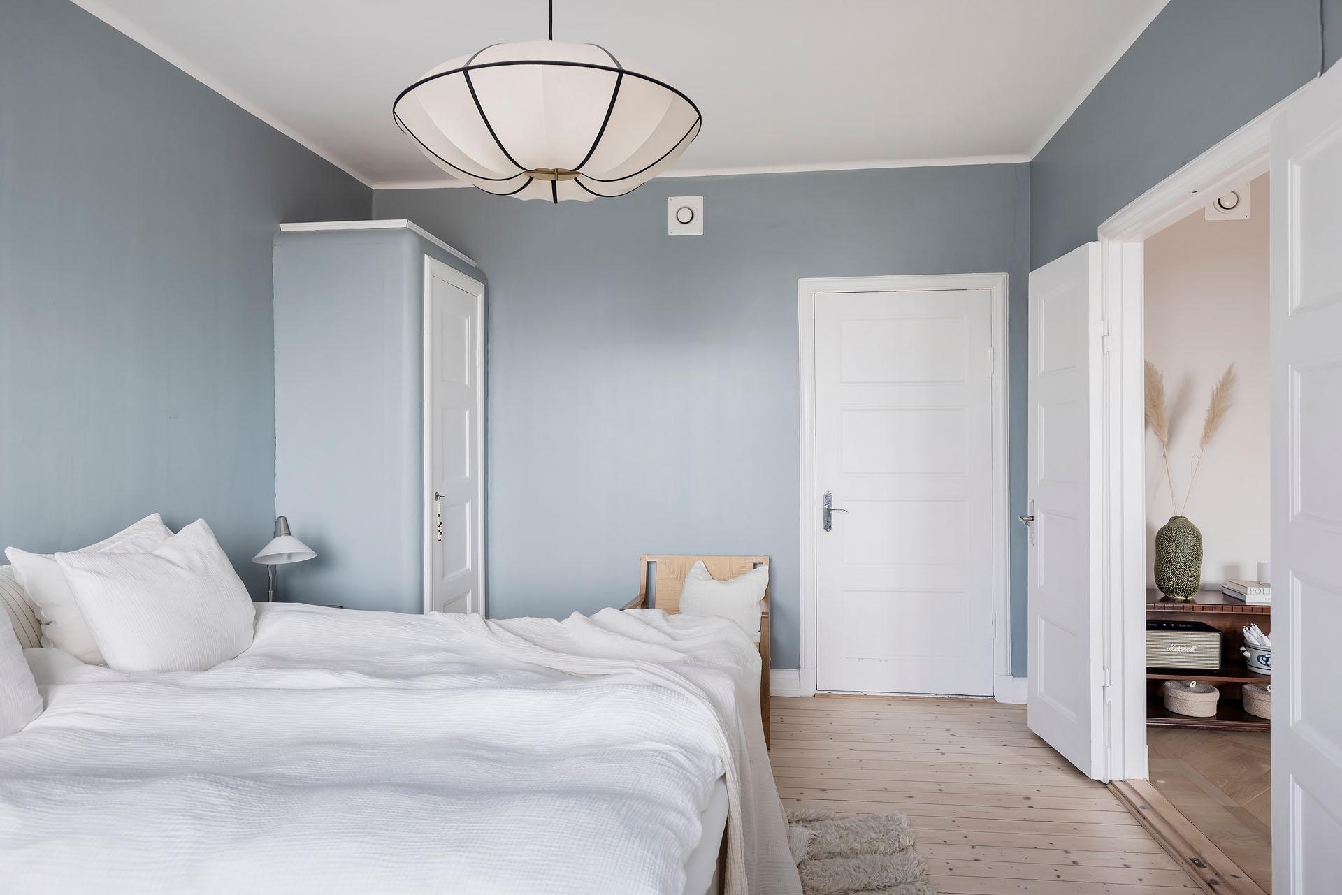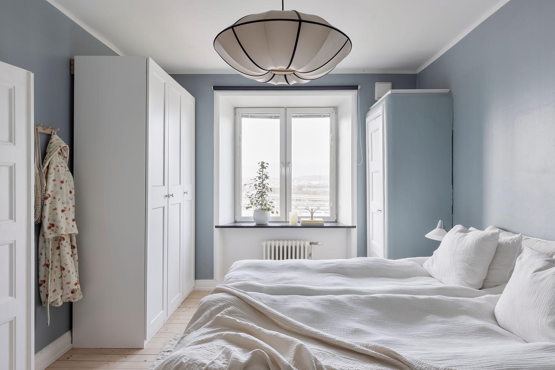 Från vardagsrummet leder parspegeldörrar in till lägenhetens lika mysiga som rymliga sovrum. Här sover man gott om natten, och att vakna till den milsvida utsikten är verkligen rogivande. En dubbelsäng med nattduksbord ryms lätt och ledigt, och klädkammaren, de platsbyggda originalgarderoberna och den fristående trippelgarderoben erbjuder ypperliga förvaringsmöjligheter för både kläder, sänglinne, städutrustning och annat. Brädgolvet är framtaget och rummets väggar målade i en härligt gråblå kulör som lyfter fram de vita originalsnickerierna.