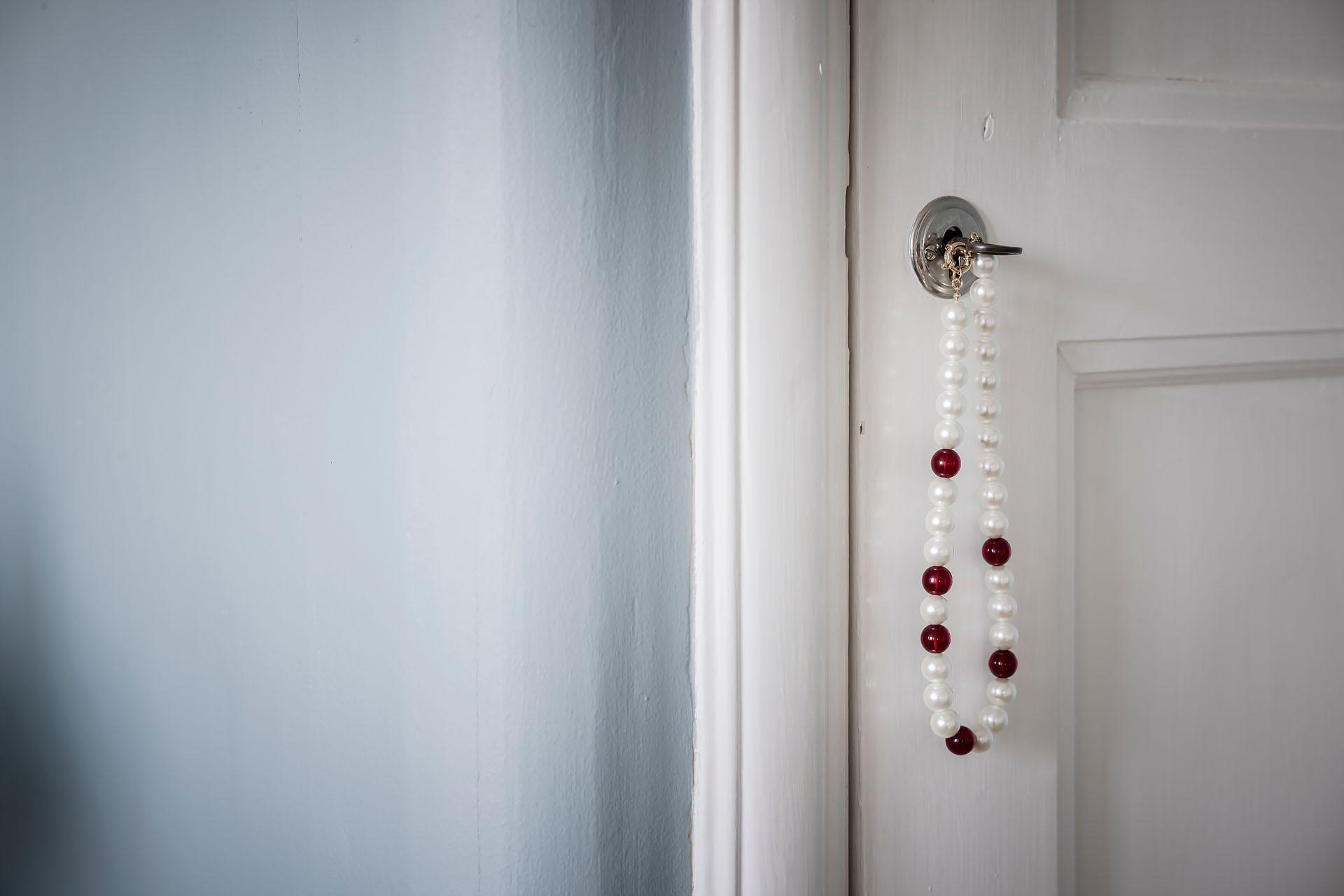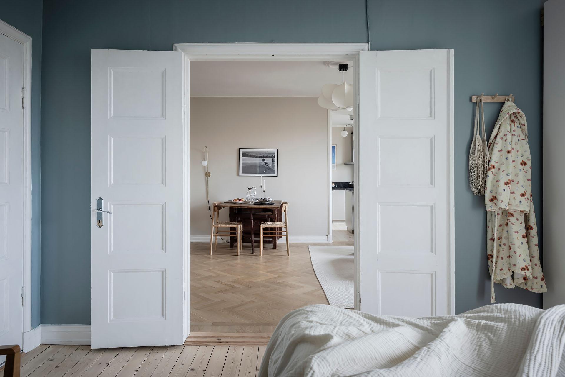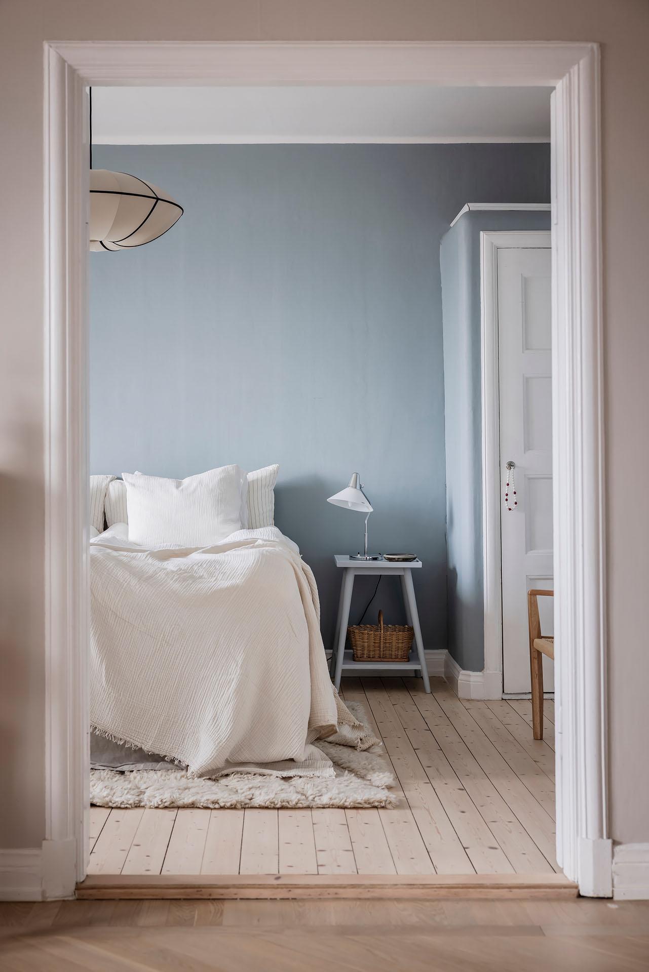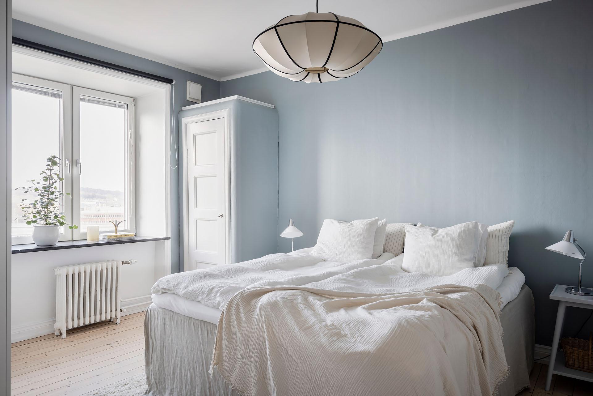Från vardagsrummet leder parspegeldörrar in till lägenhetens lika mysiga som rymliga sovrum. Här sover man gott om natten, och att vakna till den milsvida utsikten är verkligen rogivande. En dubbelsäng med nattduksbord ryms lätt och ledigt, och klädkammaren, de platsbyggda originalgarderoberna och den fristående trippelgarderoben erbjuder ypperliga förvaringsmöjligheter för både kläder, sänglinne, städutrustning och annat. Brädgolvet är framtaget och rummets väggar målade i en härligt gråblå kulör som lyfter fram de vita originalsnickerierna.