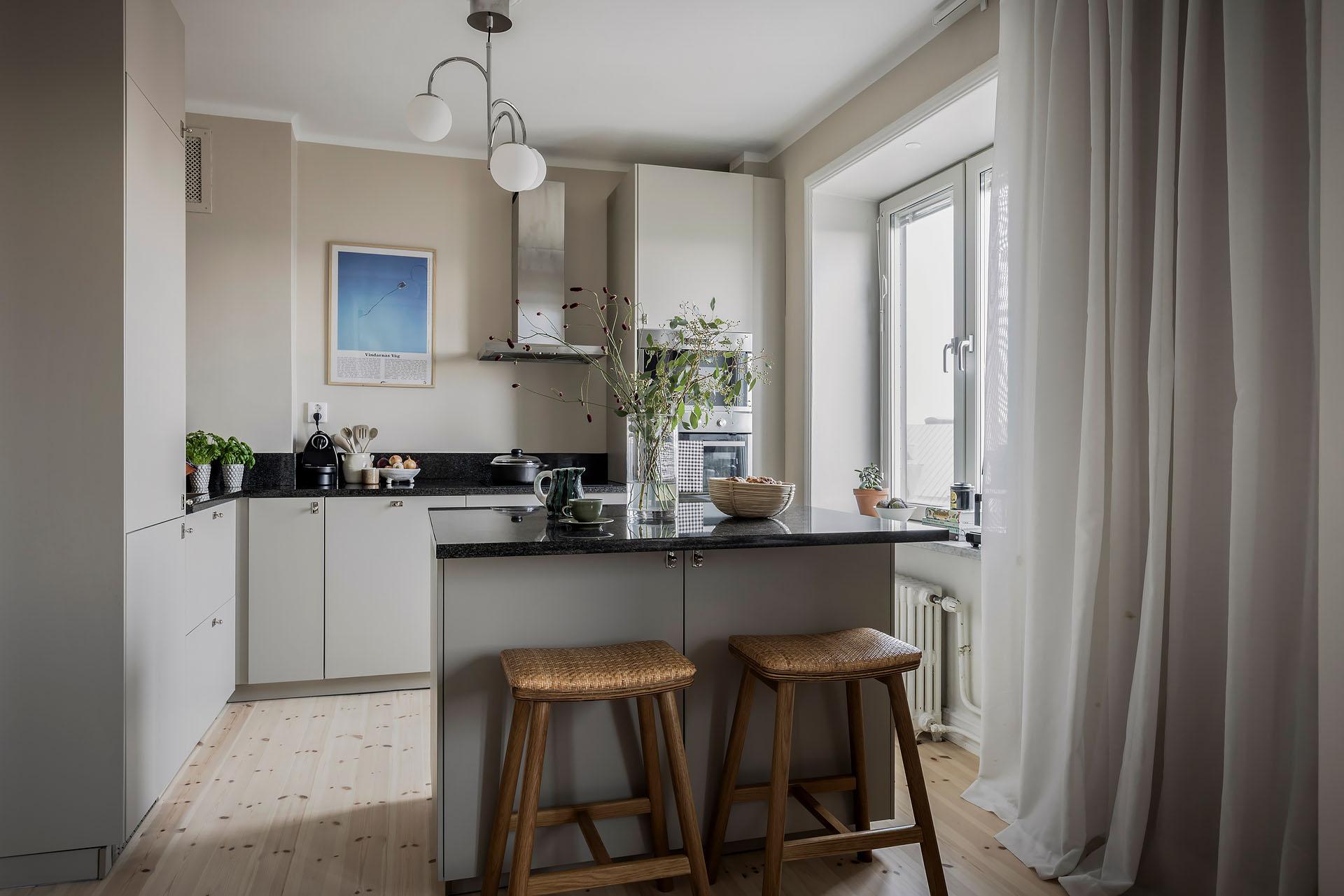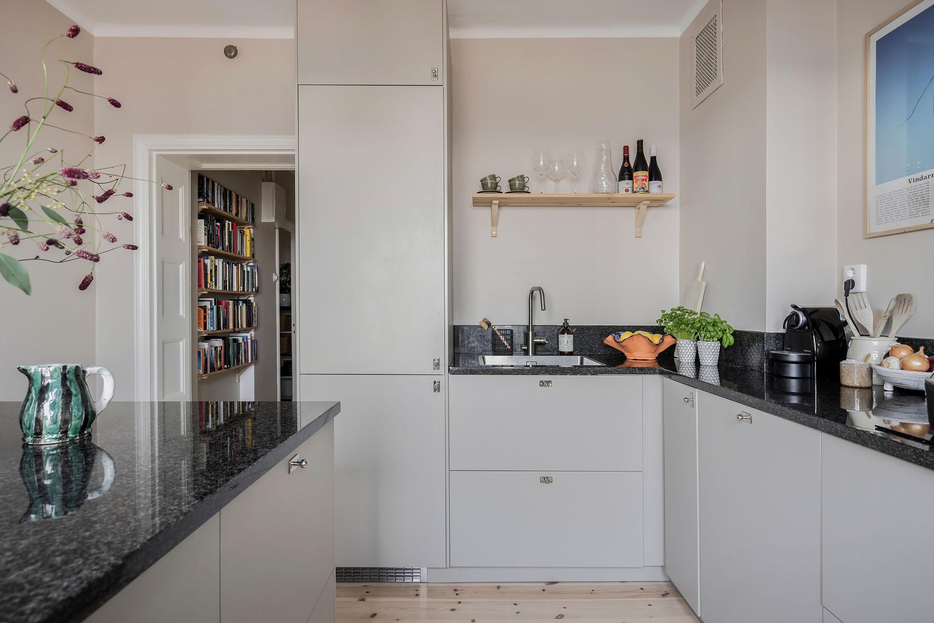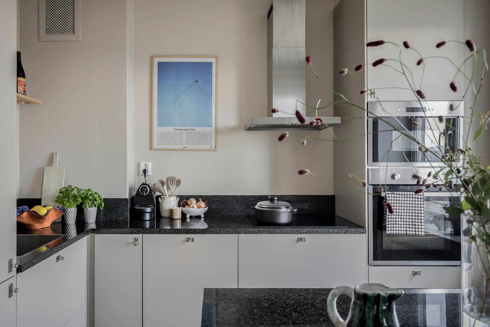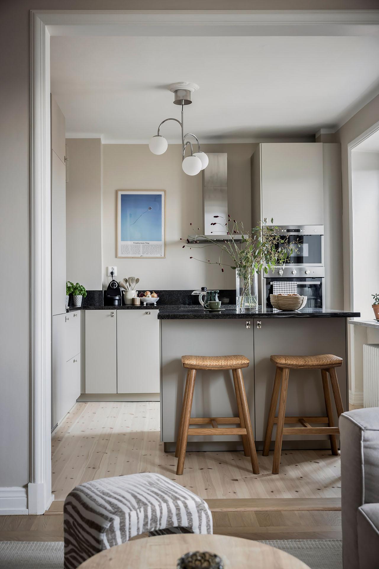 Köket öppnar sig mot vardagsrummet, och det finns även en ingång från lägenhetens inre hall. Det är väl tilltaget med både förvaring och arbetsyta, och köksön fungerar perfekt som serveringbänk under de stora middagsbjudningarna. Här kan även ett par gäster slå sig ner med ett glas vin medan hemmakockarna rör om i grytorna. Skåpen har ljusgrå luckor och lådor med fina beslag, och bänkskivorna är i svart granit med infälld spishäll och underlimmad diskho. Fläkten, ugnen och den inbyggda mikron är i rostfri design medan diskmaskinen och kylen/frysen är integrerade i inredningen. Alla vitvaror sattes in i samband med helrenoveringen av köket 2023. Brädgolv i ljus furu har lagts in, och väggarna är målade i beige.
