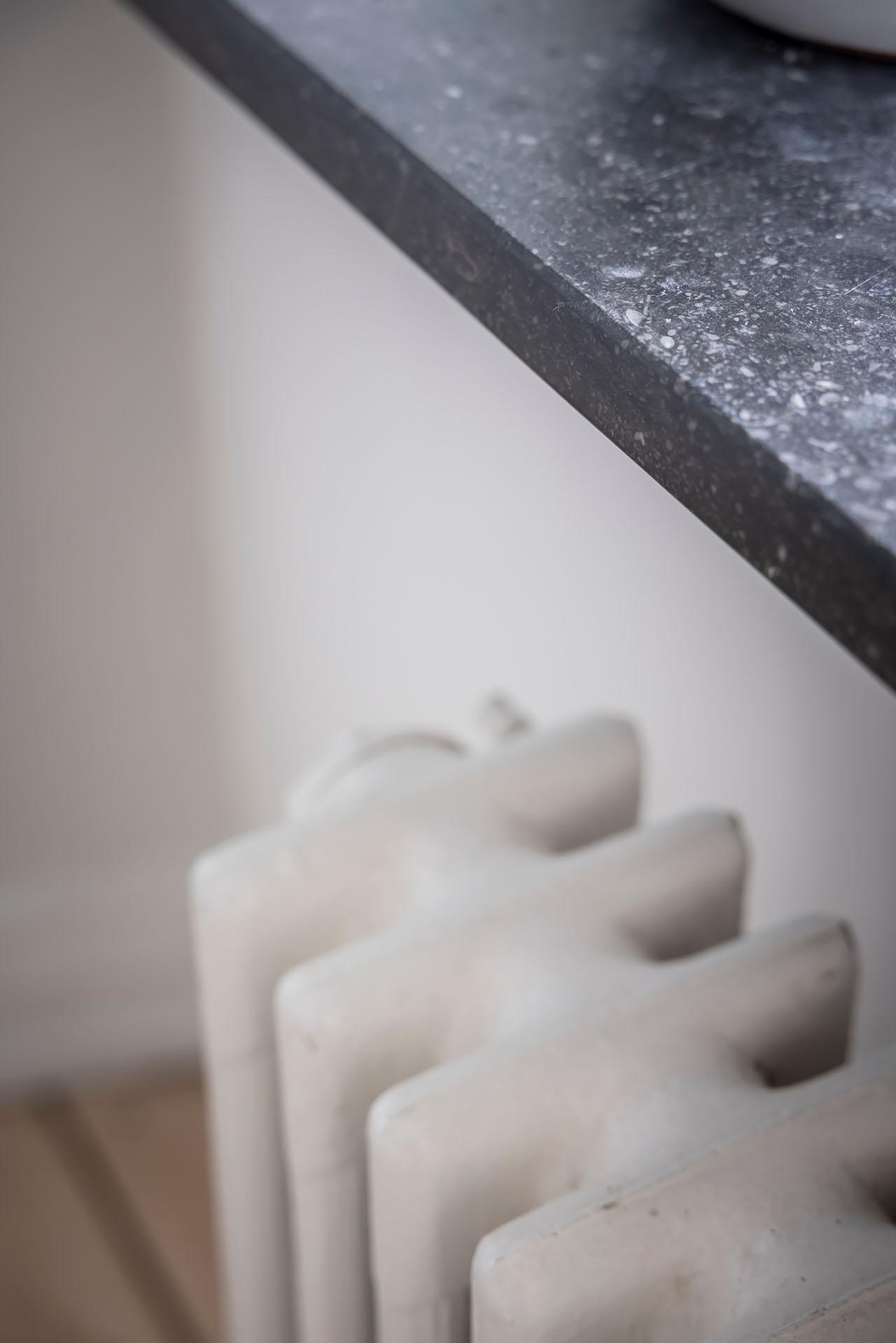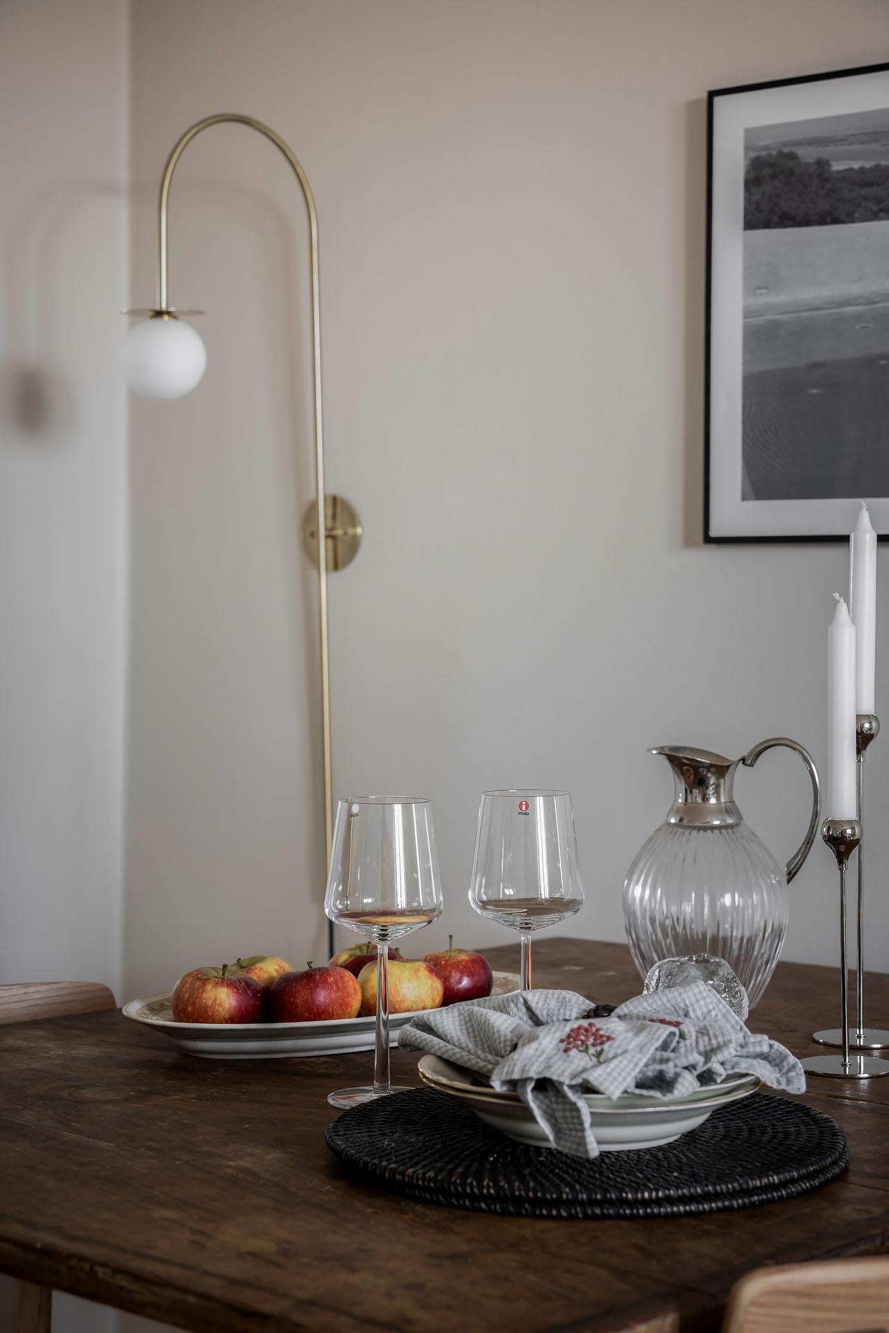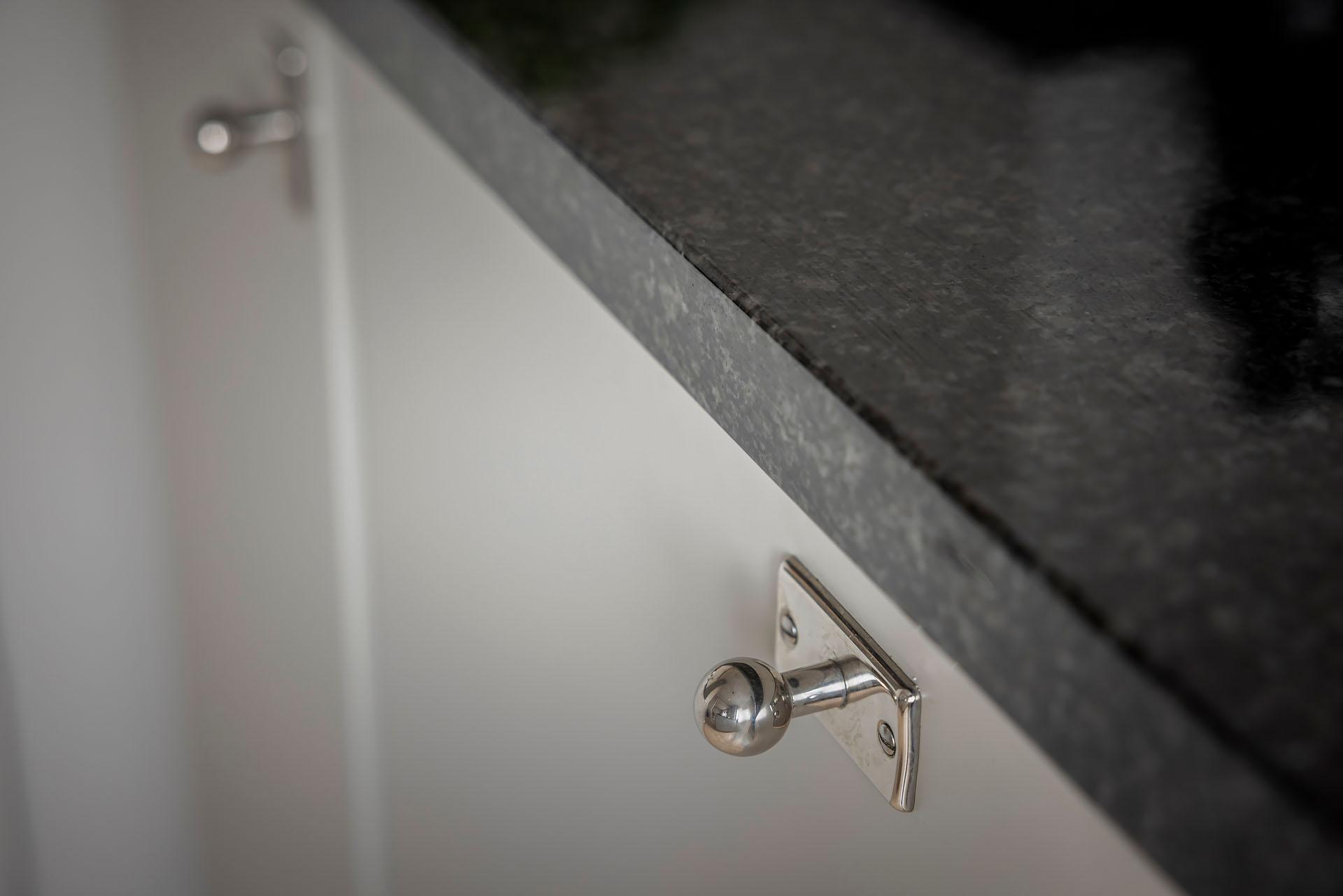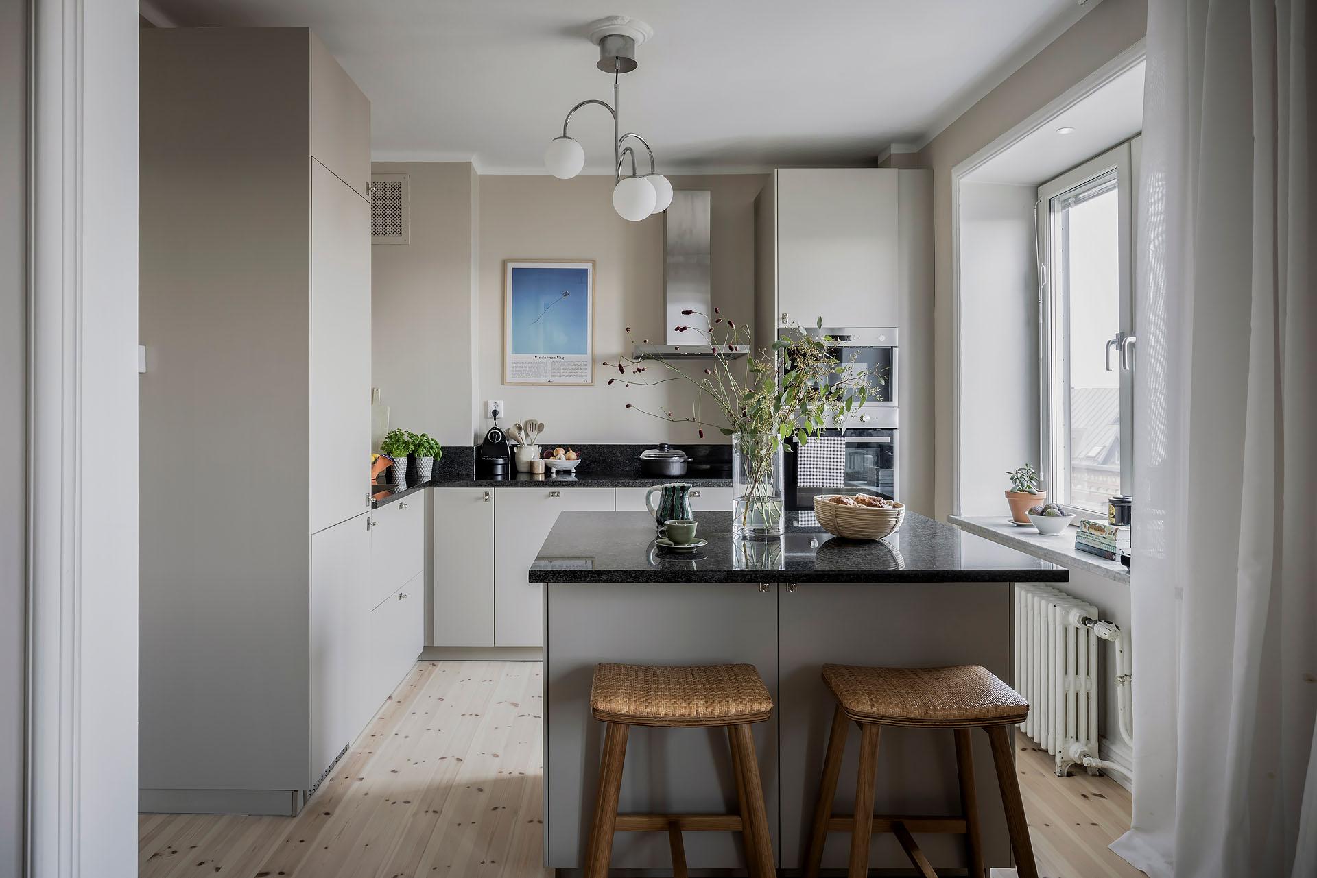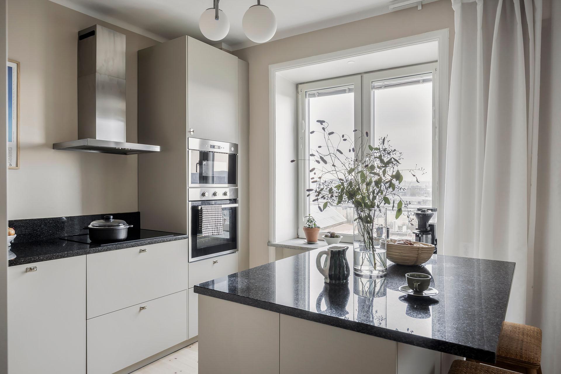 Köket öppnar sig mot vardagsrummet, och det finns även en ingång från lägenhetens inre hall. Det är väl tilltaget med både förvaring och arbetsyta, och köksön fungerar perfekt som serveringbänk under de stora middagsbjudningarna. Här kan även ett par gäster slå sig ner med ett glas vin medan hemmakockarna rör om i grytorna. Skåpen har ljusgrå luckor och lådor med fina beslag, och bänkskivorna är i svart granit med infälld spishäll och underlimmad diskho. Fläkten, ugnen och den inbyggda mikron är i rostfri design medan diskmaskinen och kylen/frysen är integrerade i inredningen. Alla vitvaror sattes in i samband med helrenoveringen av köket 2023. Brädgolv i ljus furu har lagts in, och väggarna är målade i beige.