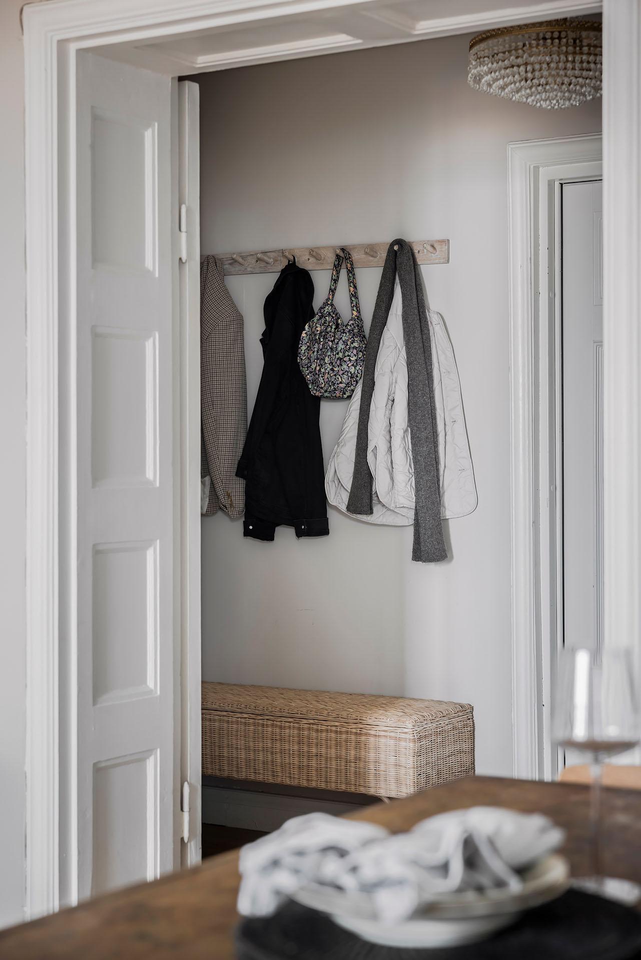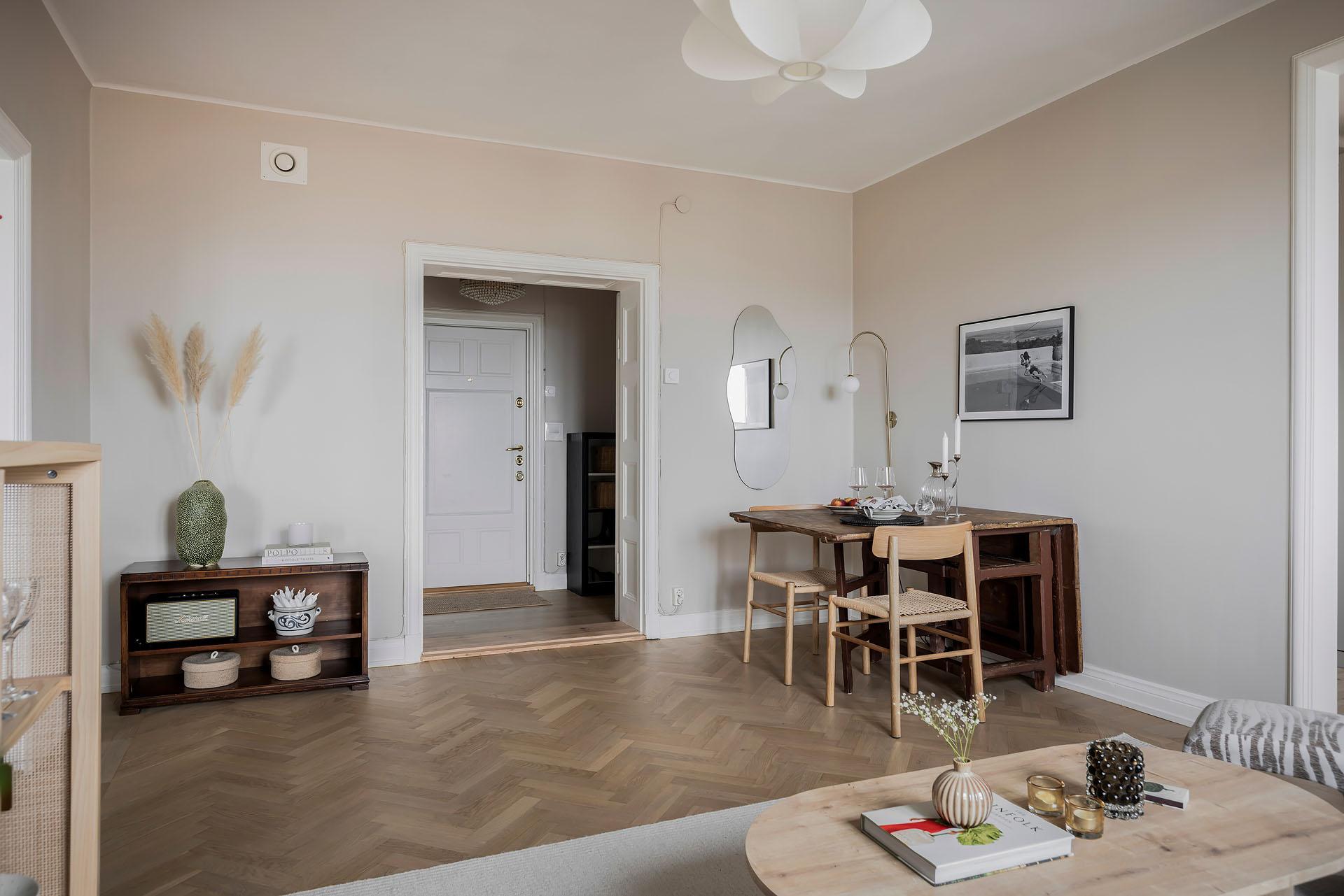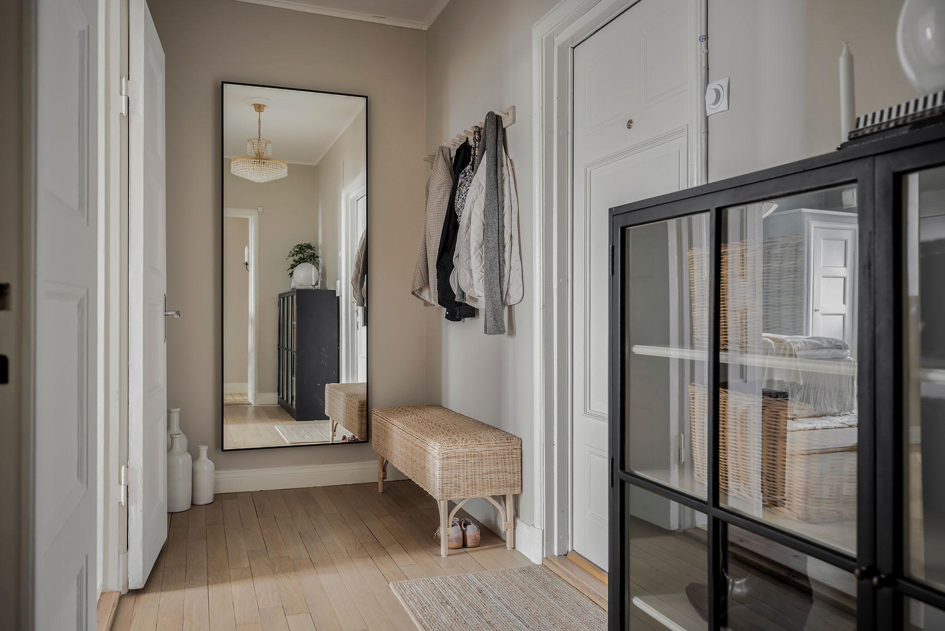 Hallen är välkomnande, och ståtliga parspegeldörrar öppnar mot vardagsrummet. Härifrån når man även köket och badrummet. Ytterjackorna hängs av på en fin kroklist till höger om den robusta ytterdörren, och det finns även gott om plats för skoställ, sittbänk och byrå. I entrén är golvet belagt med ljus originalparkett, och i hallens inre del är brädgolvet framtaget. Väggarna är målade i samma beige kulör som i vardagsrummet och köket.