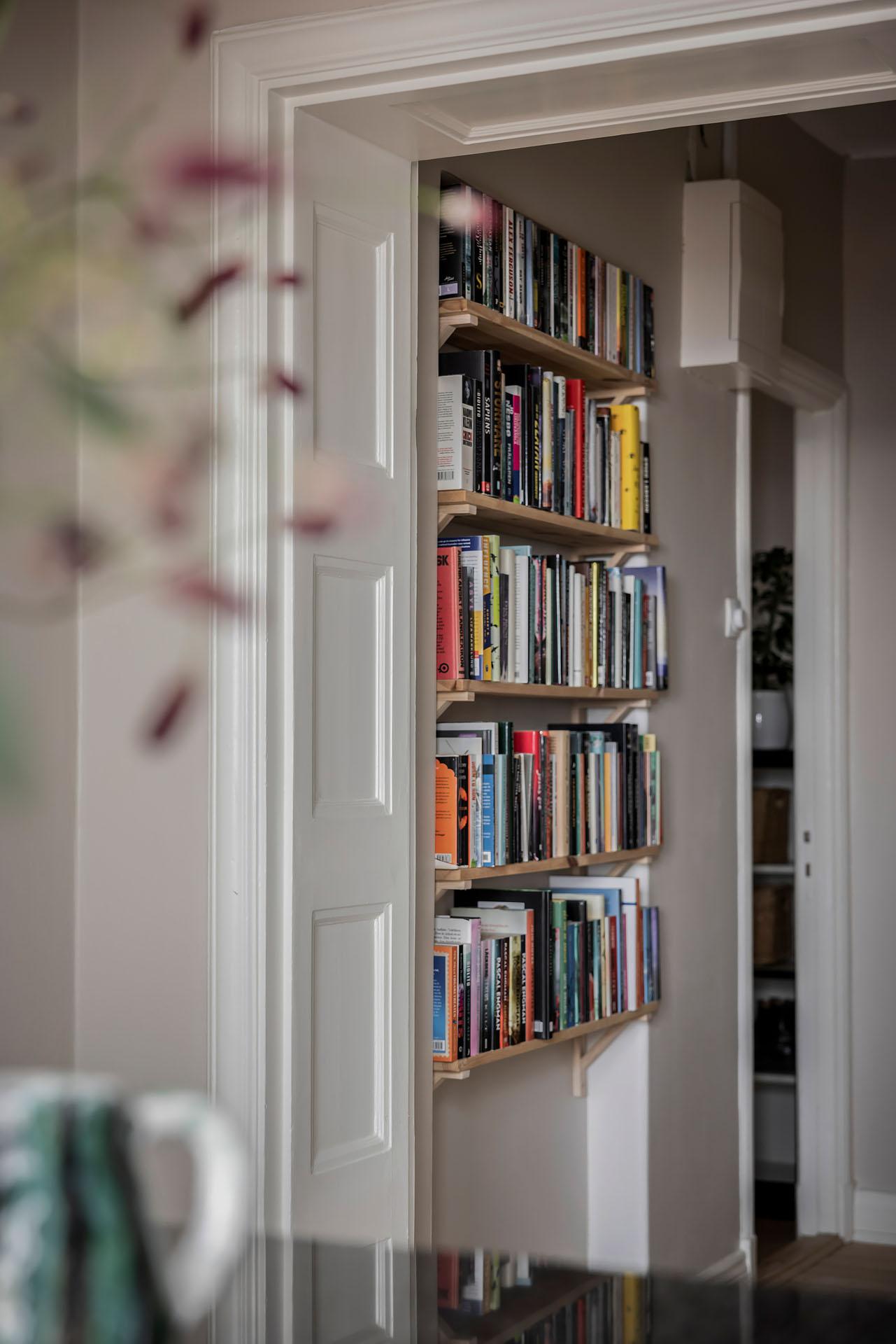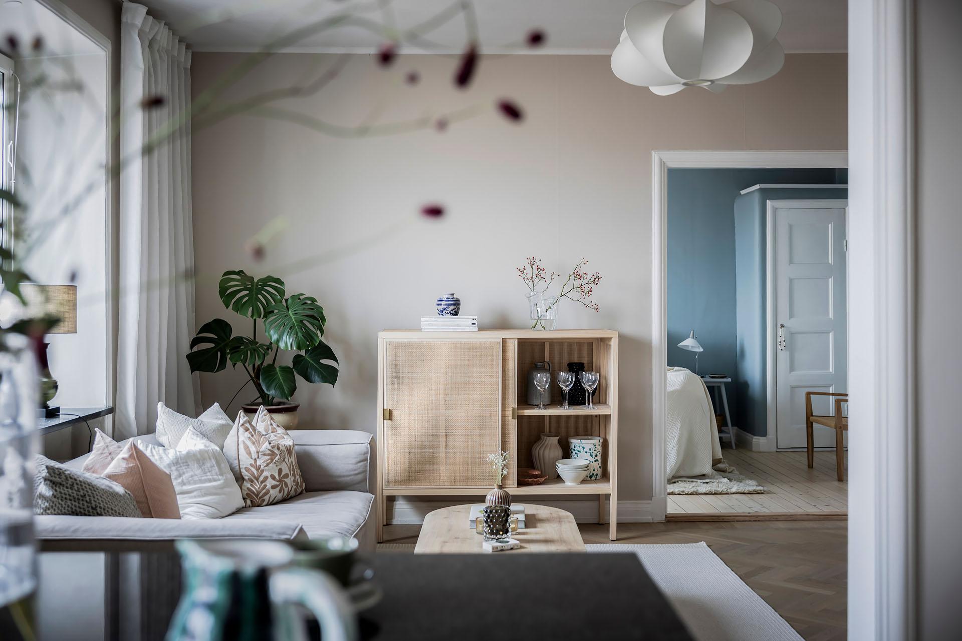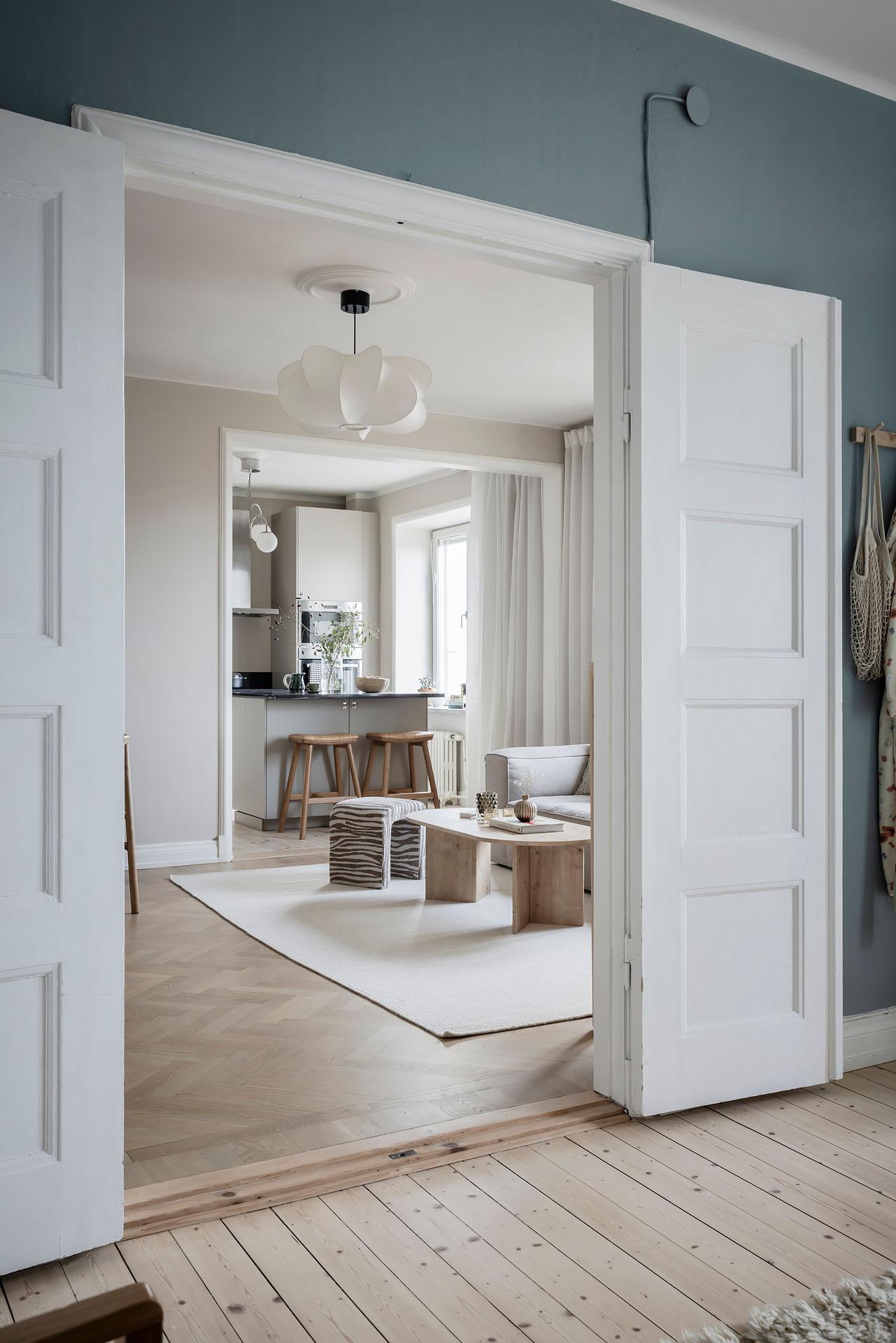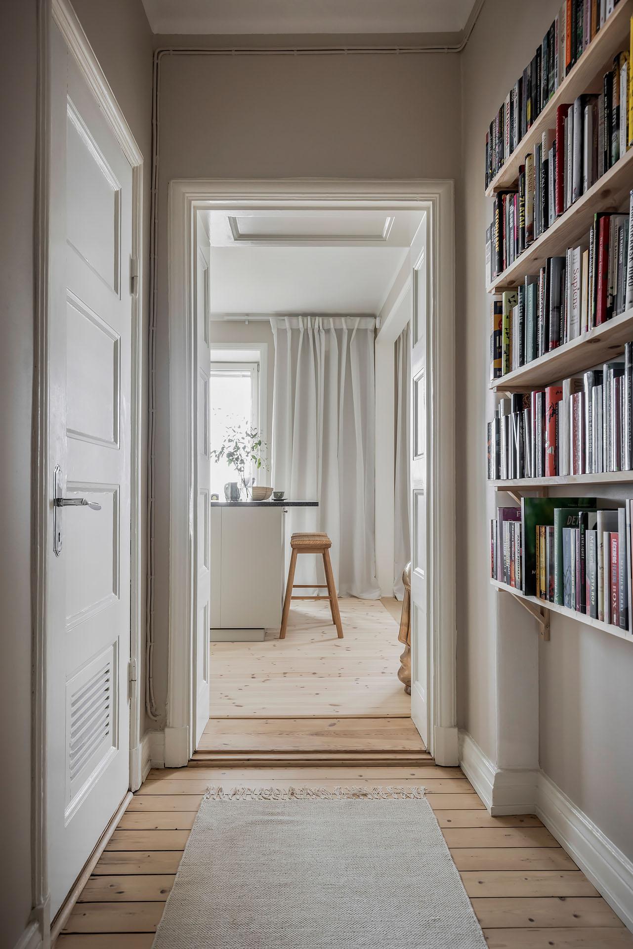 Hallen är välkomnande, och ståtliga parspegeldörrar öppnar mot vardagsrummet. Härifrån når man även köket och badrummet. Ytterjackorna hängs av på en fin kroklist till höger om den robusta ytterdörren, och det finns även gott om plats för skoställ, sittbänk och byrå. I entrén är golvet belagt med ljus originalparkett, och i hallens inre del är brädgolvet framtaget. Väggarna är målade i samma beige kulör som i vardagsrummet och köket.