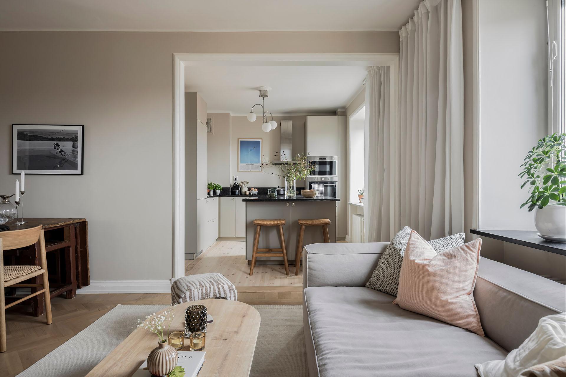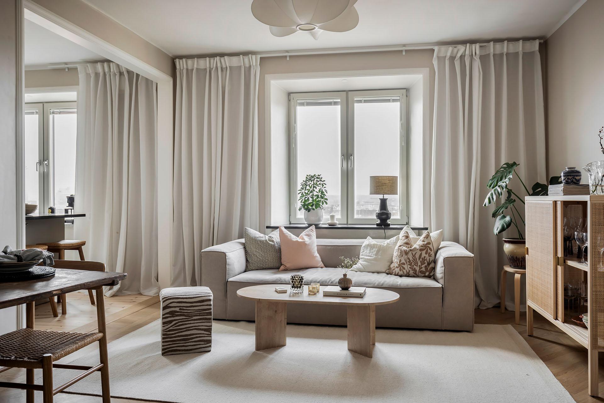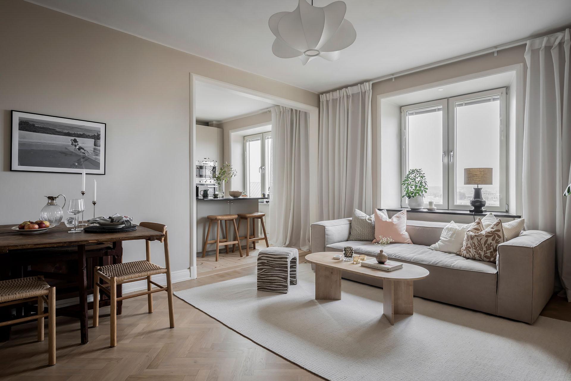 Två stora fönster i nordväst fyller vardagsrummet och köket med ljus. På somrarna strålar eftermiddags- och kvällssolen in. Vardagsrummet är rymligt och det finns gott om plats för både soffa och matgrupp. Golvet är belagt med fiskbensparkett och väggarna målade i Jotuns varma, mjuka beige kulör ”Linen”. Taket är besmyckat med en takrosett.