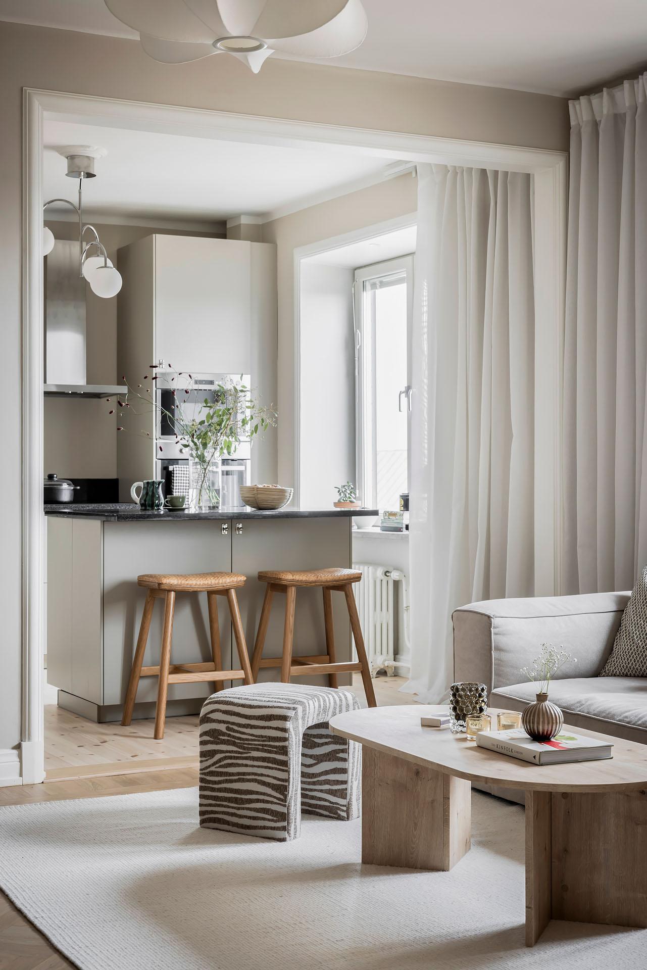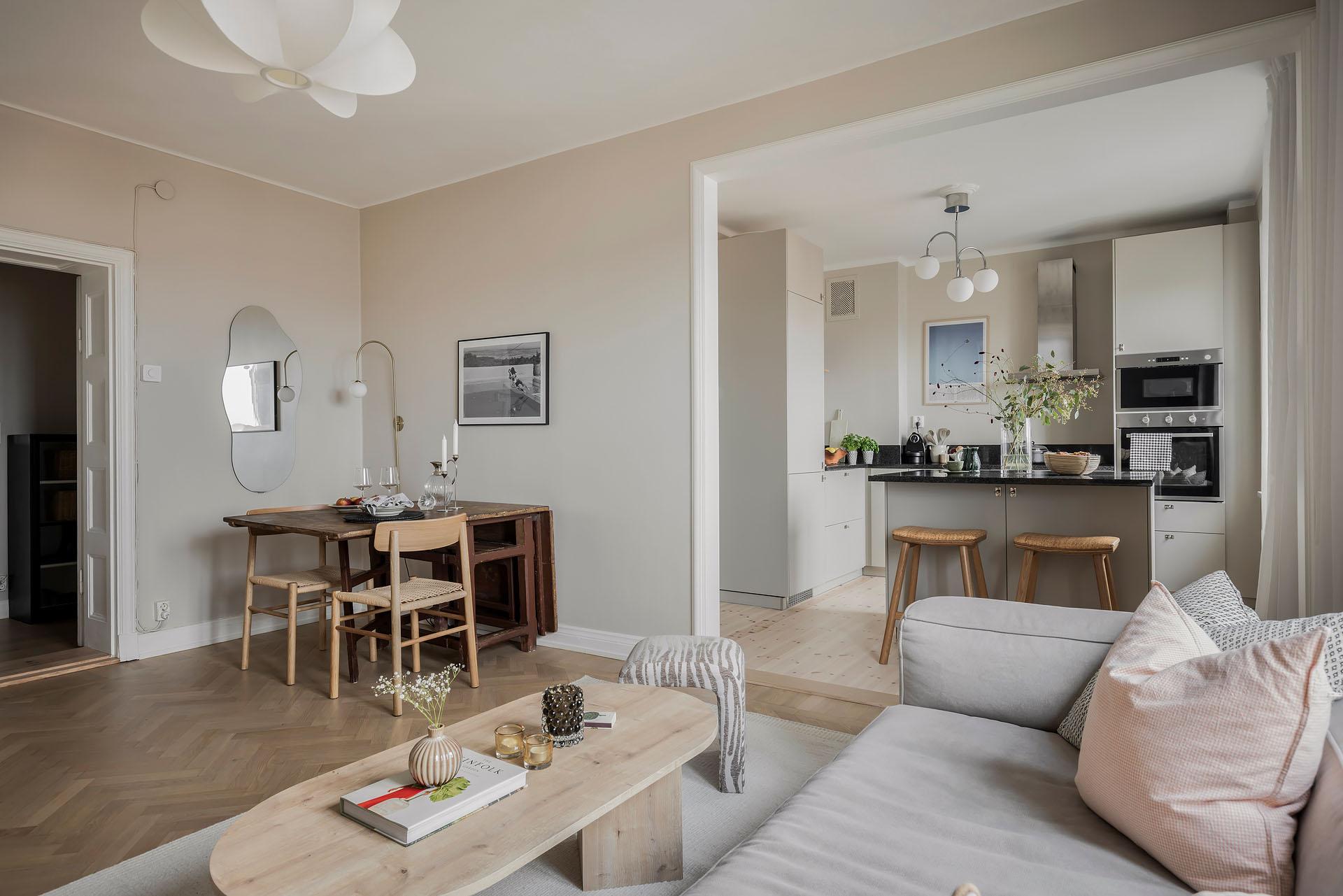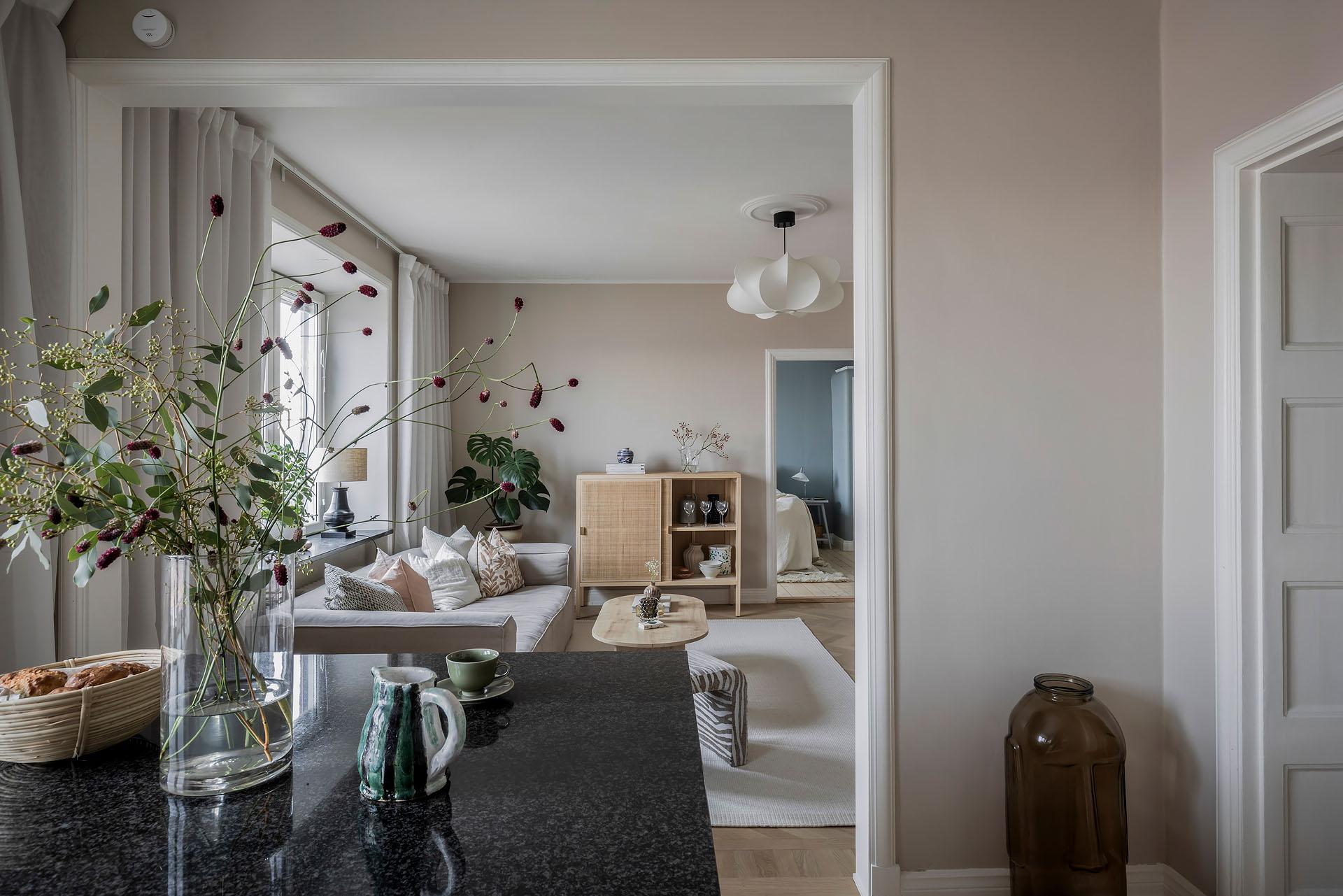 Två stora fönster i nordväst fyller vardagsrummet och köket med ljus. På somrarna strålar eftermiddags- och kvällssolen in. Vardagsrummet är rymligt och det finns gott om plats för både soffa och matgrupp. Golvet är belagt med fiskbensparkett och väggarna målade i Jotuns varma, mjuka beige kulör ”Linen”. Taket är besmyckat med en takrosett.