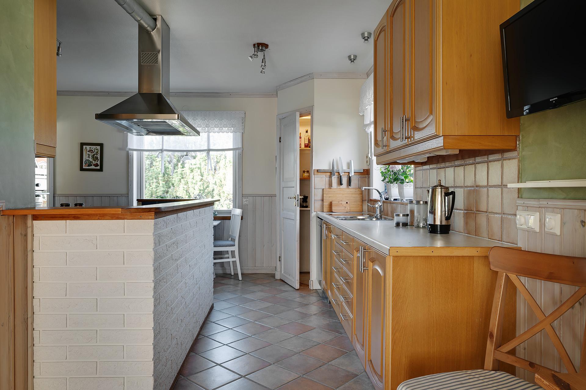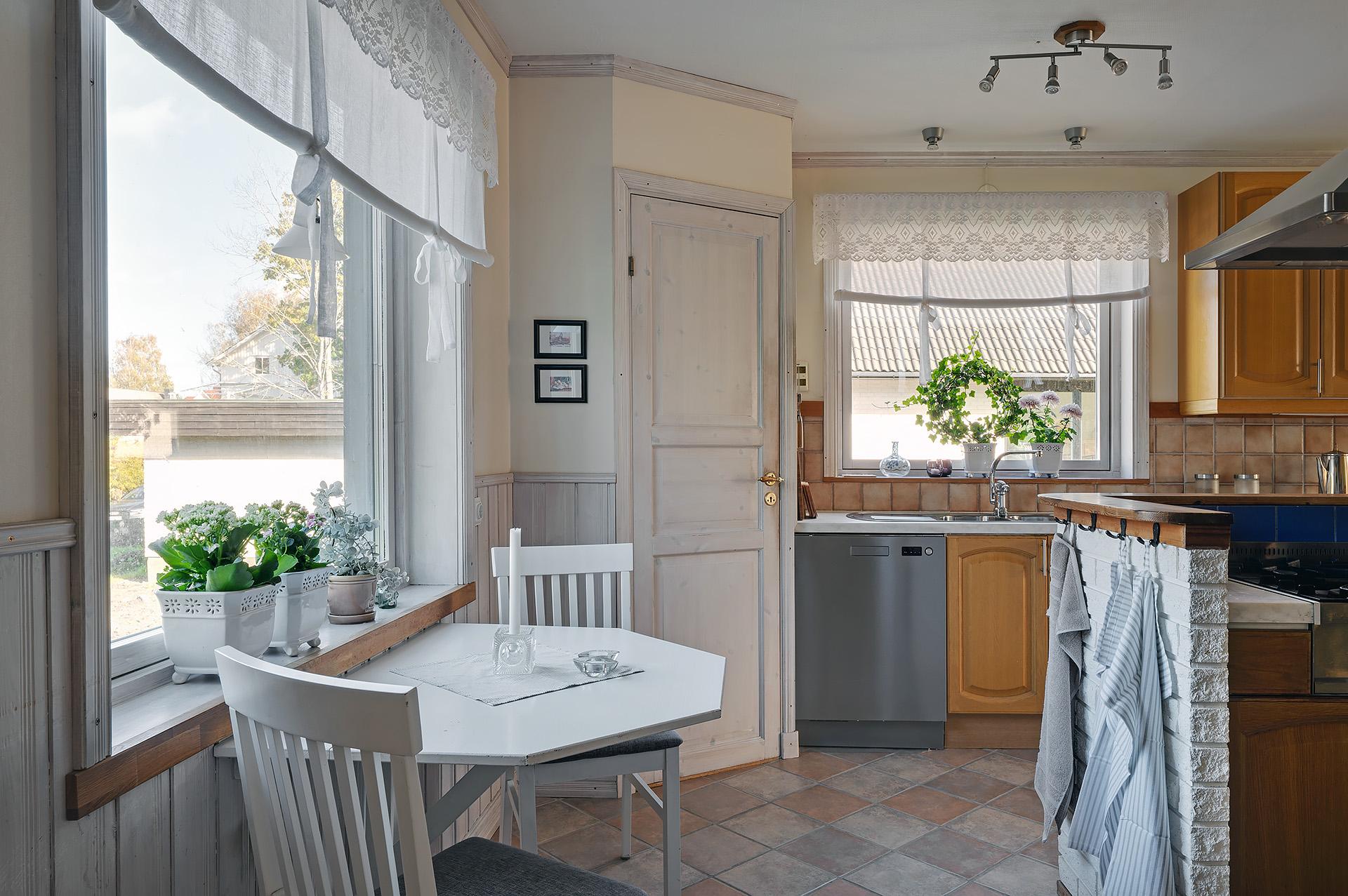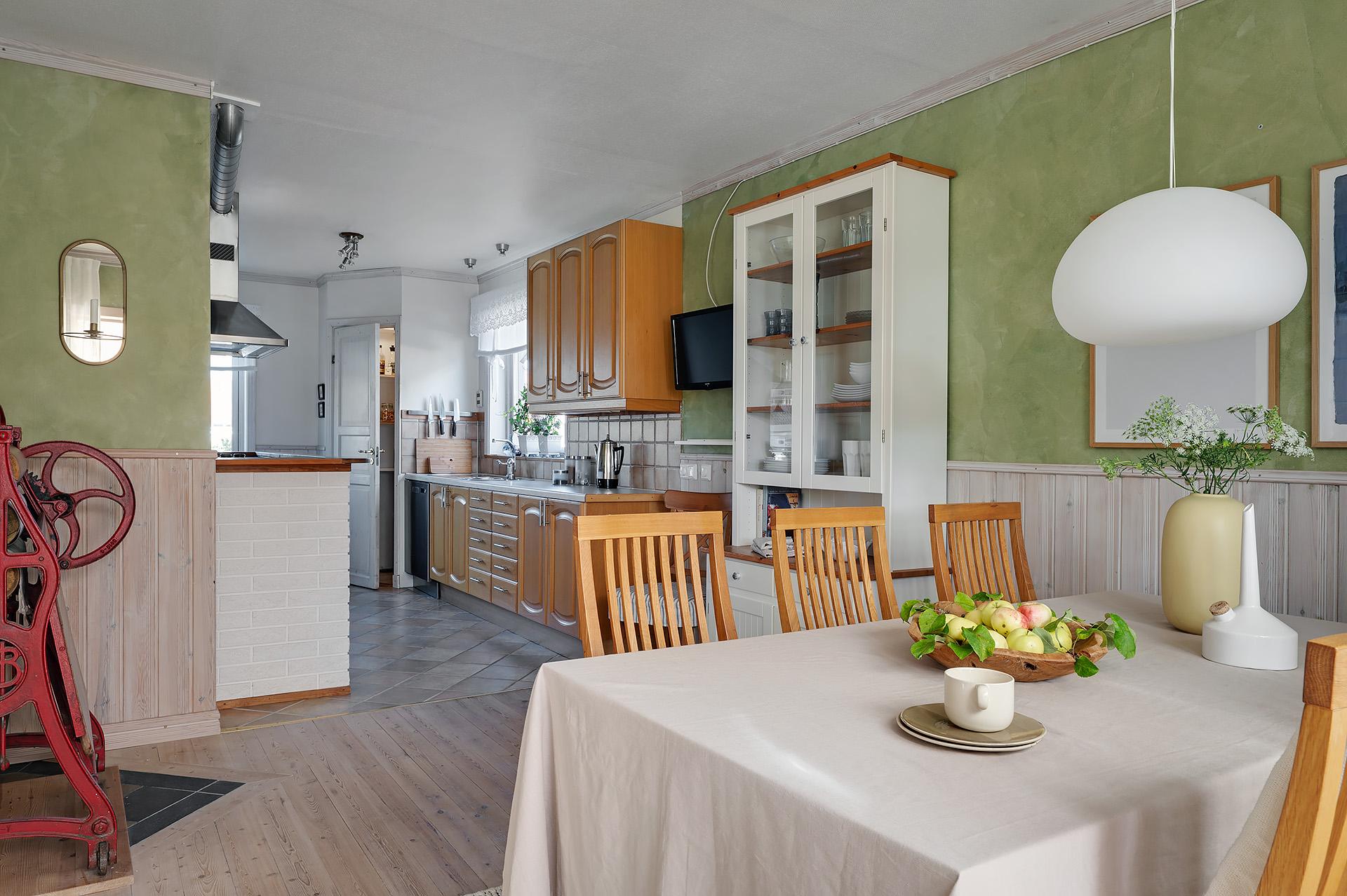 Köket har gott om svängrum för hemmakockarna, och tack vare öppningen mot matsalen kan matlagningen kombinera med umgänge. Det finns även gott om förvaring, och de vanliga köksskåpen kompletteras av ett inbyggt skafferi som man kan gå in i. En ny kyl/frys sattes in 2020, och 2022 uppdaterades köket med en ny diskmaskin. Den påkostade gasspisen med fem brännare från Ilve är från 2009. Väggarna är ljusmålade och klädda med ljusgrå bröstpanel. Golvet är belagt med ljus klinker med golvvärme.