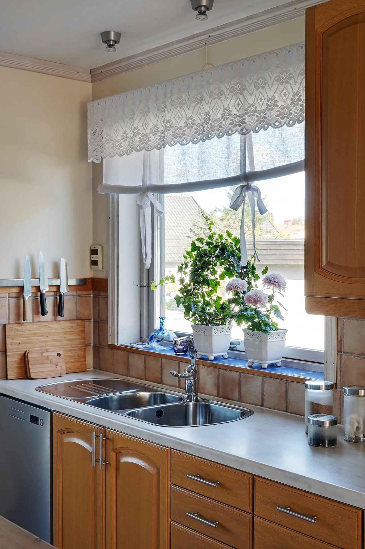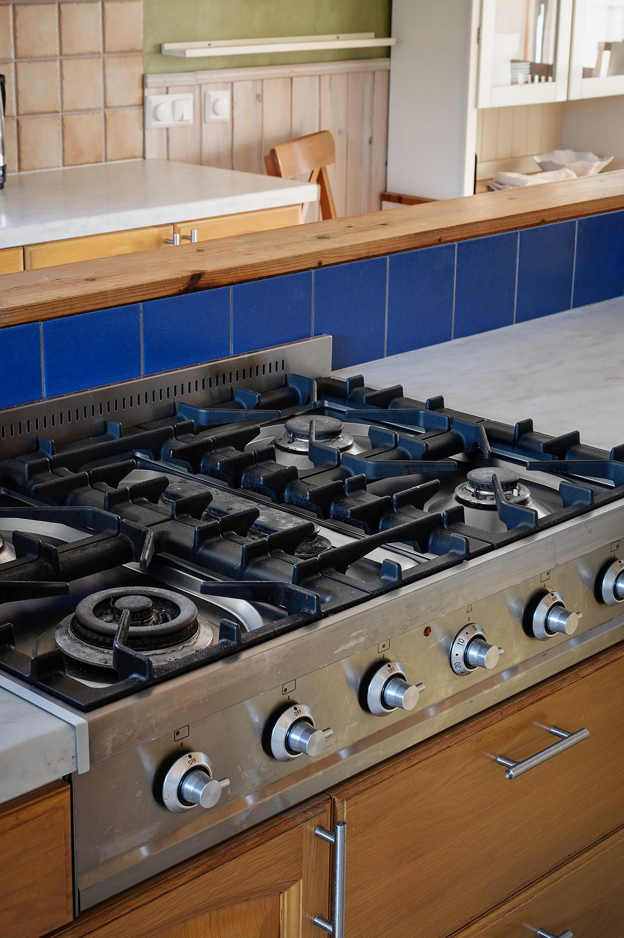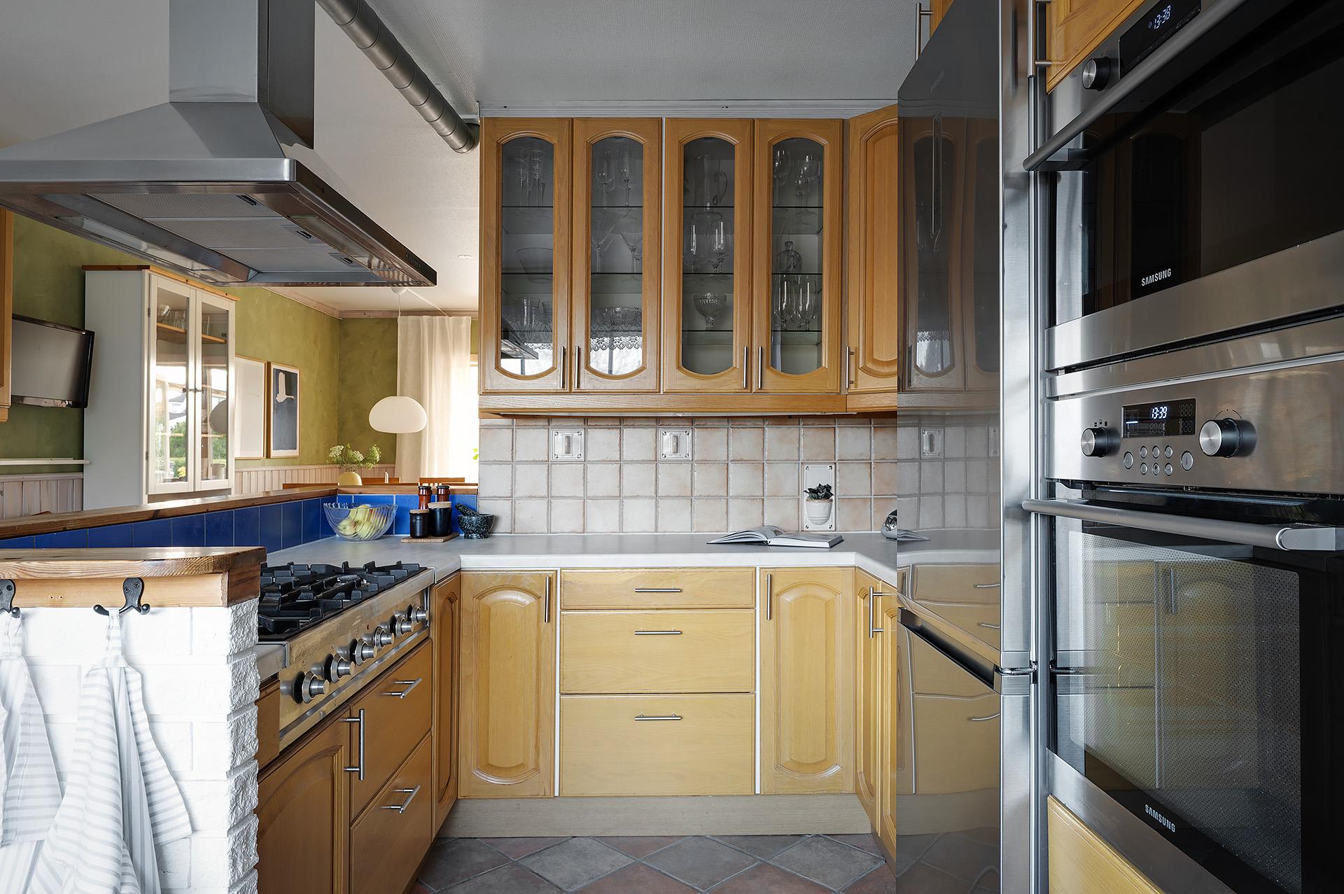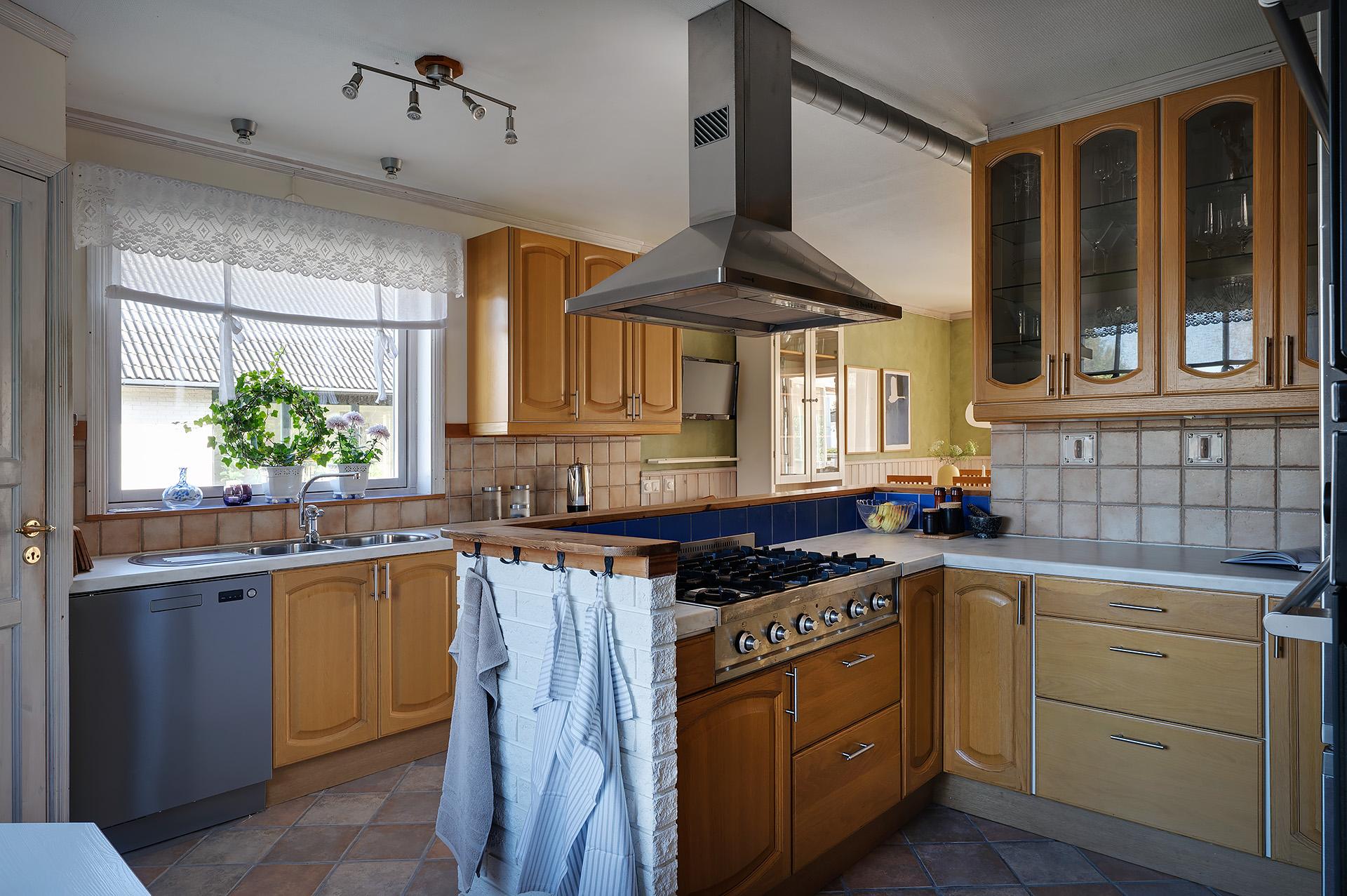 Köket har gott om svängrum för hemmakockarna, och tack vare öppningen mot matsalen kan matlagningen kombinera med umgänge. Det finns även gott om förvaring, och de vanliga köksskåpen kompletteras av ett inbyggt skafferi som man kan gå in i. En ny kyl/frys sattes in 2020, och 2022 uppdaterades köket med en ny diskmaskin. Den påkostade gasspisen med fem brännare från Ilve är från 2009. Väggarna är ljusmålade och klädda med ljusgrå bröstpanel. Golvet är belagt med ljus klinker med golvvärme.