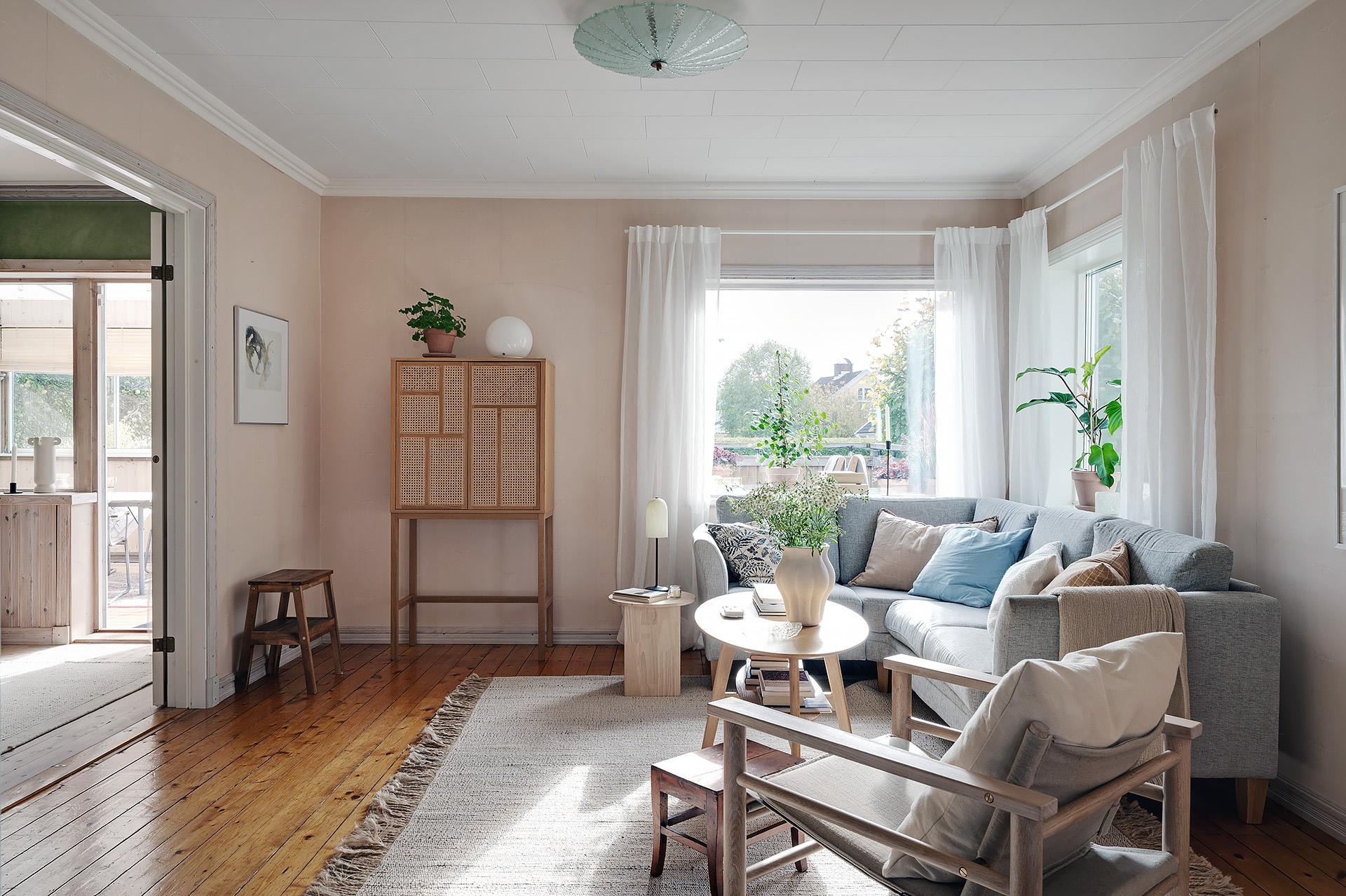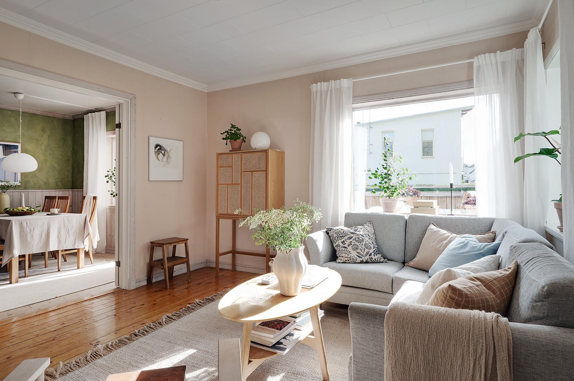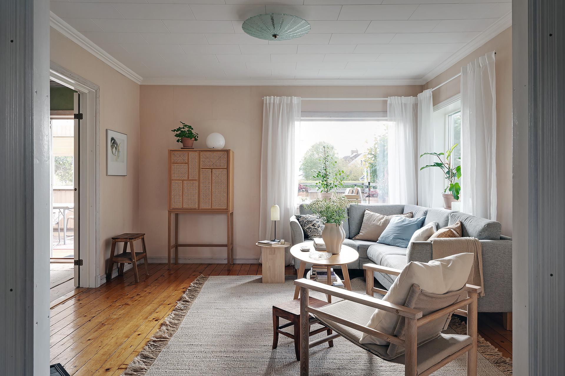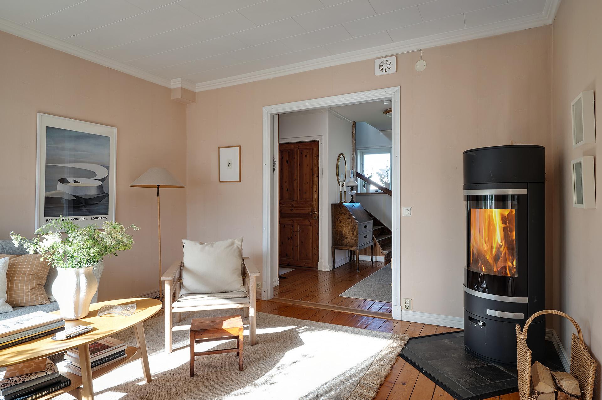 Hörnplacerade fönster i sydväst och sydost fyller vardagsrummet med ljus. I ett annat hörn sprider en braskamin värme och mysig stämning. Rummet är lättmöblerat, och man får plats med en stor soffgrupp utan att den luftiga känslan går förlorad. Det framtagna brädgolvet är lackat och väggarna målade i beige.