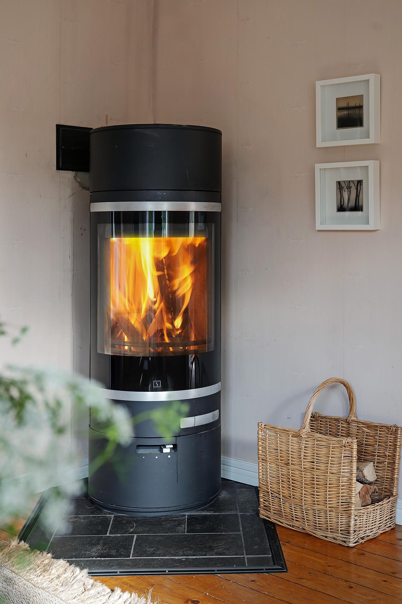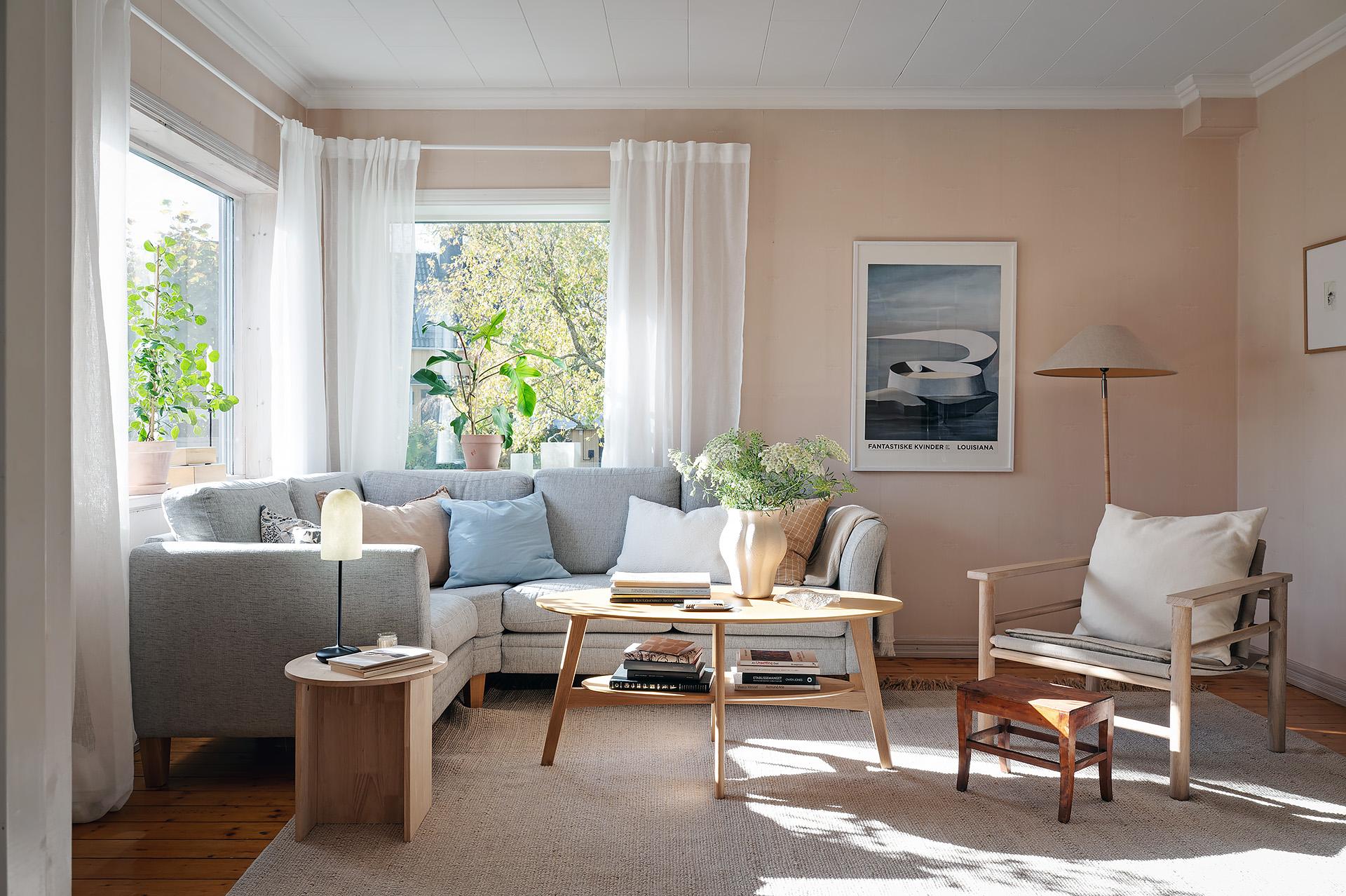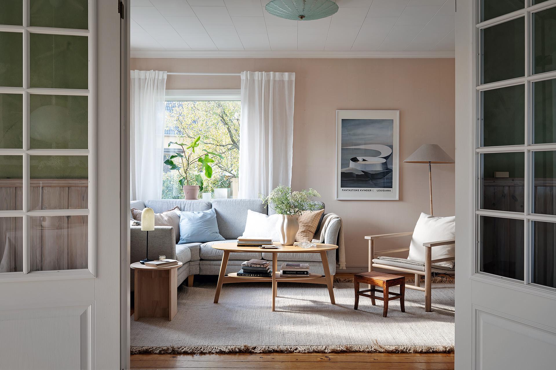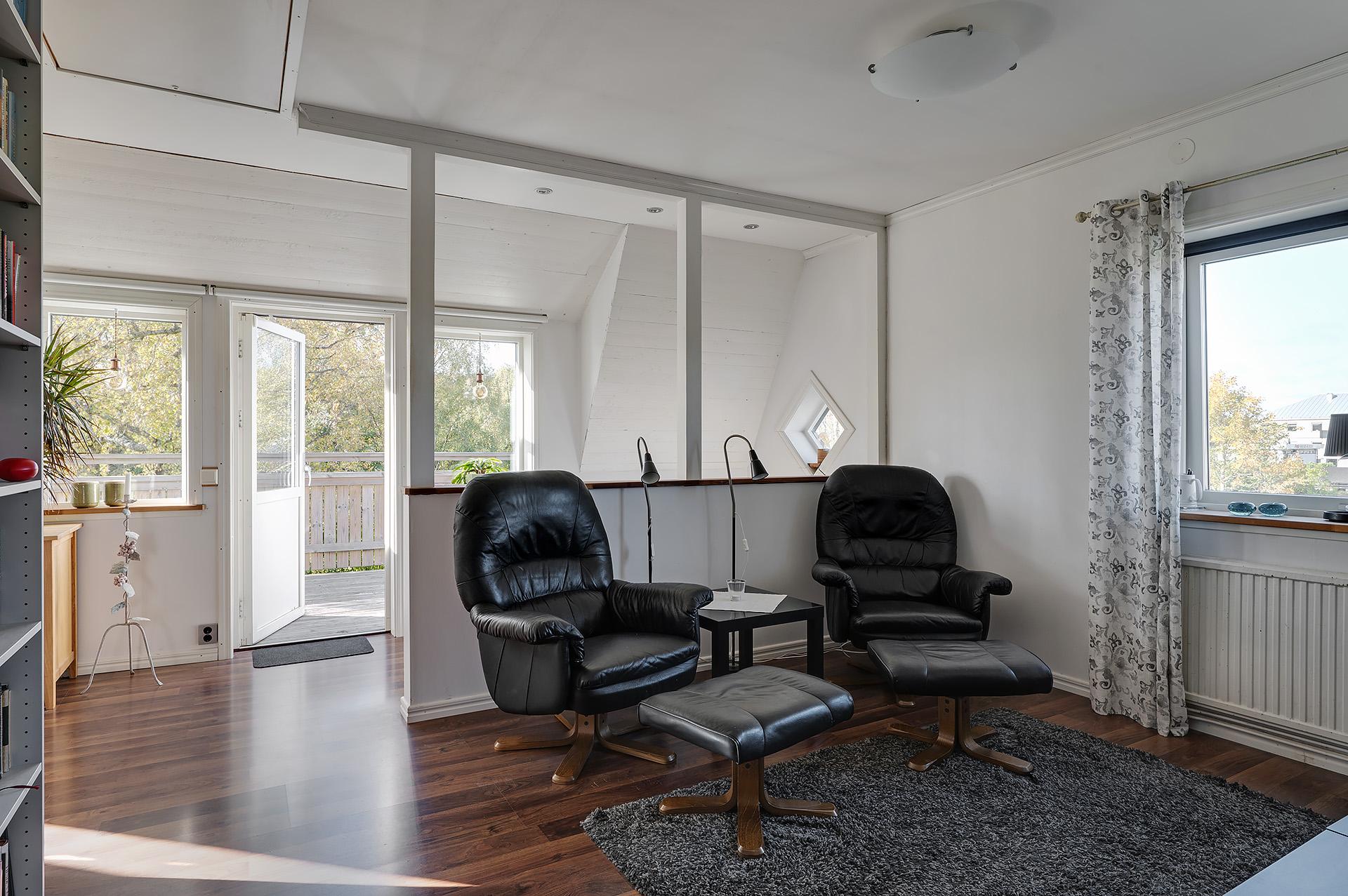 Hörnplacerade fönster i sydväst och sydost fyller vardagsrummet med ljus. I ett annat hörn sprider en braskamin värme och mysig stämning. Rummet är lättmöblerat, och man får plats med en stor soffgrupp utan att den luftiga känslan går förlorad. Det framtagna brädgolvet är lackat och väggarna målade i beige.