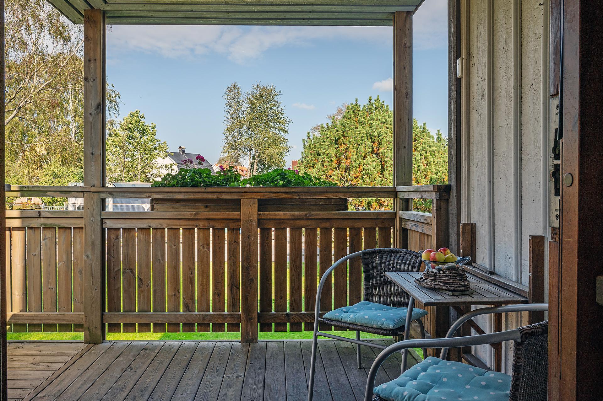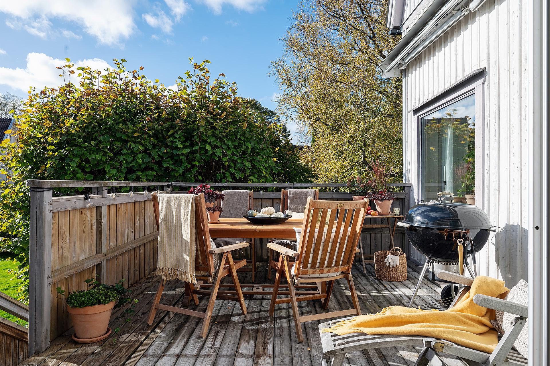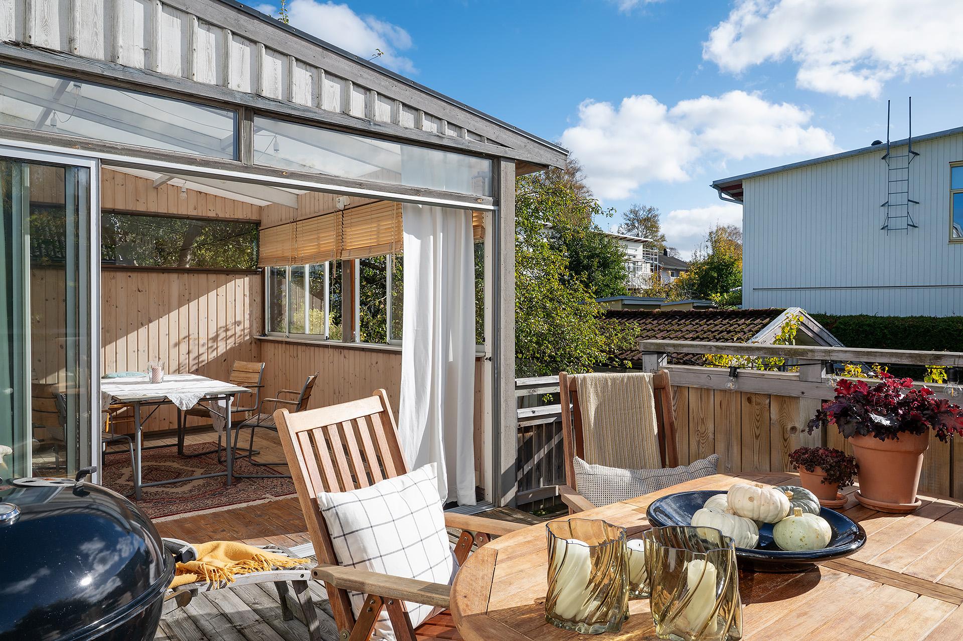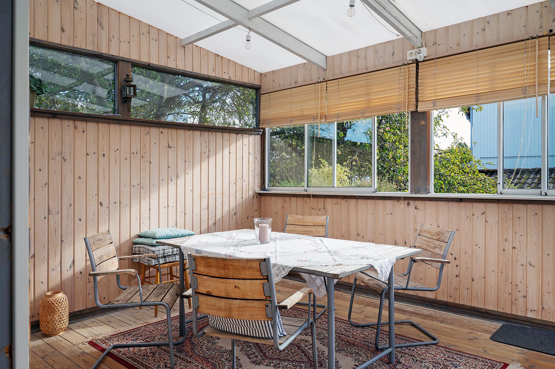 I anslutning till matsalen finns ett uterum med utgång till husets stora altan. De är härliga förlängningar av husets sällskapsytor, och det finns gott om utrymme för att duka upp till midsommarfiranden, kräftskivor och dylikt.